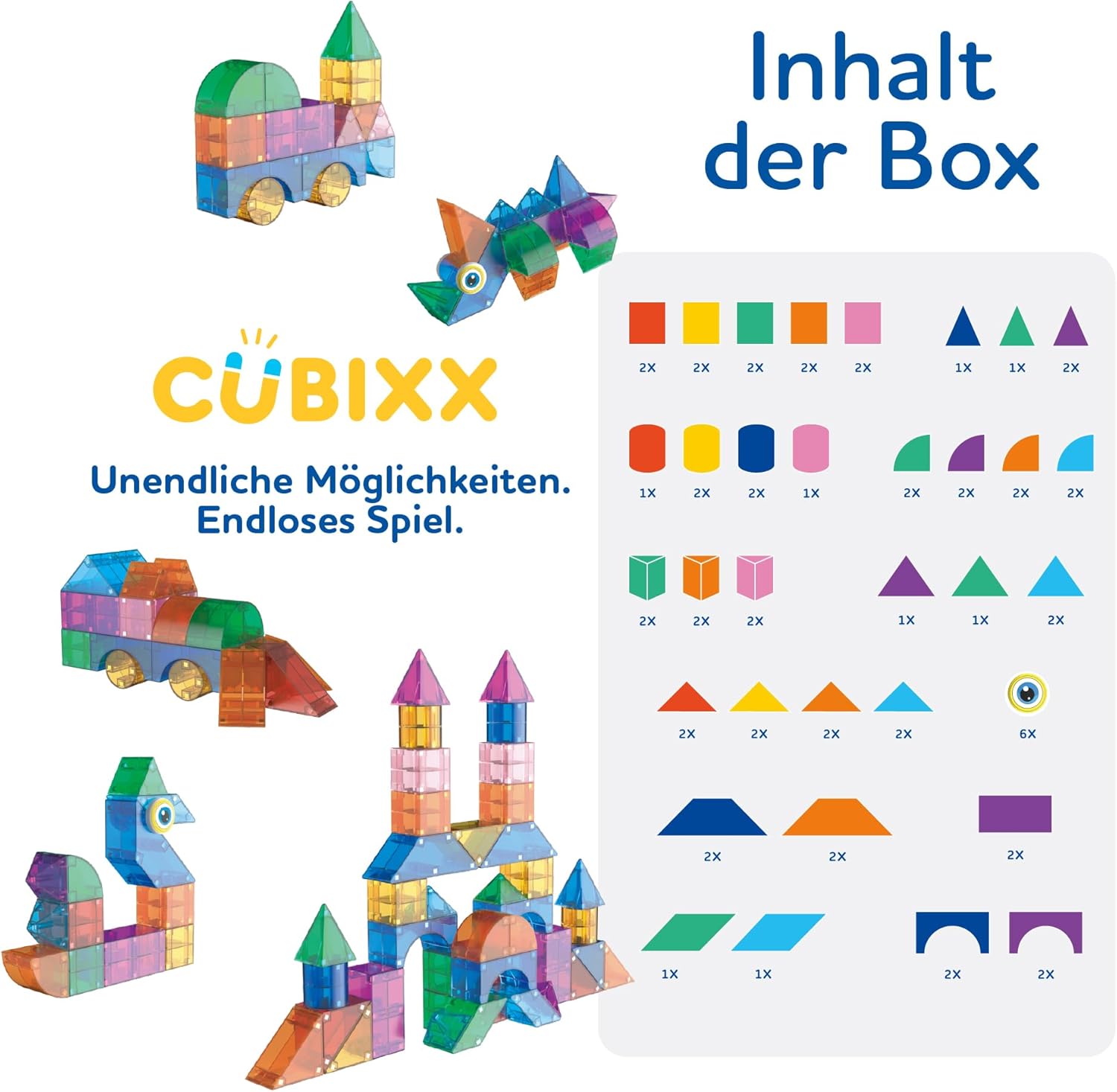 Ti piace costruire con i blocchi? Allora amerai Cubixx Perché con i blocchi Cubixx puoi costruire la tua ferrovia, mulino a vento, ecc. o creare meravigliose costruzioni alla tua immaginazione! GIOCO DI APPRENDIMENTO: un'auto, un cigno o un lucchetto, i mattoncini magnetici di Cubixx promuovono la creatività e le capacità motorie del tuo bambino. Un vero divertimento per bambini e bambine a partire dai 3 anni in su, senza limiti. Costruisci e gioca: questo set contiene 64 pezzi magnetici per costruire personaggi fantastici e realistici. Dopo la costruzione, il divertimento continua con ore di gioco fantasioso! Forte e sicuro: i blocchi magnetici sono realizzati in plastica atossica di alta qualità e facili da pulire. Basta pulirli con un panno umido e il bambino può giocare in modo sicuro e igienico. Idea regalo: questo giocattolo è il regalo perfetto per Natale o compleanni. Il set è espandibile con altri set Cubixx e offre infinite possibilità per il gioco creativo.