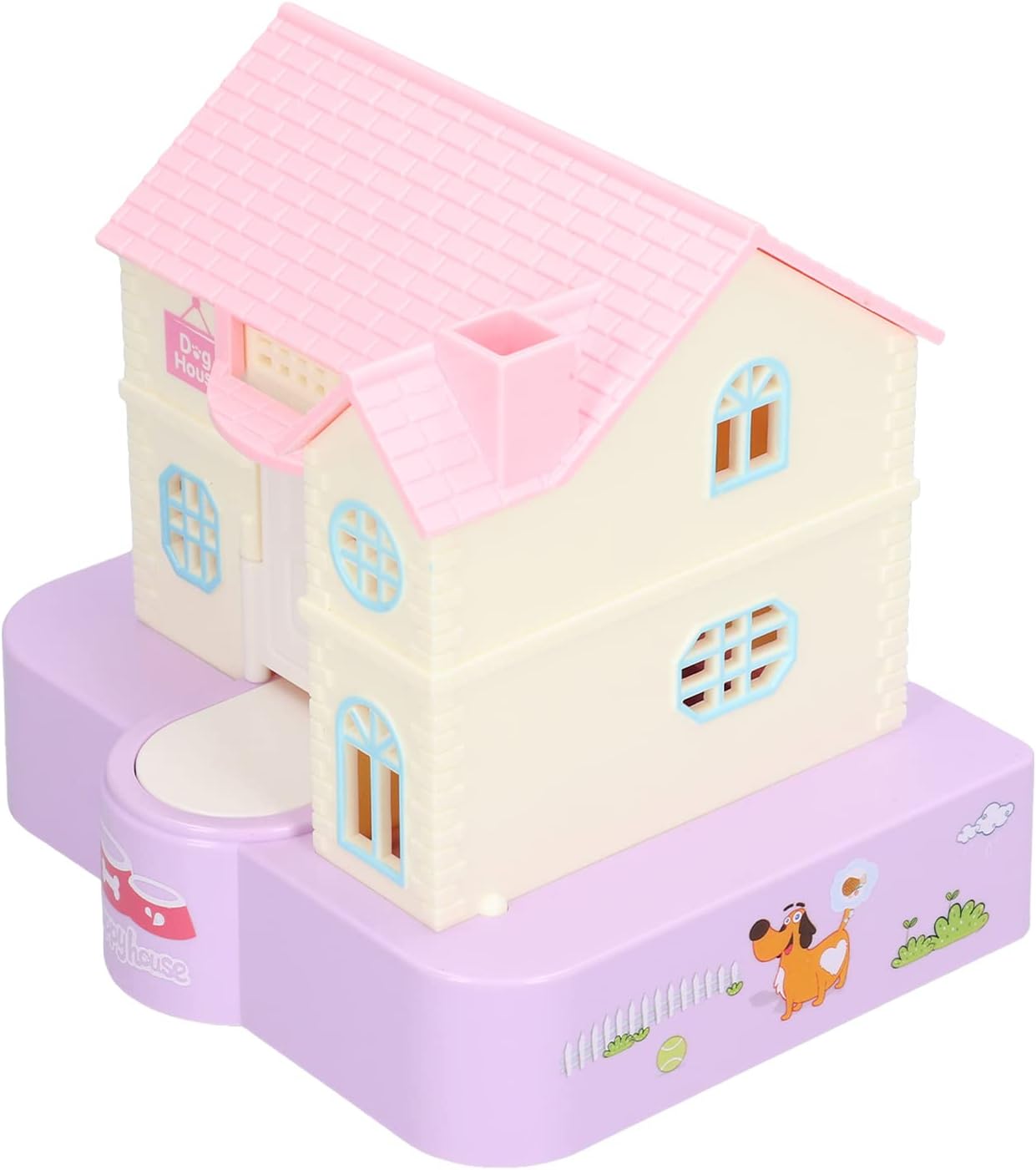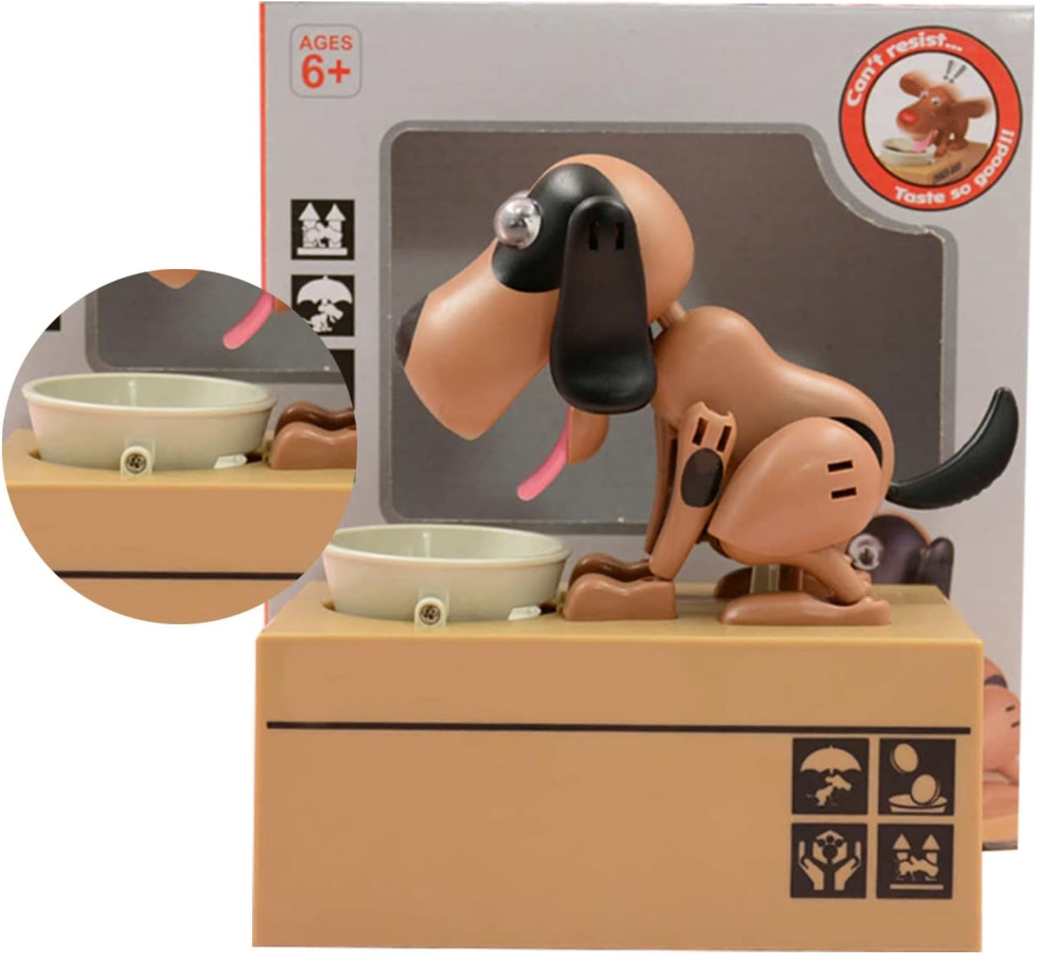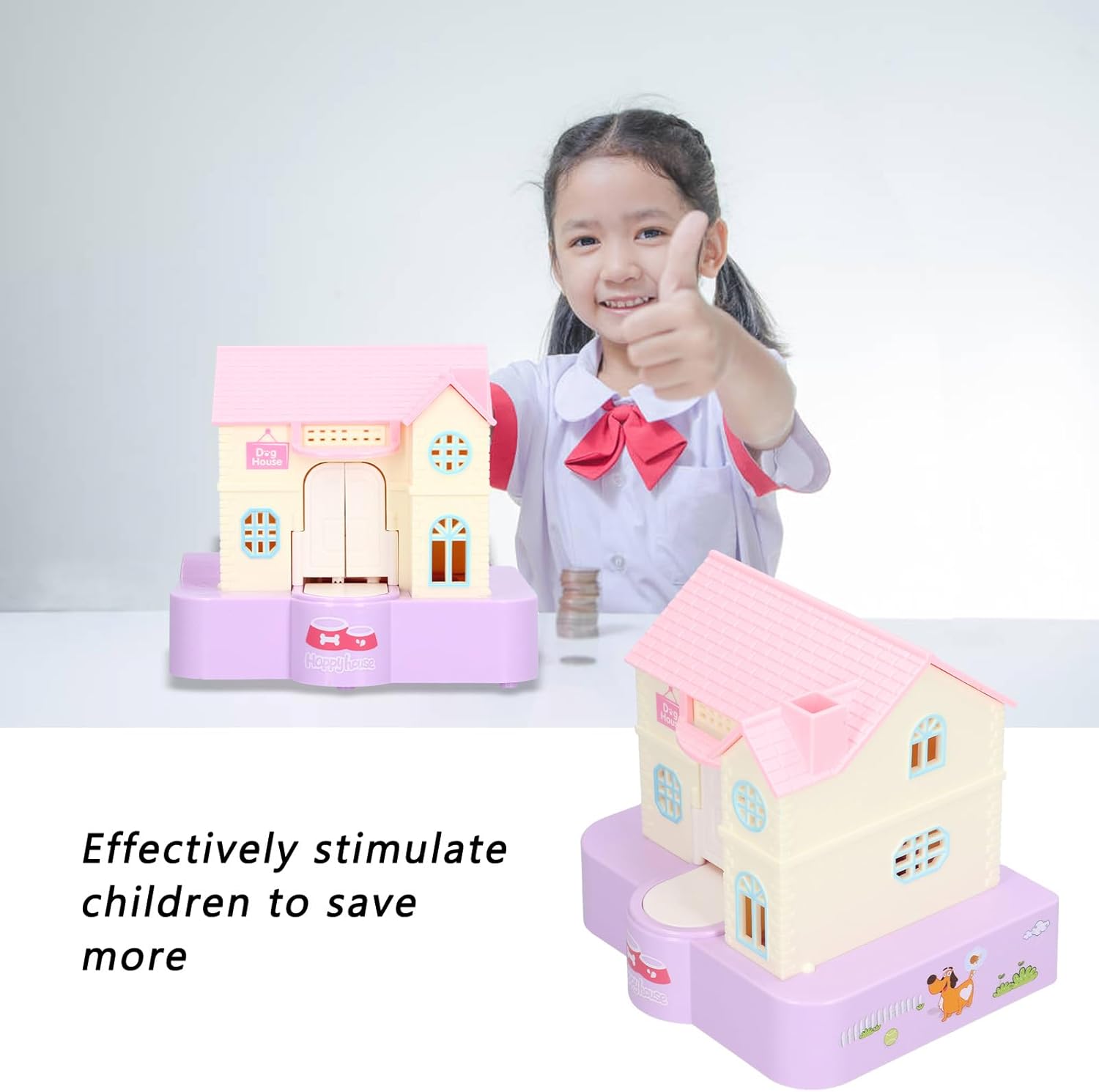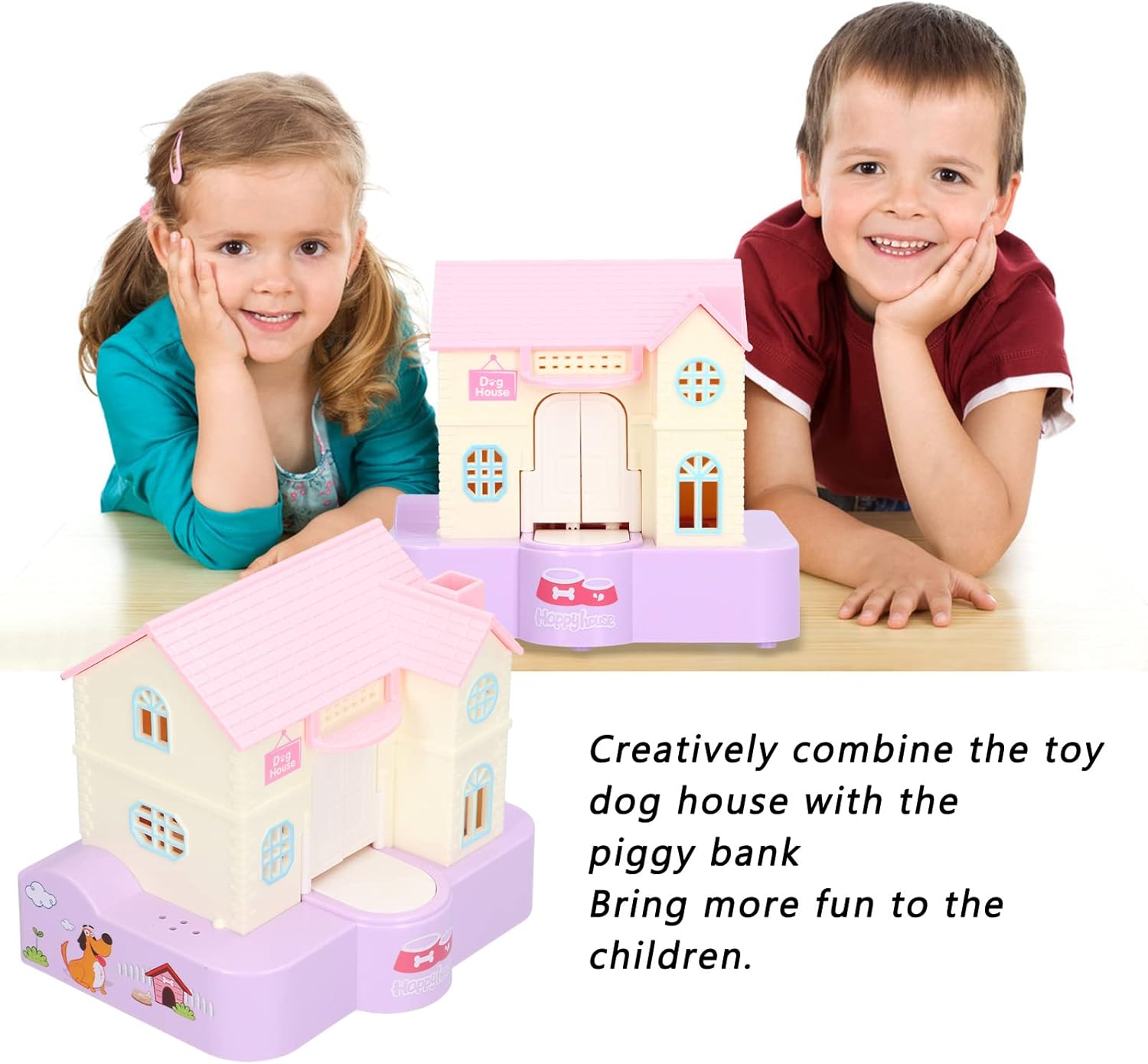 Salvadanaio a forma di cane: un simpatico cucciolo è seduto in una lussuosa cuccia, la cui porta si apre solo quando si posiziona una moneta davanti.La caratteristica più interessante di questo giocattolo è che, aprendo la porta, il cucciolo porterà subito la moneta a casa. Bellissimo aspetto: il salvadanaio di questo cucciolo è completamente diverso dal tradizionale salvadanaio che abbiamo visto prima.Combina in modo creativo la cuccia giocattolo per cani con il salvadanaio per portare più divertimento ai bambini. Buona gestione finanziaria: con questo bellissimo salvadanaio a forma di cucciolo, puoi aiutare i bambini a sviluppare un buon concetto di gestione finanziaria.Un articolo indispensabile per i bambini o un , ti aiuterà notevolmente a sviluppare la buona abitudine di risparmiare denaro. Effetti musicali leggeri: le luci si accendono automaticamente e quando si apre la porta è possibile ascoltare l'abbaiare e gli effetti musicali interessanti;queste funzioni possono stimolare efficacemente i bambini a risparmiare più monete. Idea interessante: inserire le batterie AA (non incluse), quindi accendere l'interruttore di alimentazione.Metti la moneta davanti alla porta e premi la moneta.Quando premi la moneta, la porta si aprirà automaticamente e il cane uscirà rapidamente e porterà la moneta a casa.