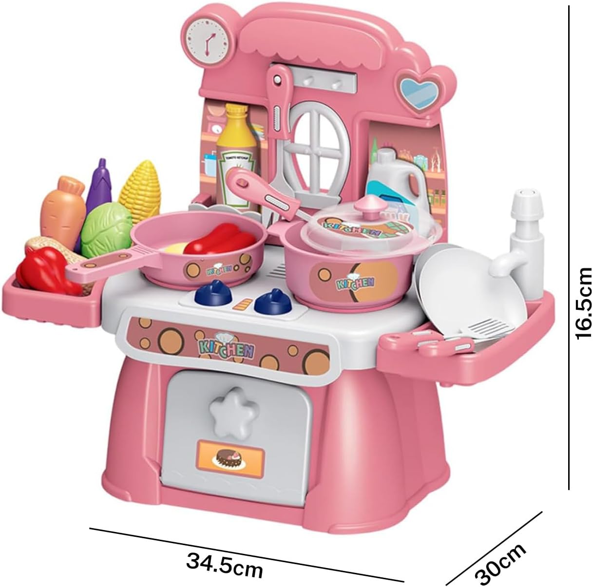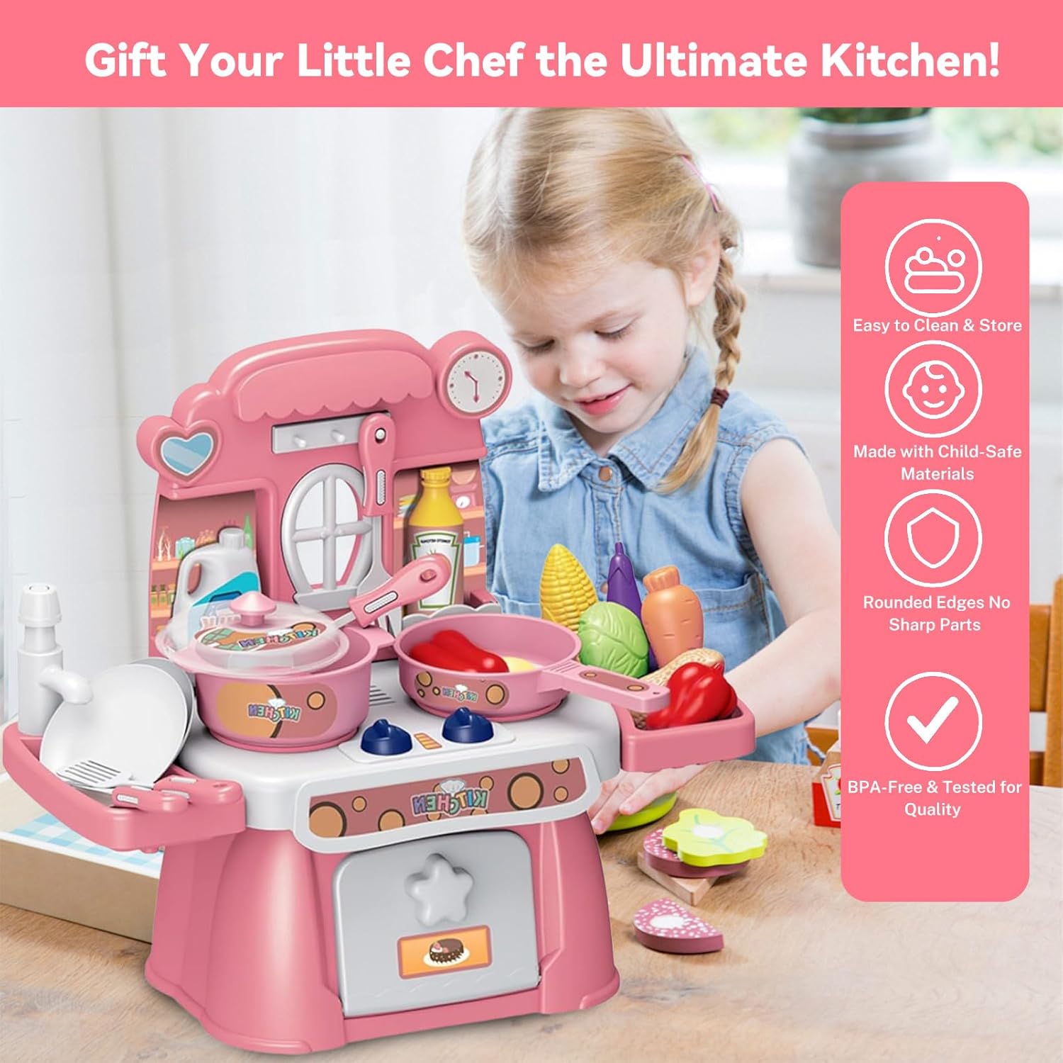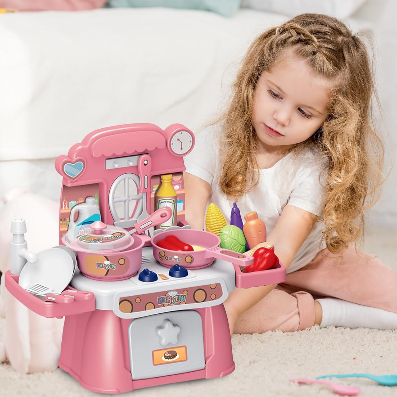 Effetti luminosi e sonori immersivi – Dotato di suoni realistici e luci LED morbide, questo gioco da cucina trasforma il gioco in un'esperienza vicina alla vera cucina. I bambini saranno trasportati nel proprio universo culinario, dove ogni azione risuona come nella vita reale. Set completo di 24 pezzi per le avventure culinarie: da piccole pentole e padelle a utensili (cucchiai, spatole) a cibi giocattoli (verdure, carni), questo set contiene tutto il necessario per giochi di ruolo ricchi e vari. I bambini saranno in grado di preparare, cucinare e servire pasti immaginari, hour dopo hour. Funzione acqua divertente e sicura: grazie al suo sistema di pompa dell'acqua dolce, i piccoli chef possono "lavare" i piatti o "riempire" le pentole d'acqua, come quelle grandi. Progettato per evitare schizzi eccessivi, questa funzione aggiunge un tocco di autenticità senza il fastidio della pulizia. Sviluppo delle abilità a tutte le età – Appositamente progettato per bambini dai 3 anni in su, questo gioco favorisce le capacità motorie fini (tenendo gli utensili, organizzando gli alimenti) e stimola la creatività (inventare ricette, giocare i chef). È un ottimo strumento per il loro sviluppo mentre si diverte. Pronto all'uso per le feste – viene fornito con 3 batterie AA incluse, basta disimballare e iniziare a giocare! Ideale come regalo di compleanno, Natale o qualsiasi altra occasione, delizierà i piccoli amanti della cucina e regalerà loro momenti di gioco indimenticabili.