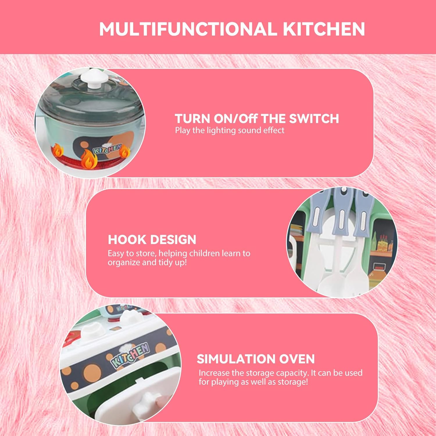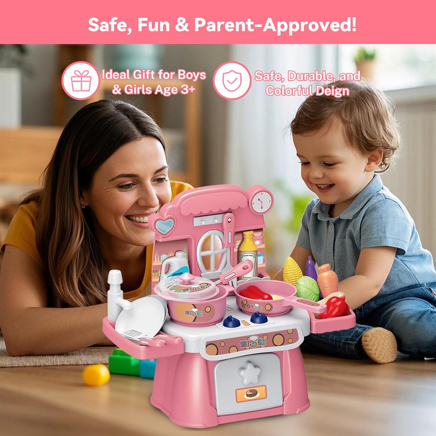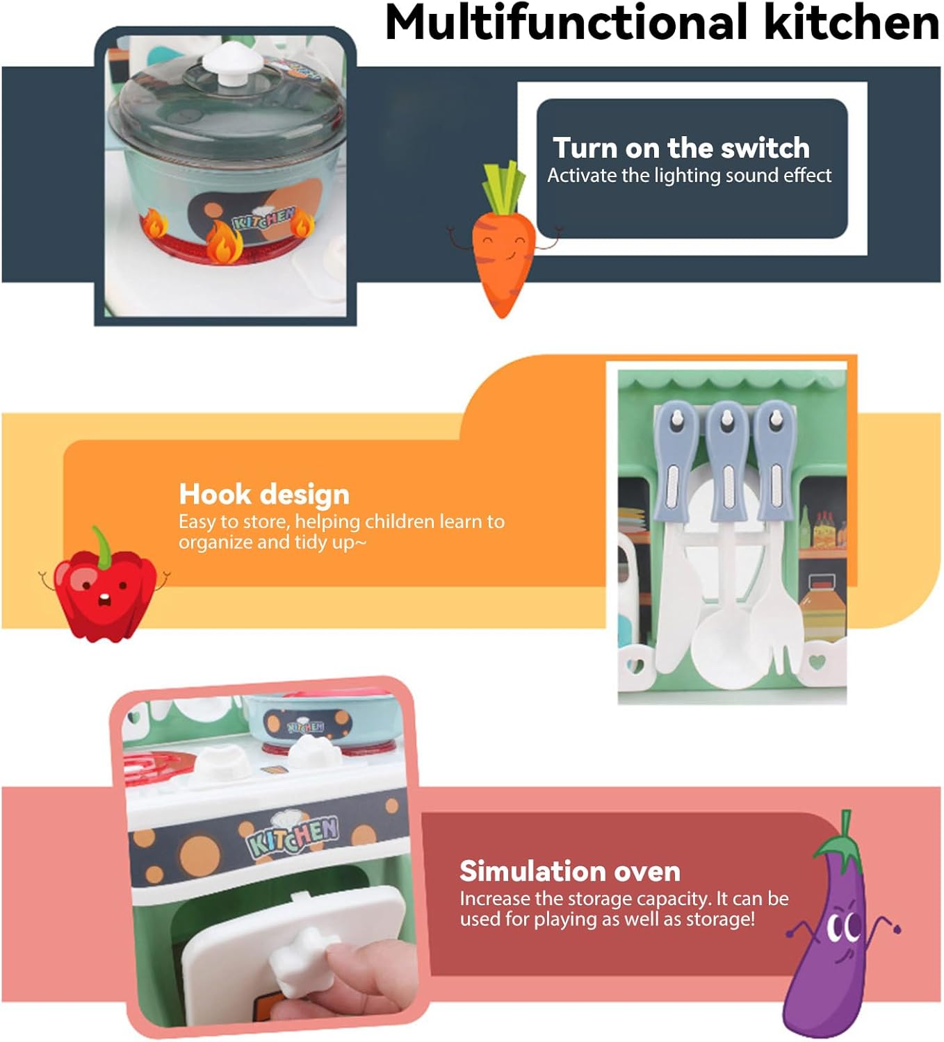Effetti luminosi e sonori immersivi – Dotato di suoni realistici e luci LED morbide, questo gioco da cucina trasforma il gioco in un'esperienza vicina alla vera cucina. I bambini saranno trasportati nel proprio universo culinario, dove ogni azione risuona come nella vita reale. Set completo di 24 pezzi per le avventure culinarie: da piccole pentole e padelle a utensili (cucchiai, spatole) a cibi giocattoli (verdure, carni), questo set contiene tutto il necessario per giochi di ruolo ricchi e vari. I bambini saranno in grado di preparare, cucinare e servire pasti immaginari, hour dopo hour. Funzione acqua divertente e sicura: grazie al suo sistema di pompa dell'acqua dolce, i piccoli chef possono "lavare" i piatti o "riempire" le pentole d'acqua, come quelle grandi. Progettato per evitare schizzi eccessivi, questa funzione aggiunge un tocco di autenticità senza il fastidio della pulizia. Sviluppo delle abilità a tutte le età – Appositamente progettato per bambini dai 3 anni in su, questo gioco favorisce le capacità motorie fini (tenendo gli utensili, organizzando gli alimenti) e stimola la creatività (inventare ricette, giocare i chef). È un ottimo strumento per il loro sviluppo mentre si diverte. Pronto all'uso per le feste – viene fornito con 3 batterie AA incluse, basta disimballare e iniziare a giocare! Ideale come regalo di compleanno, Natale o qualsiasi altra occasione, delizierà i piccoli amanti della cucina e regalerà loro momenti di gioco indimenticabili.