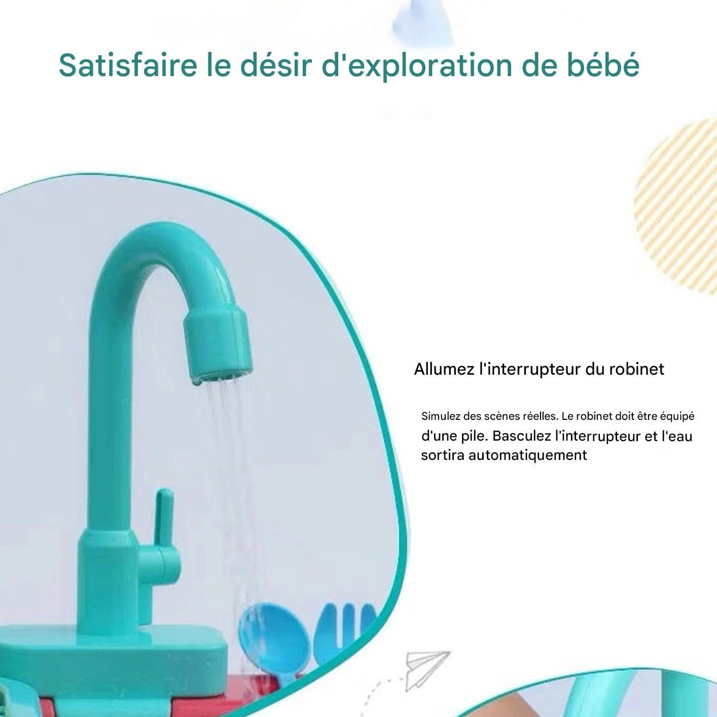 Esplorazione senza rischi: la guarnizione impermeabile e curva consente alla S di esplorare in sicurezza. Progettato per resistere ad un uso intensivo prolungato. Sviluppo delle abilità: ripiano per giocattoli integrato e ampio lavandino per incoraggiare le capacità organizzative, incluso uno scolapiatti a più livelli che semplifica la pulizia e la preparazione rapida della stanza dei giochi. Design coinvolgente: immerge i bambini in un gioco interattivo di pulizia in un'autentica scena di cucina, incoraggiando le capacità cognitive e la coordinazione pratica attraverso scenari di gioco di ruolo coinvolgenti progettati per lo sviluppo e l'esplorazione giocosa. Divertente gioco educativo: goditi un flusso d'acqua motorizzato a batteria combinato con un rubinetto rotante a 180 gradi per un controllo realistico. Questa funzionalità migliora il gioco interattivo e promuove esperienze di apprendimento pratico, fornendo un'attività ludica ed educativa per i bambini. Momenti: stimola l'immaginazione attraverso un gioco versatile o un gioco culinario con opzioni di accessori espandibili che aumentano la complicità dei genitori. Adatto per uso interno ed esterno, promuove lunghe ore di intrattenimento coinvolgente.
