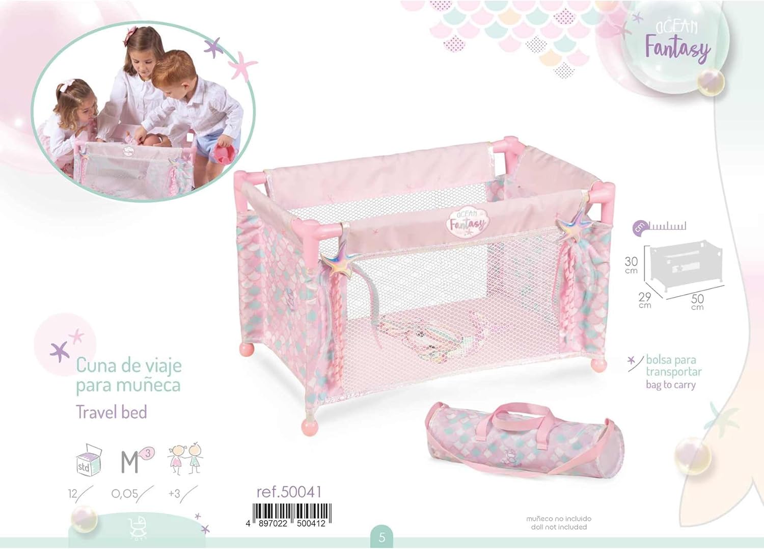 Culla di viaggio per bambola con misure 30 x 29 x50 cm Articolo Decuevas della linea Ocean Fantasy Design per bambini con grandi finiture e diverse zone di gioco. Articolo fabbricato con materiali resistenti e di alta qualità.