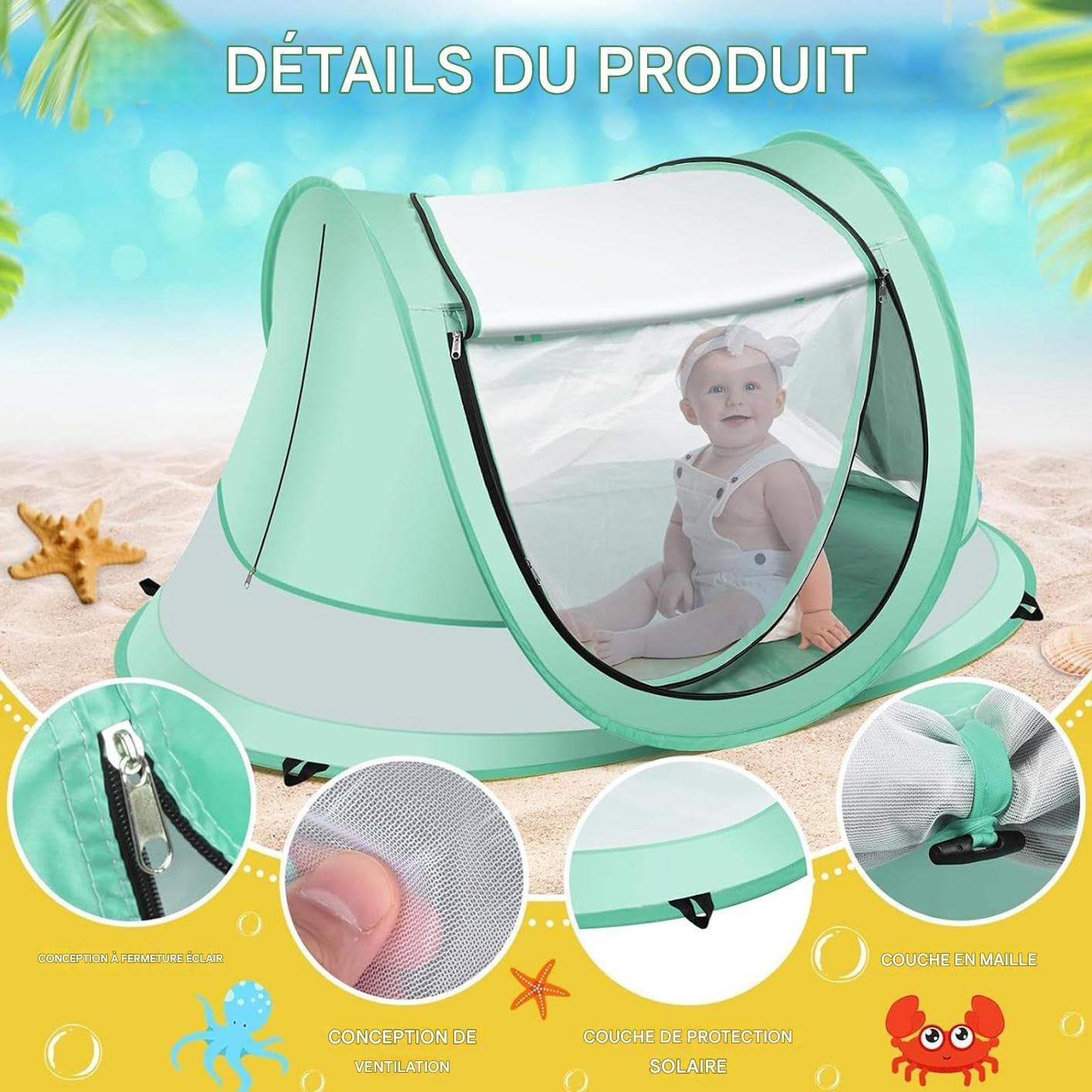 Protezione UV: tenda da spiaggia con protezione solare ad alta densità UPF 50+ che crea un'efficace barriera contro i raggi UV per proteggere la pelle sensibile dei bambini durante l'esposizione al sole all'aperto. Durata provata: struttura di ventilazione 360 progettata per mantenere una circolazione d'aria stabile e una temperatura costante. Protezione efficace contro gli insetti associata a un tessuto rispettoso della fragile epidermide dei neonati. Area Extra-Large: progettata per i bambini attivi, questa tenda da spiaggia per bambini offre uno spazio di gioco oversize che favorisce la rampa e le attività giocose, comfort e divertimento durante le avventure all'aria aperta, con una portabilità eccezionale e un facile stoccaggio per un comodo utilizzo quotidiano. Telaio elastico a sgancio rapido: questa tenda da spiaggia è dotata di un telaio elastico a sgancio rapido per un facile montaggio, consentendo una transizione senza soluzione di continuità tra interno ed esterno, offrendo un riparo temporaneo versatile e pratico per varie occasioni Stabilità semplificata: combinazione di implementazione rapida, componenti resistenti al vento e struttura solida per prestazioni costanti in vari ambienti esterni
