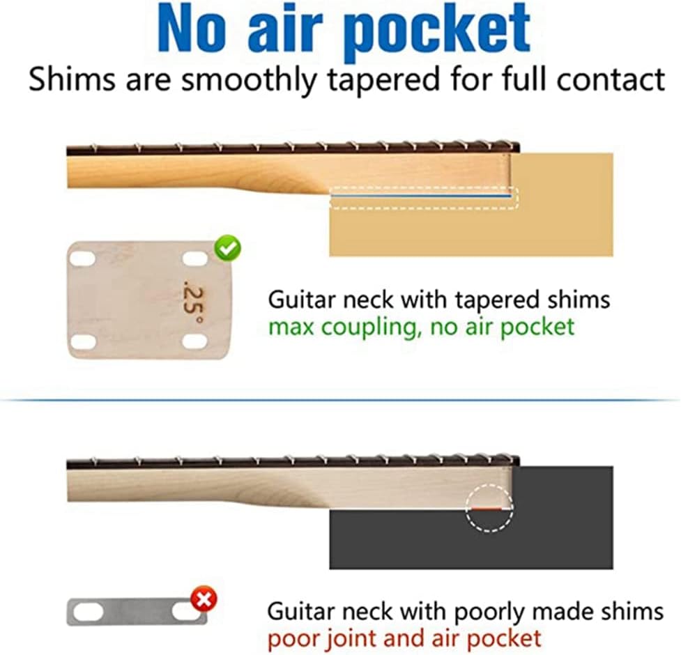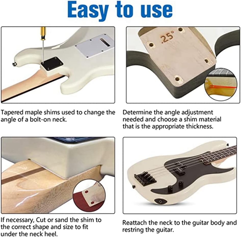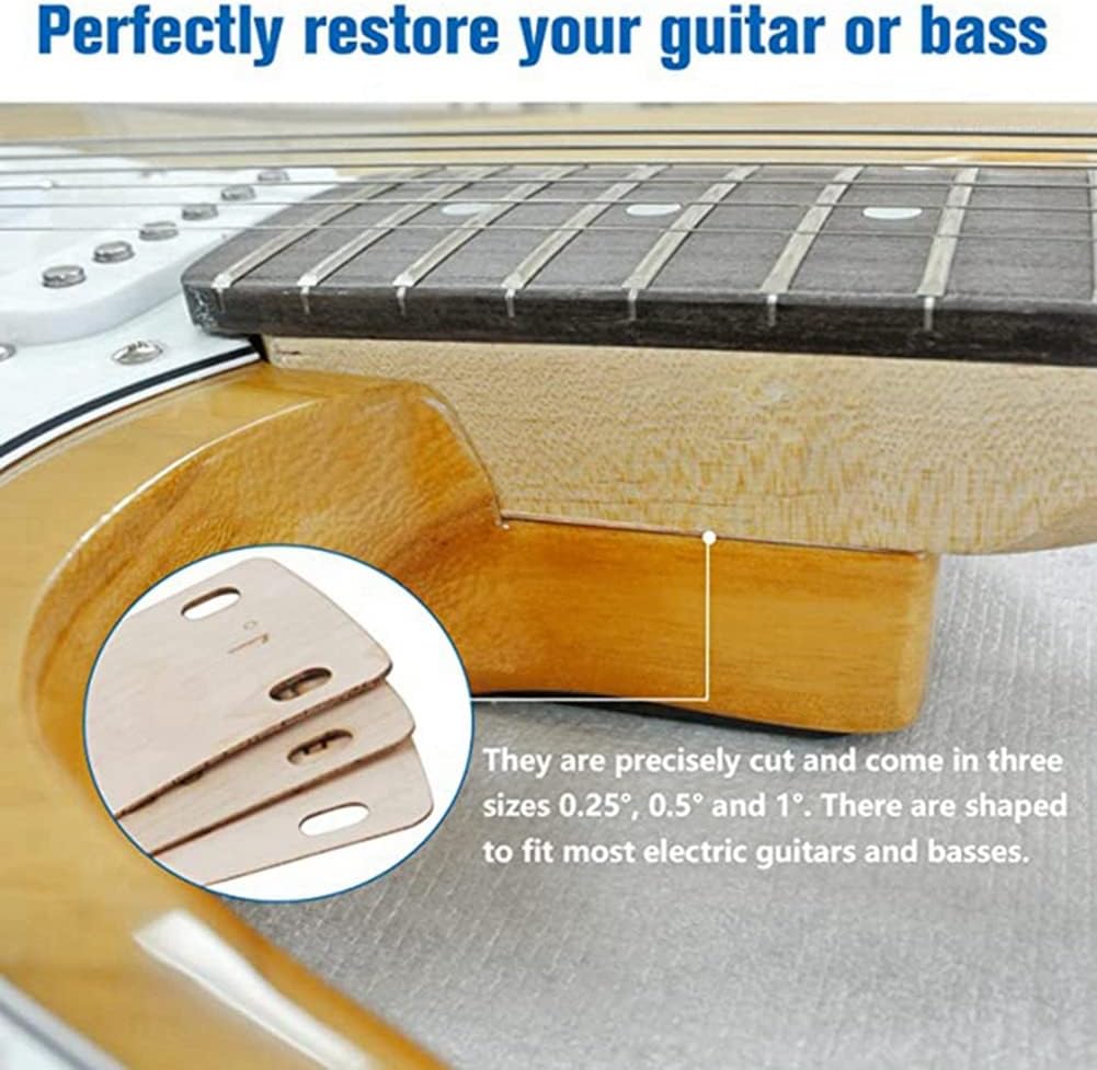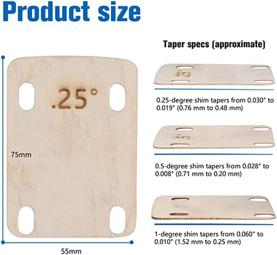 [Set laminato in acero duro con tre strisce affusolate]Un set di tre cuscinetti in acero duro, rastremati da 0,25, 0,5 e 1 , ciascuno con bordi arrotondati, che misurano 55 mm x 75 mm. Le dimensioni del cono vanno da circa 0,76 mm a 0,48 mm per spessori di 0,25 gradi, da 0,71 mm a 0,20 mm per spessori di 0,5 gradi e da 1,52 mm a 0,25 mm per spessori di 1 . [Realizzato in acero massiccio] Scegli l'acero massiccio per i pad del manico della chitarra perché ha una migliore risonanza, stabilità e la capacità di produrre un suono più bello rispetto alla plastica. [Perfetto per ripristinare la chitarra o il basso] I nostri cuscinetti per il collo della chitarra sono perfetti per riparare chitarre elettriche e . Sono caratterizzati da un design altamente versatile che può essere facilmente personalizzato tagliando o levigando per soddisfare le tue esigenze specifiche per proteggere la tua chitarra corrosione e da danni angolari impropri. [Funzione] Il distanziatore del manico della chitarra viene utilizzato per modificare l'angolo del manico della chitarra imbullonato a scopo di protezione. I distanziatori sono accuratamente angolati e realizzati in acero affusolato per fornire l' angolo di inclinazione necessario creare sacche d'aria, proteggendo così il manico e la base della chitarra da usura e danni. [Facile da usare] Per garantire una rapida transizione alla riparazione generale della chitarra, è utile avere a portata di mano spessori di qualità standard.