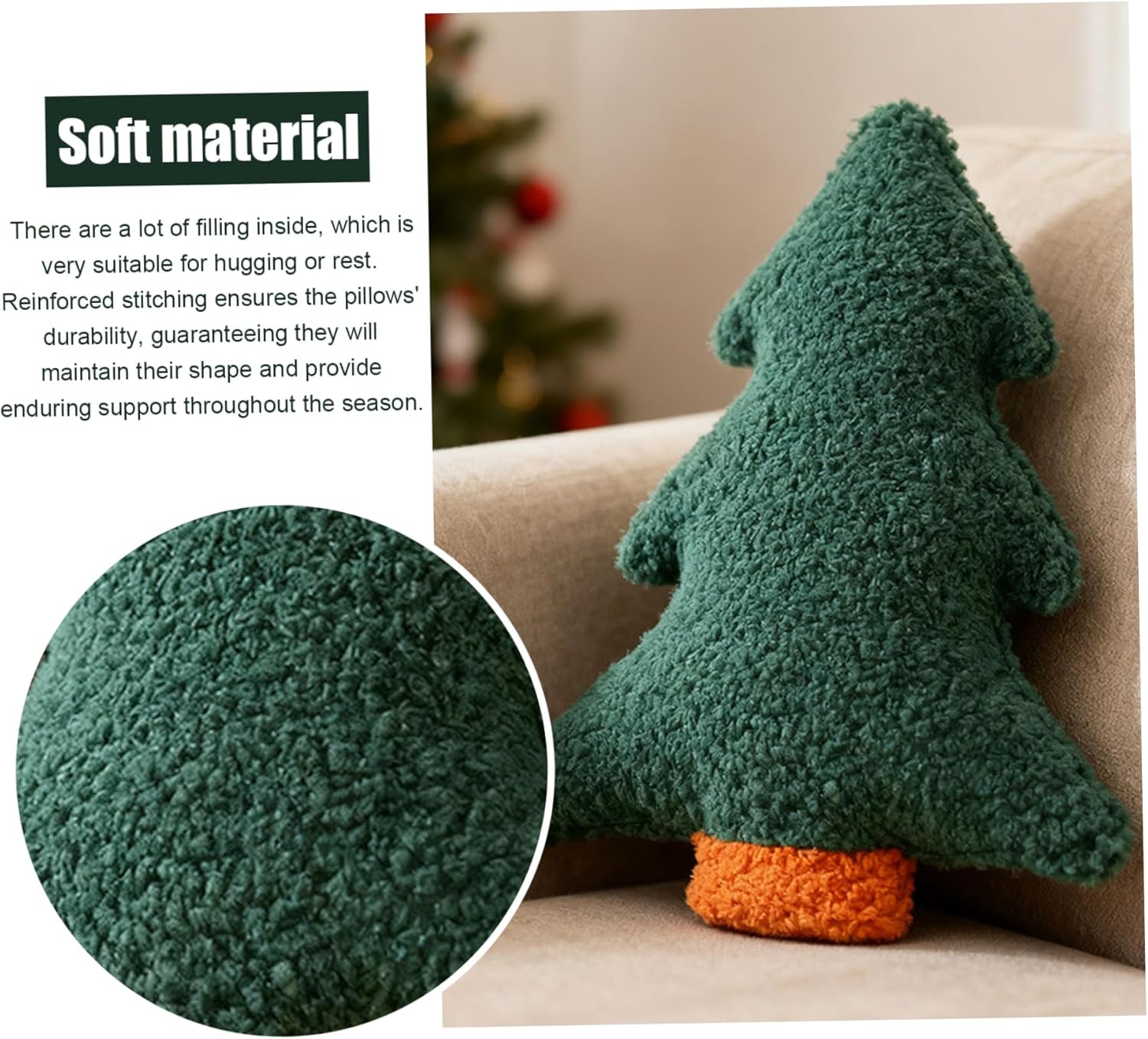 Decorazione stagionale versatile: ideale per l'arredamento della camera da letto natalizia e per l'arredamento invernale in generale, questo cuscino decorativo natalizio fonde perfettamente con vari stili per illuminare i tuoi spazi abitativi stagionaliCuscino per albero di NataleCuscini natalizi Idea regalo perfetta: combinando lo spirito festivo e il comfort quotidiano, questo oggetto decorativo per cuscini natalizi è un regalo premuroso e affascinante per amici e parenti durante le festività natalizie. Affidabile e di facile manutenzione: progettato per un uso duraturo durante le vacanze, questo cuscino imbottito per albero mantiene la sua forma e morbidezza ed è facile da pulire, garantendo praticità e durata. Fascino natalizio festivo: questo morbido cuscino per albero di Natale a forma di albero aggiunge un tocco gioioso e festoso a qualsiasi casa, camera da letto o soggiorno, migliorando il tuo arredamento natalizio con vivaci tonalità verdi e morbido comfort Cuscino per albero Cuscino natalizio Morbido comfort di peluche: realizzato con materiali di peluche di alta qualità, questo cuscino natalizio dona un'atmosfera accogliente e invitante che abbina a divani, letti o sedie fornendo al contempo un supporto delicato. Cuscino natalizio Cuscini natalizi decorativi