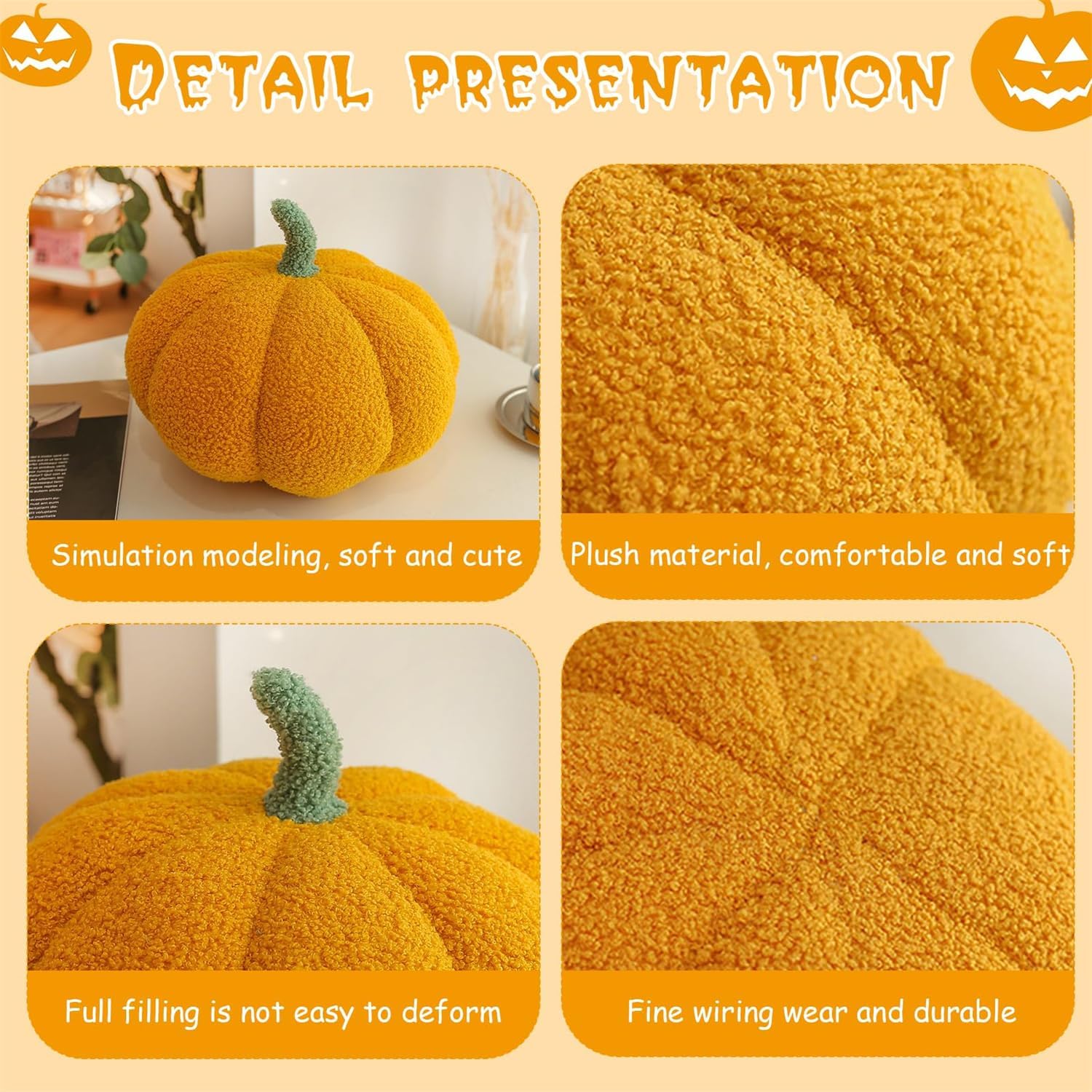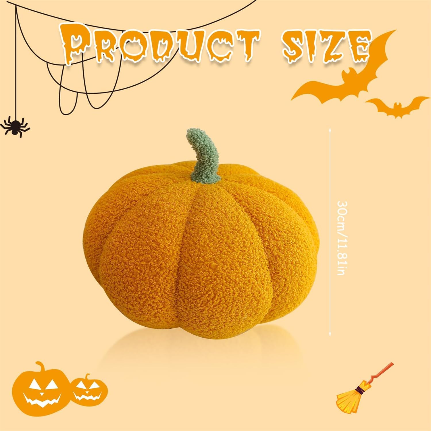 Peluche a forma di zucca: il peluche a forma di zucca di Halloween è lungo circa 30 cm, perfetto per lo schienale dell'ufficio, lo schienale del divano, il cuscino per la pausa pranzo, la decorazione della scrivania, l'ornamento della stanza e così via. 【Imballaggio sottovuoto】: i nostri cuscini a forma di zucca vengono spediti in una confezione sottovuoto. Quando lo ricevete, si prega di aprire il pacchetto, battere per renderlo soffice o pulire con un tovagliolo di carta umido o un asciugacapelli per renderlo soffice, in modo che il giocattolo torni come appare nell'immagine. Regalo ideale: i simpatici cuscini di peluche a forma di zucca sono adatti a tutte le età, sia per neonati, ragazzi, ragazze, amici, compagni di classe o decorazioni per feste, è una buona scelta. 【Ampia gamma di usi】: il cuscino di peluche a forma di zucca è adatto per divano, sedia, soggiorno, letto, auto, ufficio, festa di Halloween e ovunque, il suo aspetto carino e il tocco morbido possono tenerti in uno stato d'animo felice tutto il giorno. Materiale di alta qualità: il peluche a forma di zucca è realizzato in morbido cotone PP e morbido peluche corto, è piacevole al tatto, può essere un giocattolo per giocare con i tuoi bambini, e può anche essere un grande cuscino per leggere, sedersi e dormire.