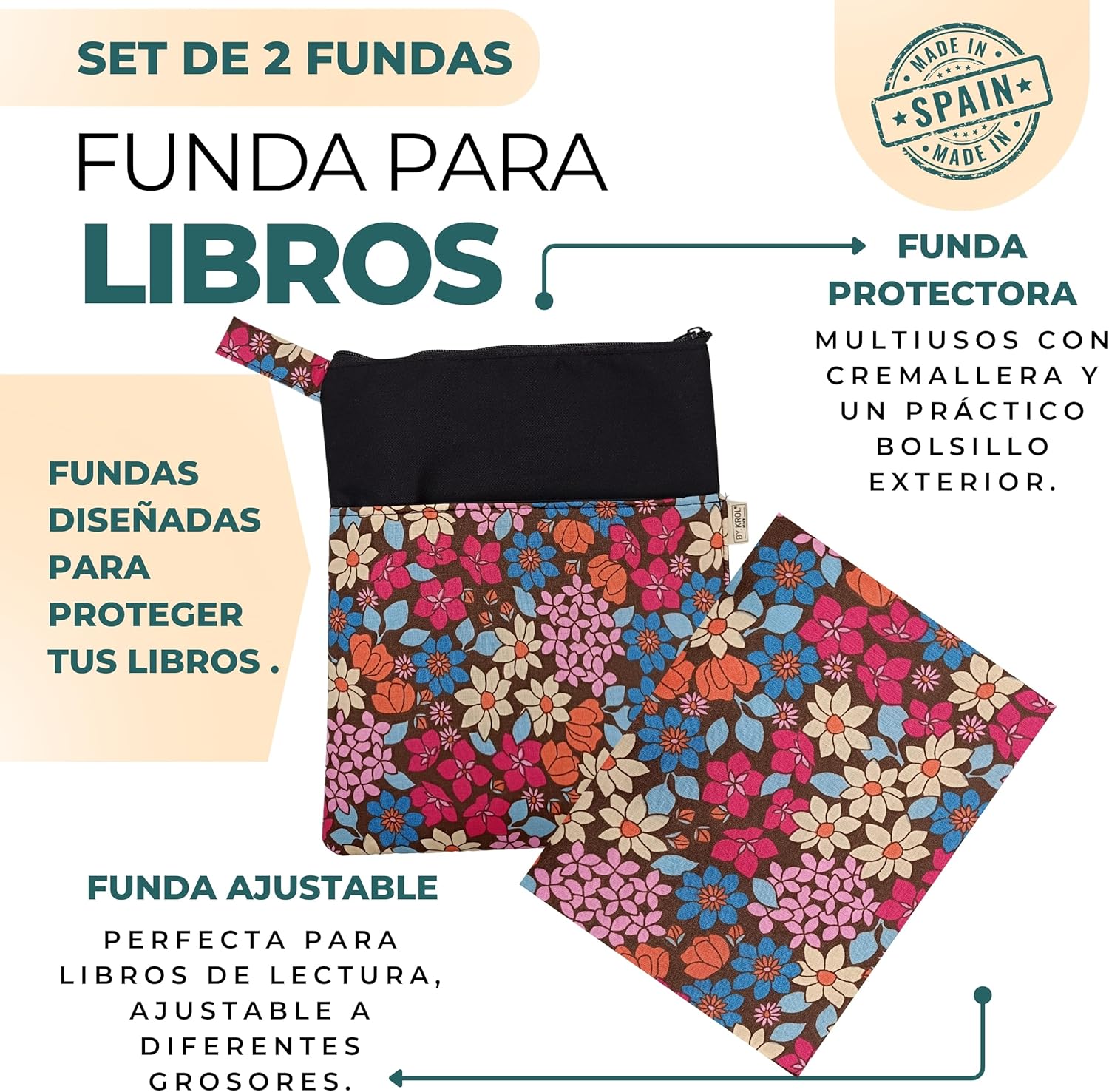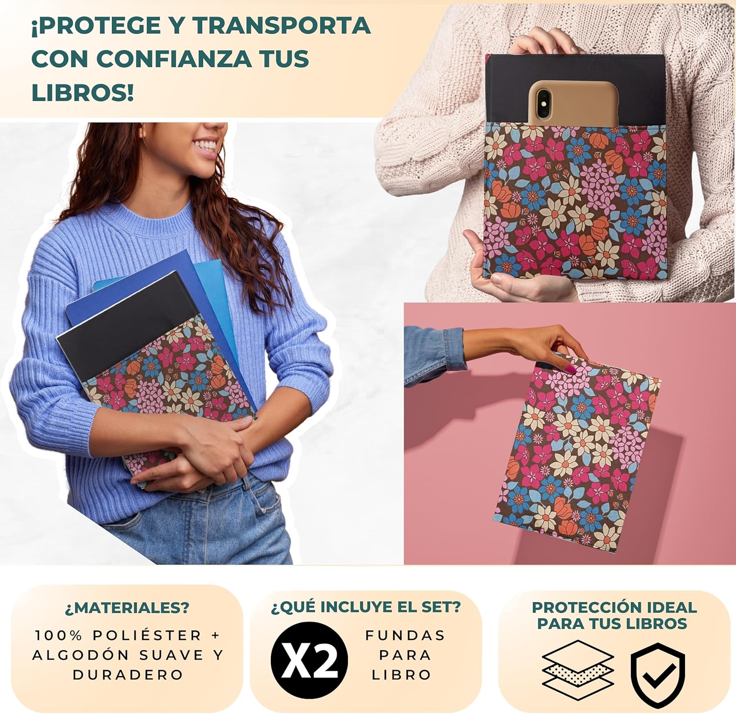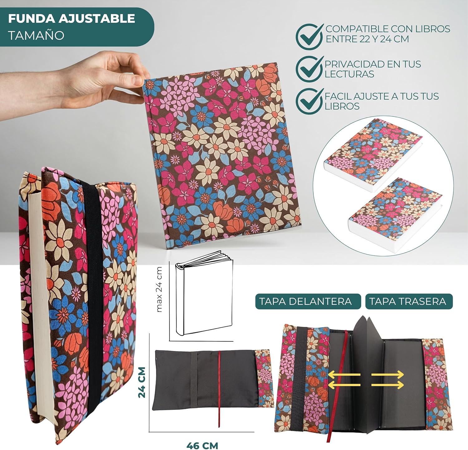Confezione da 2 custodie per libri di lettura: include una custodia a libro con cerniera e tasca esterna per cellulare, tablet o qualsiasi altra fodera regolabile ai risvolti. Perfetto per proteggere e godersi i tuoi libri preferiti ovunque. Design funzionale e versatile: la custodia con cerniera è ideale per trasportare libri in sicurezza, mentre la fodera a libro regolabile consente di leggere comodamente senza rimuovere la custodia del libro di lettura. Realizzate con un tessuto facile da pulire e fodera interna per una maggiore protezione: queste custodie per libri sono realizzate in poliestere e cotone con eleganti disegni facili da pulire progettati per accompagnarti in ogni lettura. Un regalo perfetto per i lettori: sia per te che come regalo per una lettrice, per la festa della mamma, per un compleanno o per Natale, questo pacchetto è un successo sicuro. Ideale come dettaglio originale in date speciali o come accessorio letterario. Compatibile con diversi formati di libri: la custodia regolabile con elastici aperti misura 25 x 46 cm e si adatta facilmente a libri con copertina rigida fino a 22 x 16 x 5 cm. La custodia con cerniera misura 29 x 24 cm ed è dotata di una pratica tasca esterna da 22 x 20 cm.
