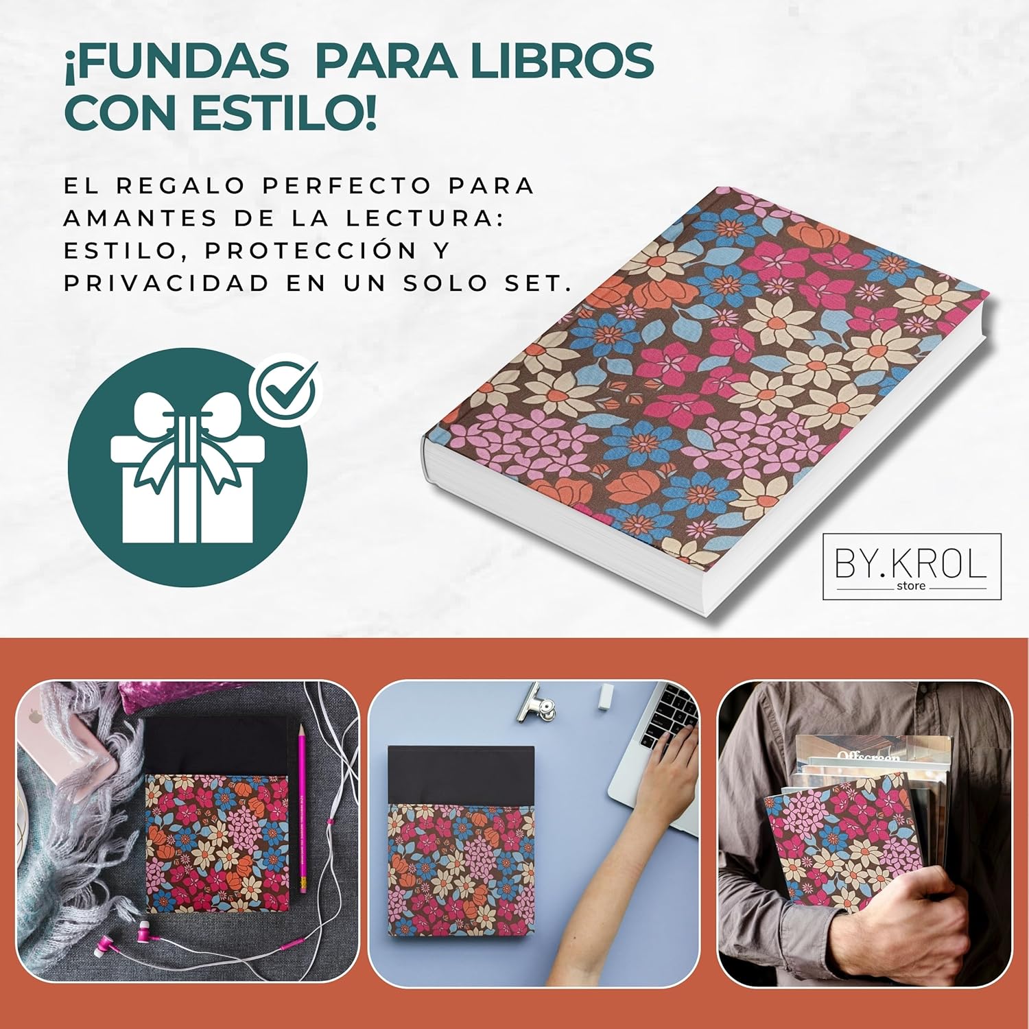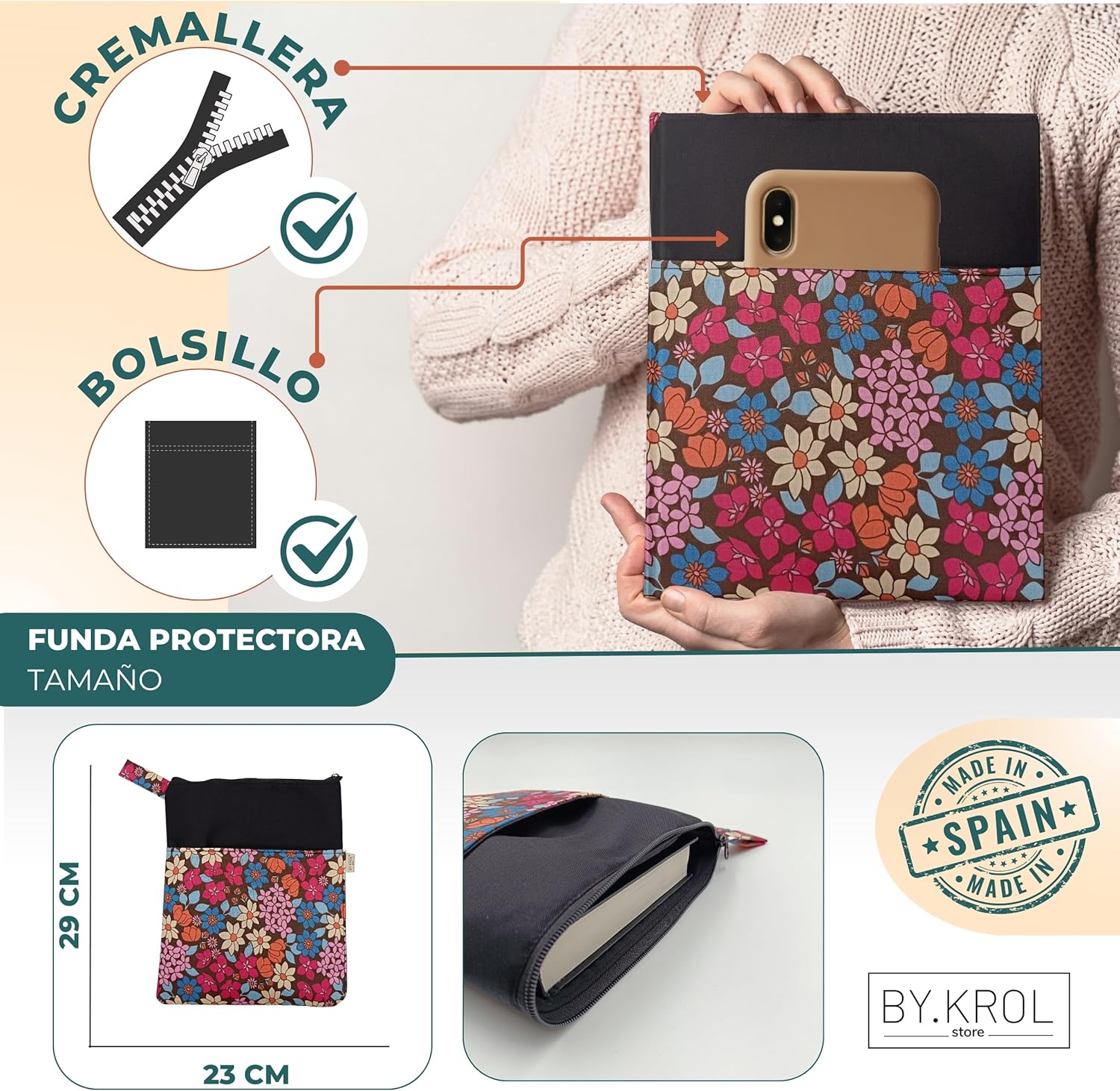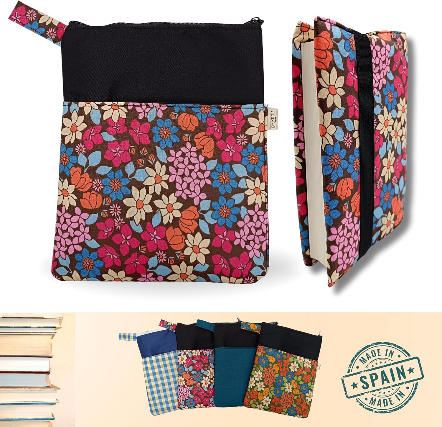 Confezione da 2 custodie per libri di lettura: include una custodia a libro con cerniera e tasca esterna per cellulare, tablet o qualsiasi altra fodera regolabile ai risvolti. Perfetto per proteggere e godersi i tuoi libri preferiti ovunque. Design funzionale e versatile: la custodia con cerniera è ideale per trasportare libri in sicurezza, mentre la fodera a libro regolabile consente di leggere comodamente senza rimuovere la custodia del libro di lettura. Realizzate con un tessuto facile da pulire e fodera interna per una maggiore protezione: queste custodie per libri sono realizzate in poliestere e cotone con eleganti disegni facili da pulire progettati per accompagnarti in ogni lettura. Un regalo perfetto per i lettori: sia per te che come regalo per una lettrice, per la festa della mamma, per un compleanno o per Natale, questo pacchetto è un successo sicuro. Ideale come dettaglio originale in date speciali o come accessorio letterario. Compatibile con diversi formati di libri: la custodia regolabile con elastici aperti misura 25 x 46 cm e si adatta facilmente a libri con copertina rigida fino a 22 x 16 x 5 cm. La custodia con cerniera misura 29 x 24 cm ed è dotata di una pratica tasca esterna da 22 x 20 cm.