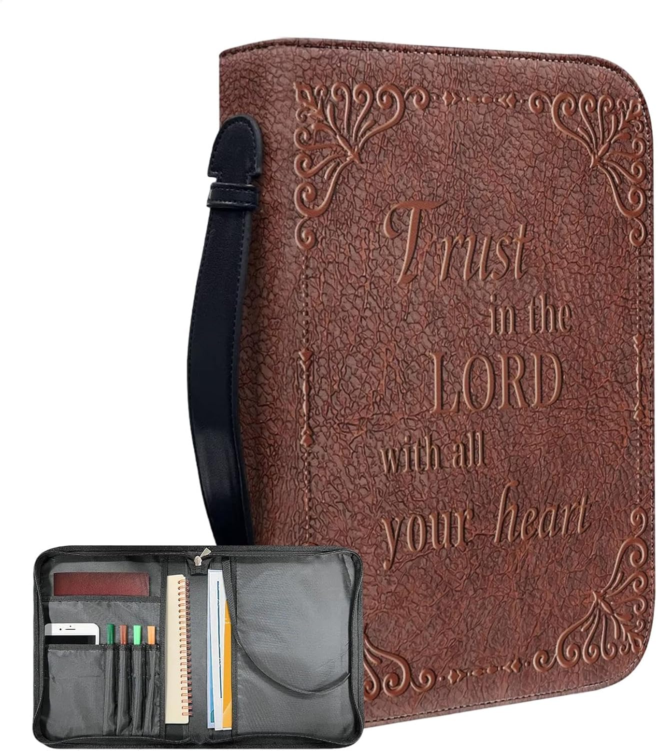 Facilità d'uso: ottieni la massima protezione per i tuoi preziosi libri e quaderni con la nostra custodia per copertina in stile biblico vintage, progettata su misura per abbinare libri e quaderni di dimensioni più piccole, standard e più grandi; disponibile nelle taglie da M a 2XL per una perfetta corrispondenza ogni volta. Artigianato eccezionale: modernizza il tuo studio biblico con la copertina vintage che include pratici scomparti, un delicato motivo floreale di vite e croce e uno slot per penne per un comfort moderno. Materiale riutilizzabile: realizzata in pelle PU riutilizzabile, questa custodia vintage per la Bibbia protegge i tuoi libri da graffi, polvere e danni causati dall'uso quotidiano. Resistente all'usura ed è facile da pulire. Convenienza di trasporto: sia che tu sia sulla strada per la chiesa o un servizio di culto, la nostra custodia protettiva per la Bibbia vintage garantisce un facile trasporto con una maniglia robusta per una presa sicura. Trasporta o tieni senza sforzo ogni volta che ne hai bisogno. Regalo delicato: regalate ai vostri cari la nostra custodia protettiva vintage biblica ideale per Natale e altre feste; dotata di una pratica maniglia, questo è un modello leggero e facile da trasportare che mantiene le penne e il telefono ben organizzati, rendendolo il ricordo perfetto.