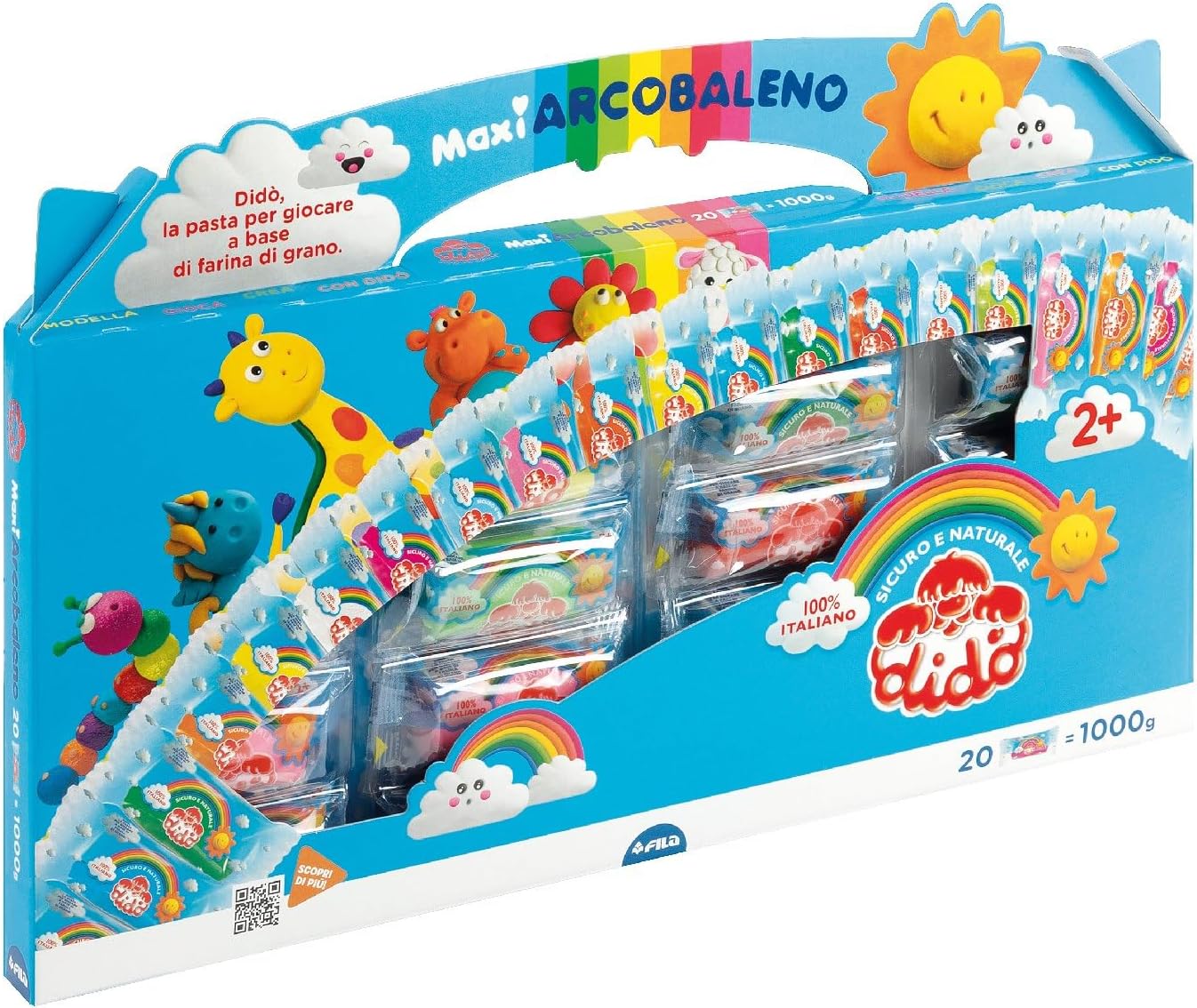 Una grande valigetta piena di pasta per giocare a Didò per i piccoli modelli: creatività in formato XL nel nuovo Didò Maxi Rainbow Pack Vestiti salsiccia in diversi colori fluo, pastello e glitter e accessori per un Natale pieno di fantasia La robusta custodia in cartone è riutilizzabile per custodire le creazioni e i disegni dei piccoli artisti Con elementi modellistici sul retro e QR code con link ai video tutorial Contiene 20 salsicce da 50 g in 20 colori diversi, 1 mattarello, 1 coltello, 1 tovaglietta