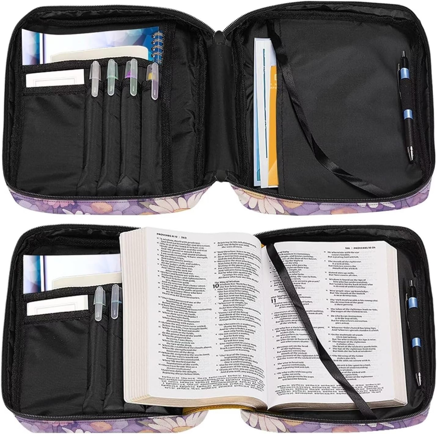 Grande capacità: 27 x 20 x 4 cm. Adatto per bibbie/libri/blocchetti di varie dimensioni. Ha una tasca frontale e molteplici tasche interne per organizzare comodamente i tuoi oggetti personali come cellulare, penne, appunti, ecc. Materiale durevole: la copertura della Bibbia è realizzata in poliestere di alta qualità e cerniere mentali, è resistente, morbida e leggera. Può essere antipolvere e mantiene pulita la Bibbia. Design conveniente: ci sono due cerniere in metallo per aprire e chiudere facilmente. L'interno ha 2 tasche laterali, 1 tasca verticale, 1 slot per segnalibri, 22 scomparti per penne. Sia in chiesa che in lezioni, puoi estrarre il libro più facilmente. Con maniglia portatile e tasche esterne, ti permette di uscire trasportando con solo una borsa per la Bibbia. Multifunzionale: con questa borsa biblica puoi usarlo in molti modi come una borsa per documenti, valigetta, borsa per iPad, borsa. Questa custodia protettiva per bibbia è adatta per trasportare alcuni dei tuoi piccoli oggetti. Regalo perfetto: ci sono vari tipi di bellissimi modelli tra cui scegliere. È un bel regalo per la persona amata, i bambini, gli amici. È anche una buona scelta da inviare il giorno del Ringraziamento, Natale, festa della mamma, festa del papà.