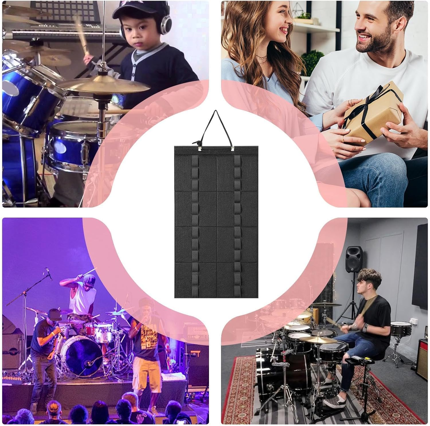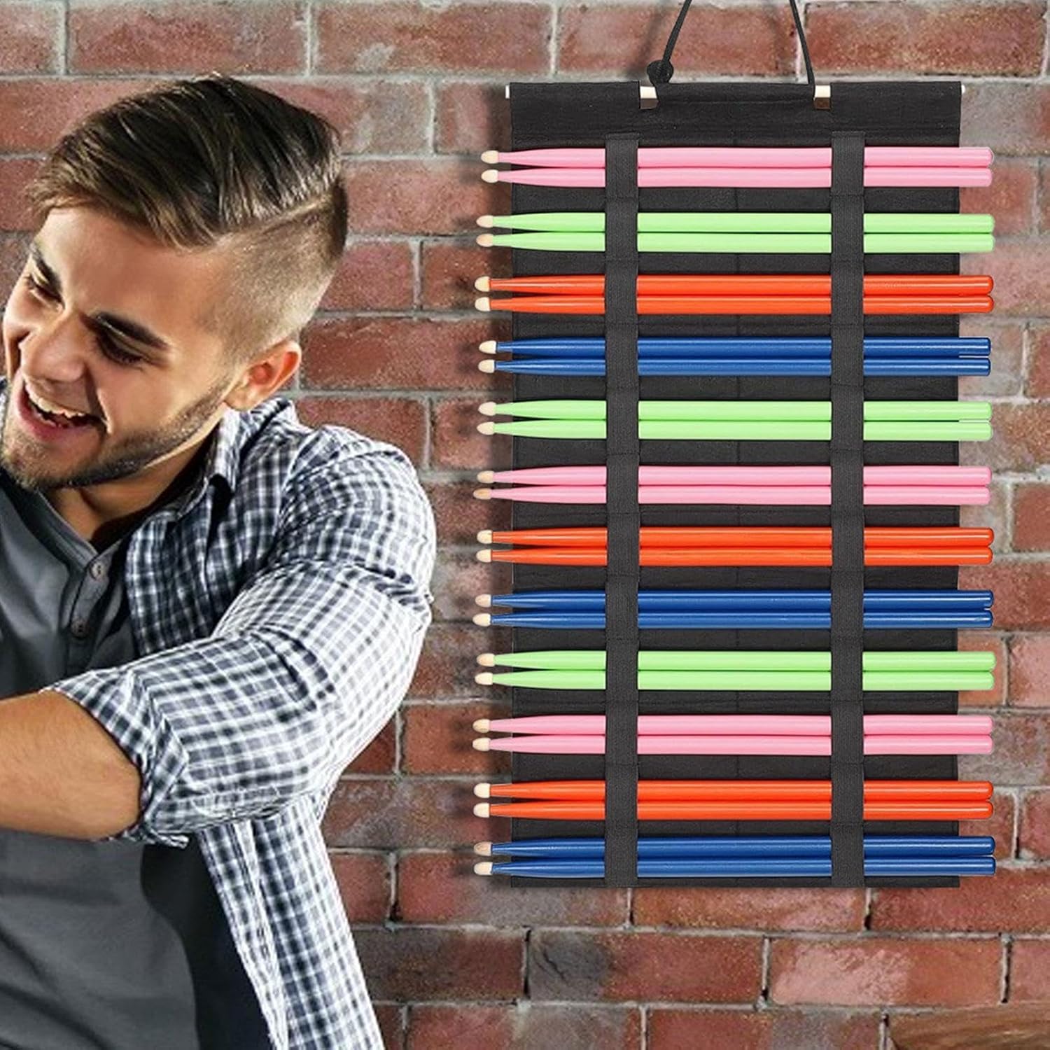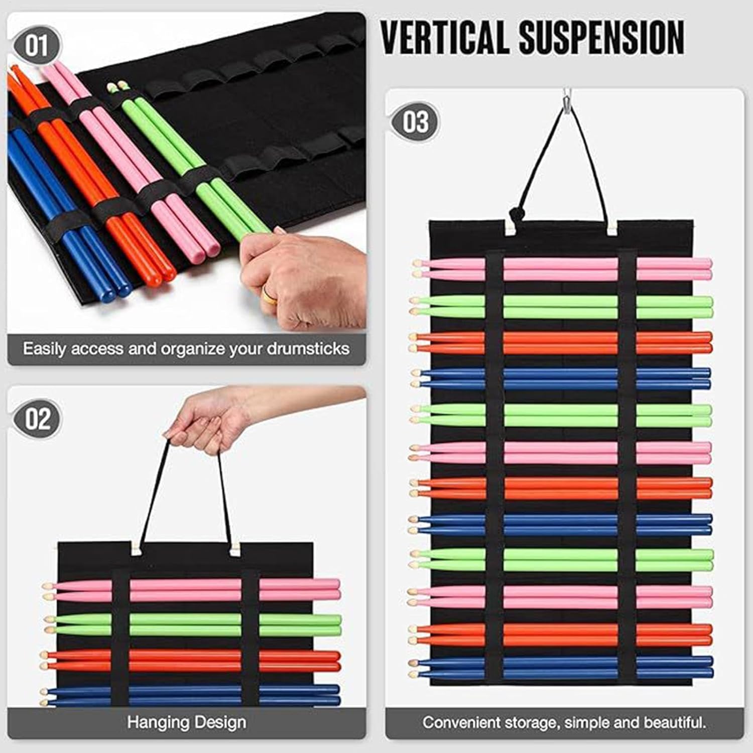 Durata perfetta: accuratamente progettato con eccellente materiale in feltro, il supporto per bacchette offre una consistenza lussuosa e garantisce una facile pulizia e manutenzione. La morbidezza aumenta il comfort e aggiunge un tocco elegante agli accessori del kit batteria. Design unico: dispone di 24 anelli elastici individuali per mantenere le bacchette ordinate e organizzate in ogni momento. Il sistema di sospensione elastica regolabile con 12 paia di bacchette supporta saldamente una vasta gamma di bastoni di dimensioni. Utilizzo efficiente dello spazio: l'innovativo design a parete consente di risparmiare spazio e sfruttare al massimo lo spazio limitato e lo ottiene rapidamente durante le prestazioni o la pratica. Soluzione di ottimizzazione dello spazio con allineamento orizzontale Migliore portabilità: questo supporto per bacchetta ha un design pieghevole unico che ti consente di organizzare i tuoi bastoncini in qualsiasi momento, a casa, in studio o in spettacoli dal vivo. Multifunzione: questo display multifunzione mostra la tua passione e preferenza per la musica, rendendolo perfetto per gli amanti della batteria. la conservazione mantiene le bacchette in buone condizioni e mostra la tua collezione personale. Un'unità multifunzione adatta per bacchette, jazz, muti, ecc.