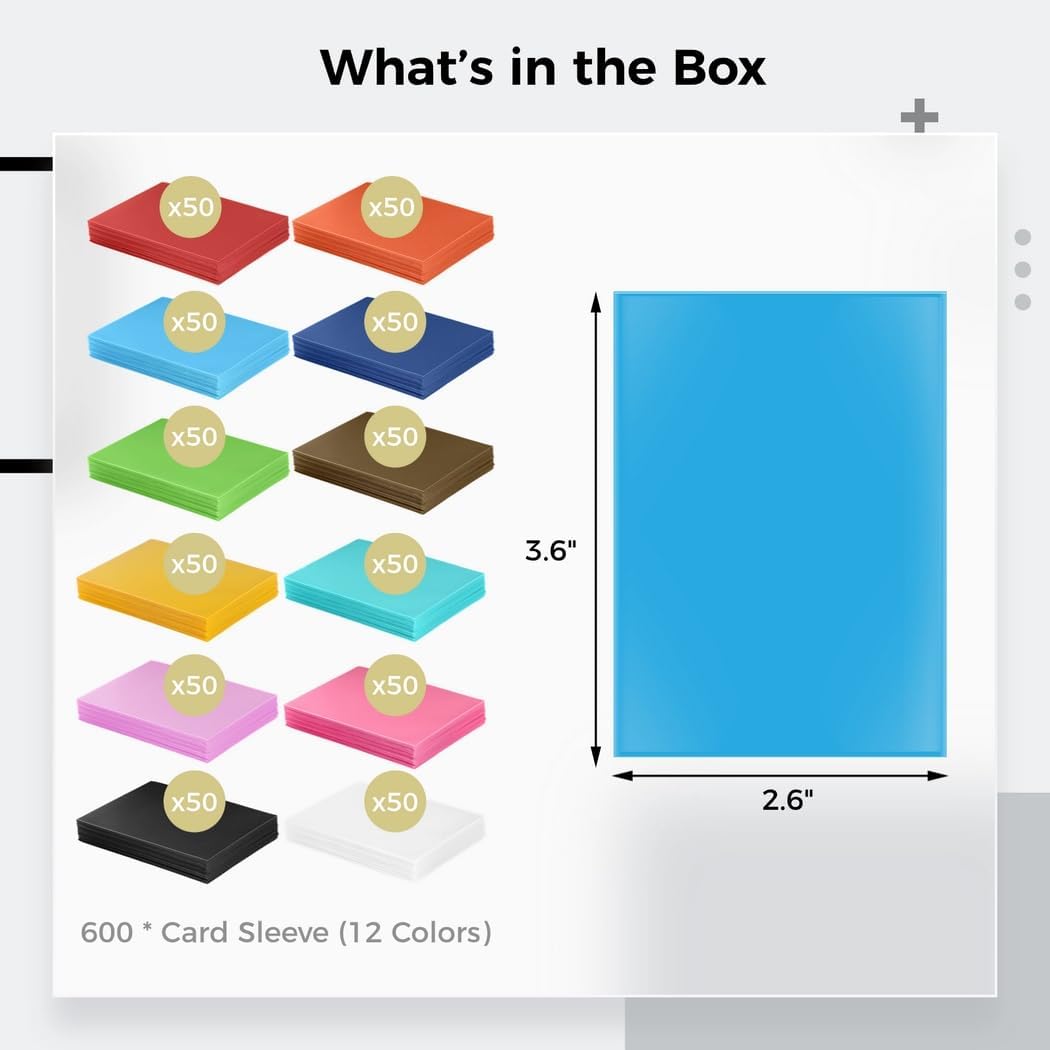 Confezione multipla di custodie per carte: questa confezione di seicento custodie è disponibile in una dozzina di sfumature per mantenere i tuoi preziosi set di carte al sicuro; classificali facilmente con questi colori vivaci e duraturi Realizzato per adattare: ogni custodia da 9,1 x 6,6 cm può contenere una carta da 9 x 6,5 cm o meno; ideale per varie carte standard da 0,9 mm come carte da gioco basate su collezione, animazioni e carte sportive Costruzione resistente: queste maniche realizzate in plastica di qualità resistono all'elasticità e all'età; la parte anteriore trasparente mostra i veri colori della carta; il retro opaco colorato sembra raffinato Armatura protettiva: proteggi le tue carte care da liquidi, macchie, polvere, graffi, ecc.; conserva le carte in condizioni piatte e vivide, in modo che appaiano come nuove Facile da usare: basta far scorrere le carte dentro; le maniche fissano le carte per evitare angoli piegati; mescolare è facile nelle serate di gioco di carte; cura delle carte con questa selezione di custodie