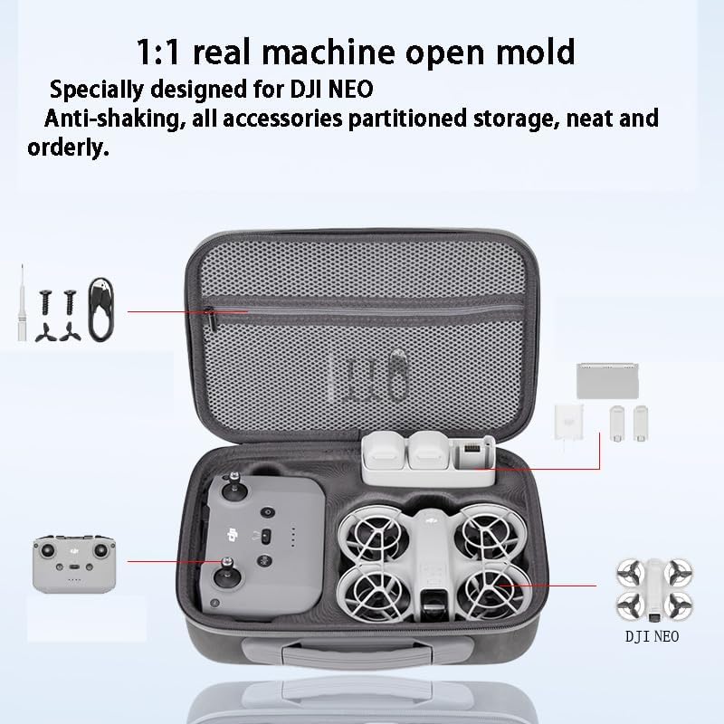 -1:1 stampo aperto macchina reale. Appositamente progettato per DJI NEO Fly More Combo, anti-scuotimento, in modo che tutti i tipi di accessori partizionati di stoccaggio, ordinato e ordinato. - Resistente alla pressione e alle cadute. Scegli la pelle PU di alta qualità che può essere impermeabile e resistente agli spruzzi, resistente alle cadute e ai graffi, fornendo una protezione completa per il tuo drone e i suoi accessori per viaggiare senza preoccupazioni. - Buona esperienza di utilizzo. Il rigoroso avvolgimento del filo più squisita cerniera liscia, la squisita lavorazione artigianale rende la borsa liscia e delicata, sottolinea la tua ricerca di alta qualità! - Semplice e conveniente, pesa solo 480g, può organizzare il drone e gli accessori, facile da viaggiare. - Diversi metodi di zaino, può essere palmare, centrifuga, spalla, è possibile scegliere il modo preferito per portare questa borsa.