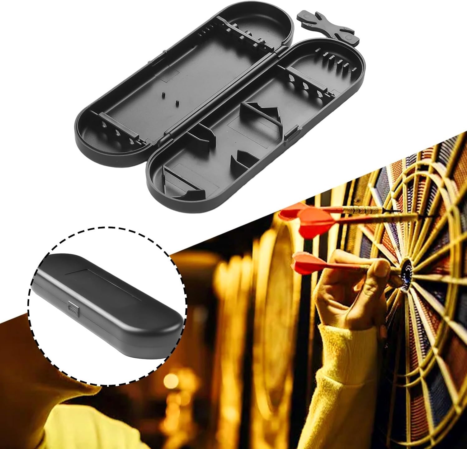 Portatile: custodia compatta in plastica per freccette progettata per riporre e trasportare in modo sicuro durante i viaggi, con esterno liscio e leggero, 48 g, misura circa 155 x 50 x 21 mm, si adatta facilmente in borse o tasche senza ingombro Nylon per scatola freccette: per una costruzione di lunga durata rinforzata in nylon combinato con guscio in plastica dura fornisce una protezione di lunga durata e una base di supporto interna per evitare danni durante l'uso quotidiano o Custodia in plastica per freccette: appositamente progettata per contenere 3 freccette con scomparti dedicati per aste, ali e altri accessori, per riporre in modo organizzato la punta in acciaio e la punta in plastica Design di vestibilità generale: compatibile con la maggior parte delle marche di freccette professionali e ricreative, offre una soluzione adatta per i giocatori che hanno bisogno di un accesso affidabile alle loro attrezzature a casa o in viaggio Pratico organizer: il layout aerodinamico consente un rapido accesso a tutti i componenti, mentre la finitura nera resiste all'accumulo e all'erosione mantenendo un aspetto pulito
