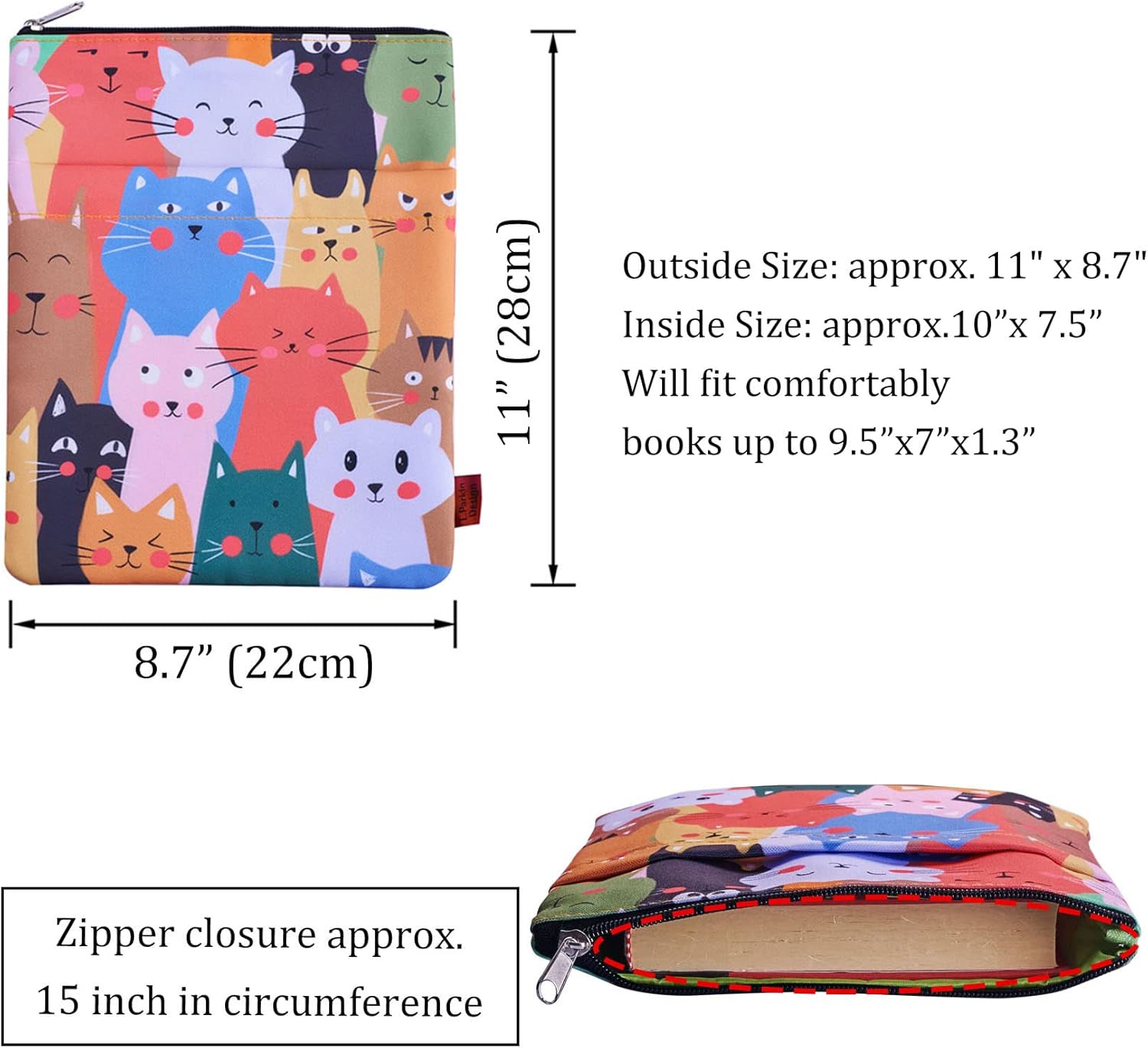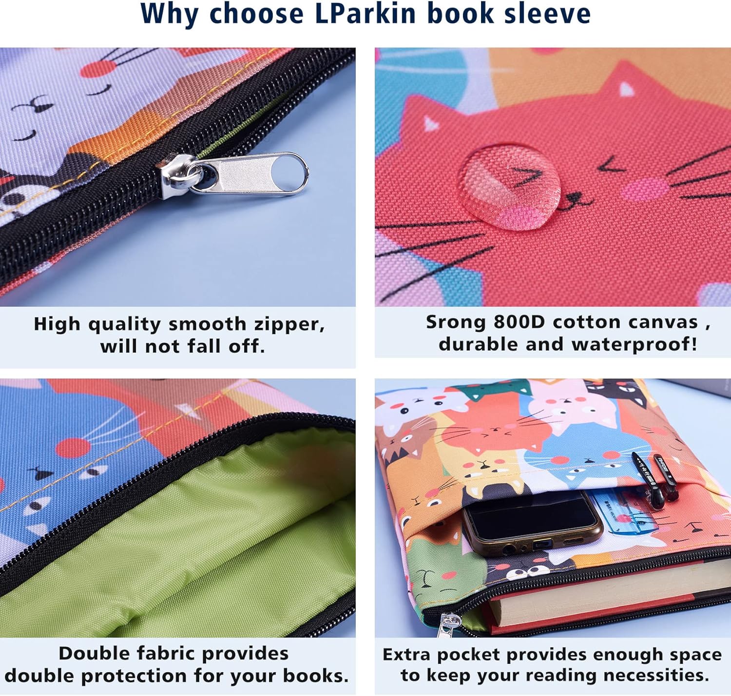 Custodia per libri per gatti: la custodia protegge il libro dalla polvere e la copertina dagli strappi, non lasciare che i tuoi libri vadano senza protezione. È un regalo meraviglioso e indimenticabile per gli amanti dei libri. Questo articolo non è destinato all'uso da parte dei bambini di età inferiore ai 3 anni. Dimensioni: questa custodia per libri misura circa 28 x 22 cm e si adatta alla maggior parte dei libri autopubblicati, libri tascabili standard, libri tascabili di massa e normali copertine rigide. Tasca extra sulla manica: la custodia per libri è realizzata in tela di cotone/poliestere, può essere lavata quando si sporca. La copertina del libro è anche arricchita da una tasca perfetta per contenere un quaderno, un piccolo diario, penna/matita, telefono, Kindle o anche alcuni libri più piccoli! Chiusura con cerniera: presenta una chiusura con cerniera liscia di alta qualità per una maggiore protezione. Ideale per tenere i libri al sicuro durante il viaggio. Perché scegliere la custodia per libri LParkin è realizzata in tela 800D di alta qualità e materiale impermeabile, e la rigorosa tecnologia sartoriale assicura che la custodia per libri che ricevi sia perfetta. Nessun odore irritante, nessun danno alla salute, nessun materiale di bassa qualità. È solo una custodia per libri di alta qualità!