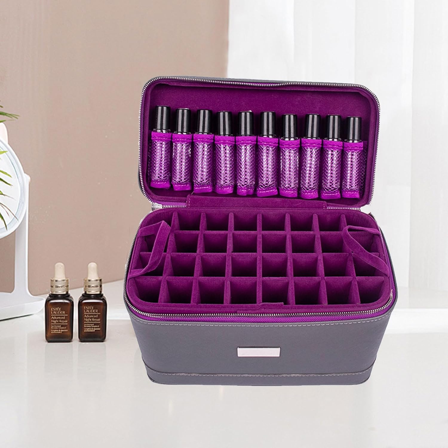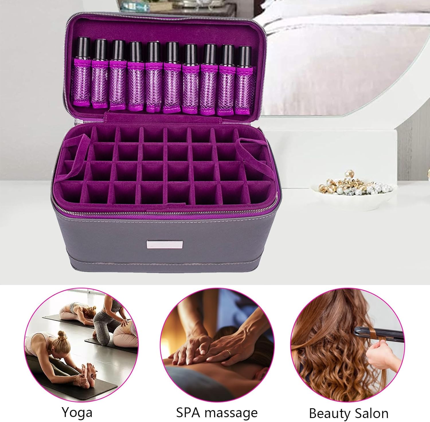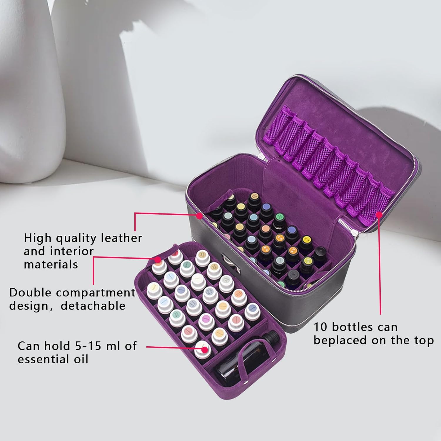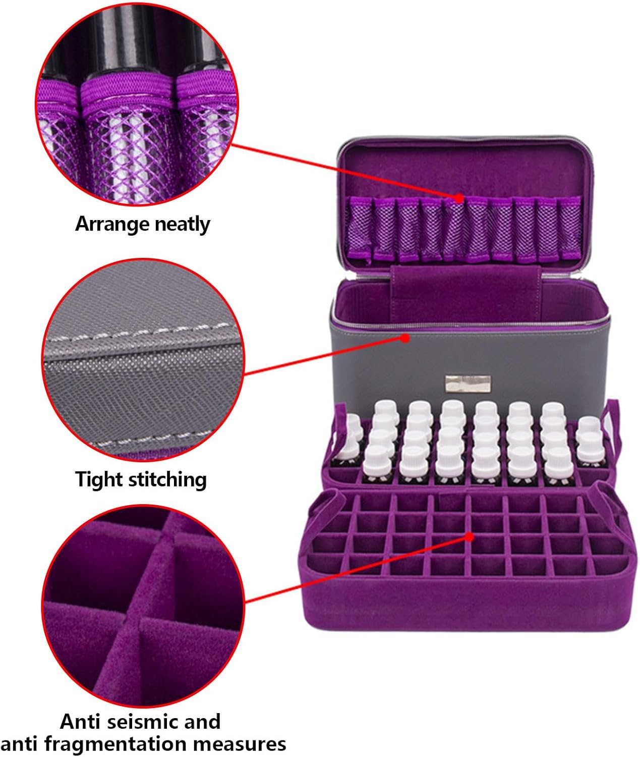 1, Previene la collisione: la custodia per olio essenziale conserva facilmente le bottiglie di olio essenziale, impedendo loro la collisione e proteggendole dalla luce solare. 2, Contenuto della bottiglia di olio: la custodia per olio essenziale può contenere 66 bottiglie, 56 scomparti da 15 ml + 10 scomparti da 10 ml. 3, Guscio rigido: con guscio rigido impermeabile e antiurto, con un'alta spugna all'interno, l'olio essenziale è al sicuro nella scatola di immagazzinaggio. 4, Robusto e durevole: la custodia per oli essenziali è robusta e durevole con cerniera e cinturino da polso. 5.Portatile e leggero: la borsa per la conservazione degli oli essenziali è leggera e facile da trasportare, perfetta per i viaggi, l'uso domestico e l'uso professionale in salone.