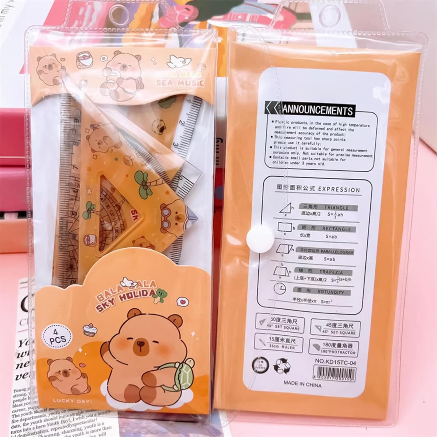 Helpful Set: Includes 2 pieces of triangolare rulers 30/60 and 45/90 degrees, a 15 cm straightedge, 4 pieces of cute colorful math geometry tools, and a protractor; ideal for basic geometric work Charming Design: Experience convenience and excitement with our Cute Capybara Ruler Set. These rulers feature adorabili capybara colors and crystal-clear numbers, making them perfect for a wide range of school and home uses Easy to Carry: Effortlessly carry our Cute Capybara Ruler Set in your bag or pencil pouch with its lightweight and compact design. Equipped with rulers and triangles featuring metric scales, as well as a protractor measuring 0-180 degrees, you can draw straight lines and angles with ease and precision Serve for a Long Time: Crafted from robust PP, this Capybara Ruler Set is not easy to be broken, ensuring suitability for long-time use and well-made reliability Nice Present: Lift the presenting game with this Delightful Capybara Ruler Set that is perfect for kids' birthdays and Christmas. Suitable for both school and home, it makes an ideal educational tool and an exciting addition to any stationary collection. Perfect present for boys, girls, and students