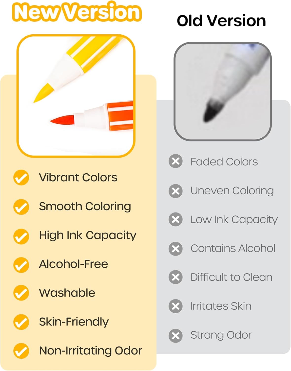 Divertenti pennarelli per timbri: I 36 colori dei pennarelli lavabili per bambini sono un tesoro di sorprese, questi timbri sono disponibili in varie forme e disegni, aggiungendo un ulteriore livello di creatività alle opere d'arte dei bambini. Possono usare i timbri per creare motivi, bordi o per migliorare le loro illustrazioni principali Libri da colorare coinvolgenti: I libri da colorare inclusi, composti da 10 pagine, sono una fonte di intrattenimento e di apprendimento e offrono ore di divertimento nel disegno. Le immagini presentano animali, frutta e veicoli, stimolando la creatività e la coordinazione occhio-mano dei bambini Portatile e conveniente: Conserva ordinatamente tutti i pennarelli, rendendo più facile tenere tutto organizzato. La scatola è leggera e dotata di una maniglia: che si tratti di un viaggio in auto, di un picnic, di un appuntamento di gioco, di una gita in macchina o di un viaggio in aereo, i bambini possono portare con sé i loro materiali artistici e divertirsi sempre e ovunque Sicuri e lavabili: Questi pennarelli lavabili sono realizzati con materiali ecologici, per garantire la massima tranquillità. In caso di fuoriuscite accidentali o di segni sui vestiti o sui mobili, possono essere facilmente puliti. Lasciate che i vostri bambini esplorino il loro lato artistico senza preoccupazioni. Materiale scolastico per bambini: Questi simpatici pennarelli per timbri sono una scelta eccellente e molto adatta per l'uso in classi di scuola materna, asilo e scuola materna. Sono una parte indispensabile dell'elenco delle forniture scolastiche per bambini e un regalo di qualità superiore per ragazzi e ragazze