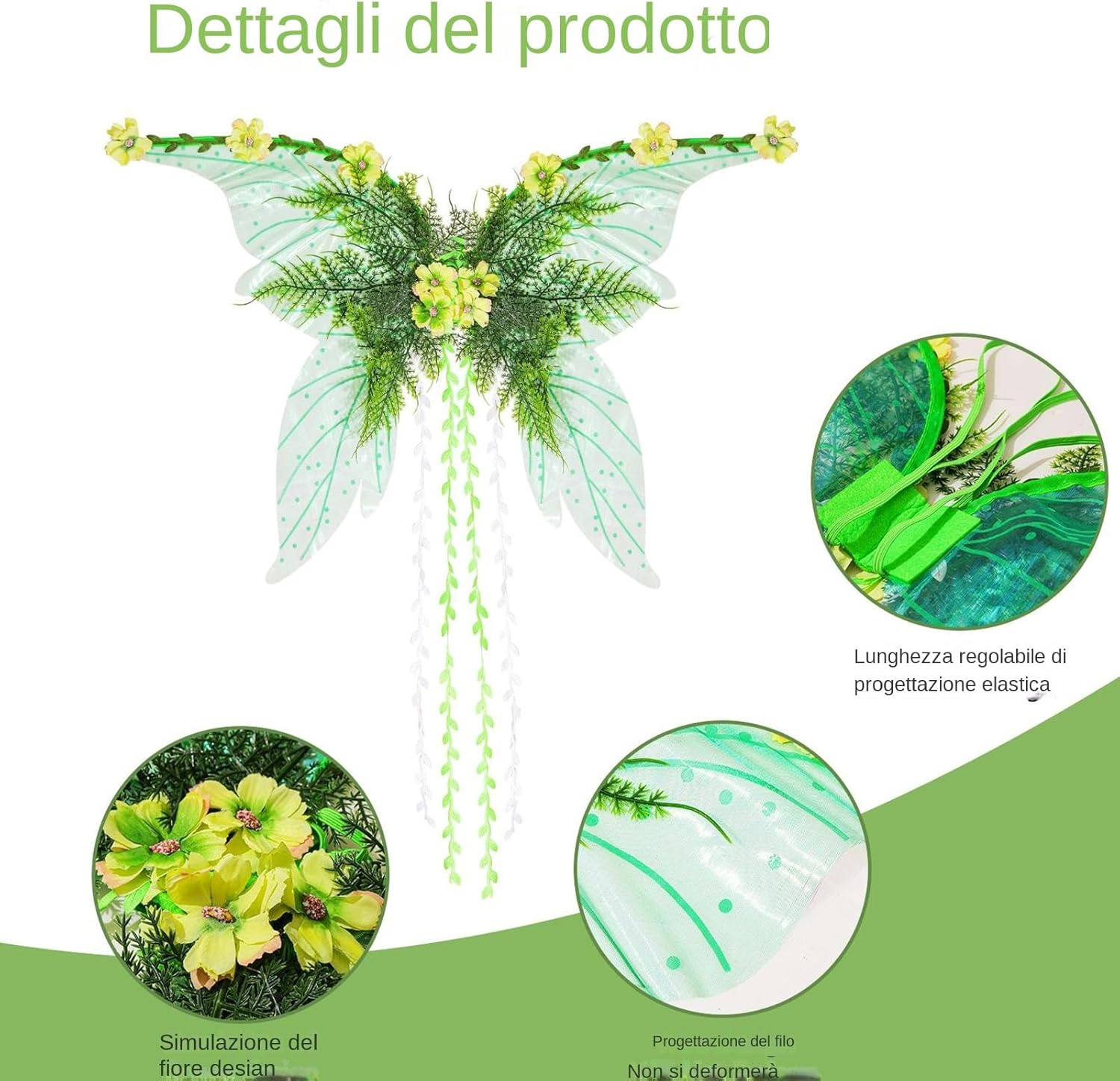 Comforto Ottimale: da fata regolabili con materitraspiranti per avventure fantasy prolungate, garantiscono vestibilità sicura e comfort durante ogni movimento senza causare irritazioni Luminose: da fata con effetto luminescente perfette per spettacoli e serate fantasy, o cosplay che completa il tuo costume con un tocco magico e affascinante in ogni situazione Struttura Portante : da fata con paillettes meticolosamente applicate producono un effetto scintillante ipnotico, idequando eleganza e design accattivante sono essenzi. La base rigida mantiene forma e integrità durante l'utilizzo Ispira la creatività:da fata che incantano gli amanti dei costumi e brillano come per feste, offrono un'esperienza come regalo di fantasia per lei o di compleanno speciale. Applicazioni Varie: Rezzate per costumi da fata e spettacoli creativi, queste brillano come teatr, complementi per foto fantasy e must-have per feste in costume, arricchendo il tuo outfit con fascino senza e versatilità