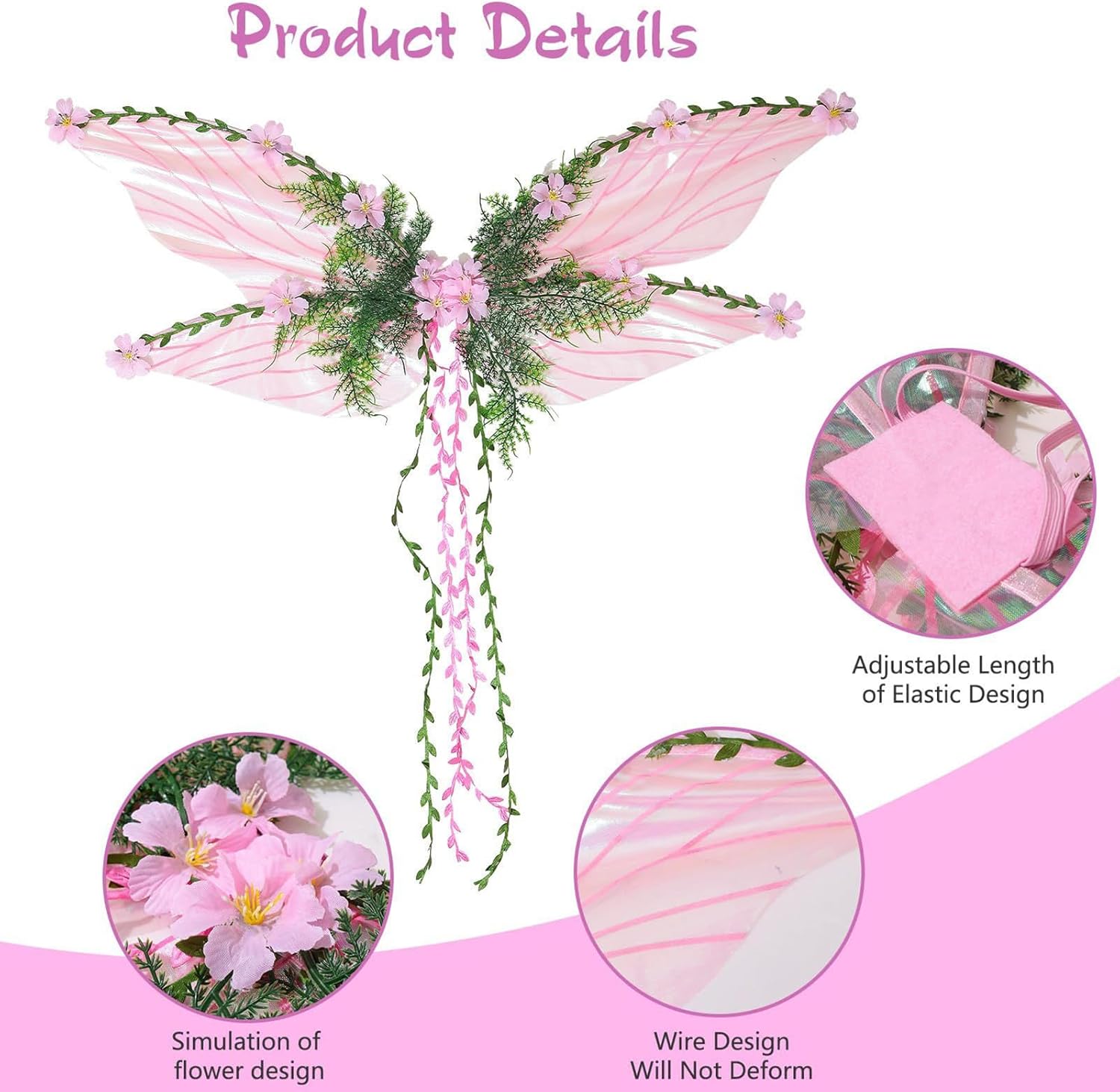 Materiale sicuro: arricchite con tessuto morbido, queste ali da fata offrono una sensazione di leggerezza e sono sicure per un uso ripetuto, assicurando una piacevole esperienza ogni volta che vengono indossate Comodo design della cinghia: dotato di un sistema di cinghie elastiche, che assicura semplici processi di inserimento e rimozione, con regolazioni rapide e nessun aiuto aggiuntivo richiesto Migliora il tuo costume: completa facilmente i vestiti, si allinea perfettamente con i costumi fantasy, e migliora ogni look utilizzando versatili disegni di ali da fata Dettagli stravaganti delle fate: con delicati accenti floreali 3D e un fascino da fiaba, queste ali forniscono un aspetto stravagante migliorando l'effetto visivo sognante per un'incantevole presentazione complessiva Ampia gamma di usi: un accessorio indispensabile per tutte le occasioni, queste ali portano fascino a servizi fotografici, palcoscenici di Halloween e riunioni come concorsi e feste con un fascino senza pari