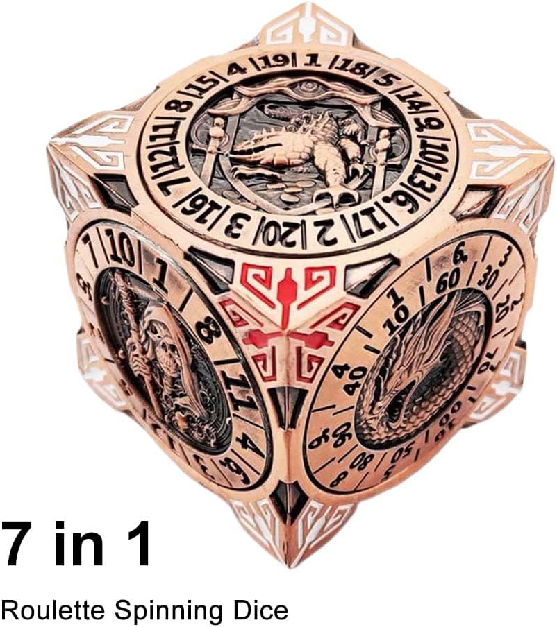 Cubo creativo per giochi da tavolo Dungeons and Dragons. Design versatile: cubo in metallo sette in uno per D4 D6 D8 D10 D12 D20 e D10/D100, ideale per giochi di ruolo e giochi da tavolo Preciso ed equo: distribuzione casuale dei numeri su ogni pagina, marcature chiare e goffrature diagonali per una facile leggibilità Design 3D fantasioso: motivi dettagliati di mostri, tesori e creature, ispirati a illustrazioni fantasy per giochi coinvolgenti Dadi meccanici di gioco creativo per dungeon. Rotazione delicata del giroscopio: il giroscopio interno garantisce giri uniformi, facile da fermare o ruotare liberamente Cubo meccanico 7 in 1 per giochi da tavolo creativi Dungeons and Dragons. Regalo perfetto: ideale per gli appassionati di DND, leader di gioco e serate di gioco, compatto, collezionabile e promuove avventure creative
