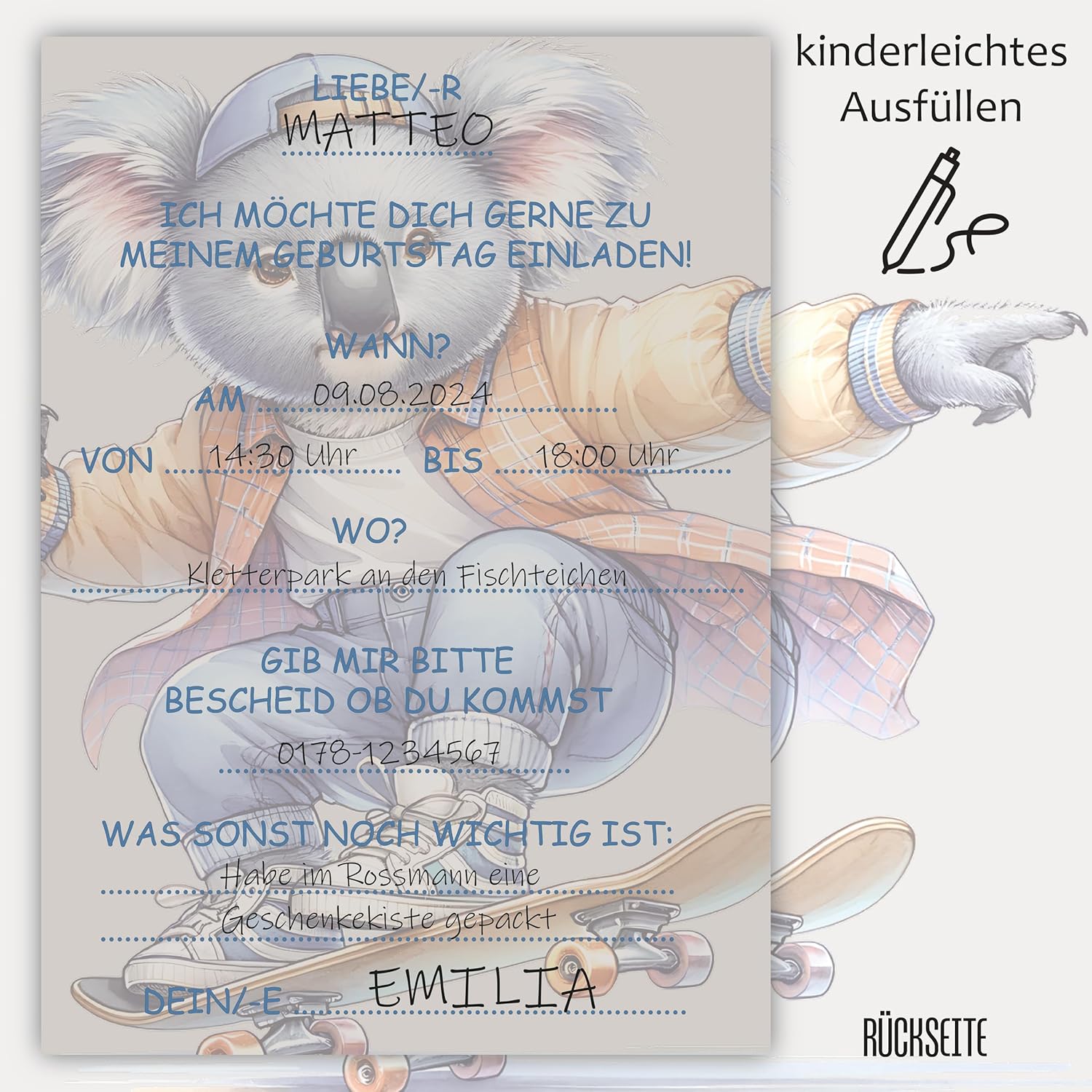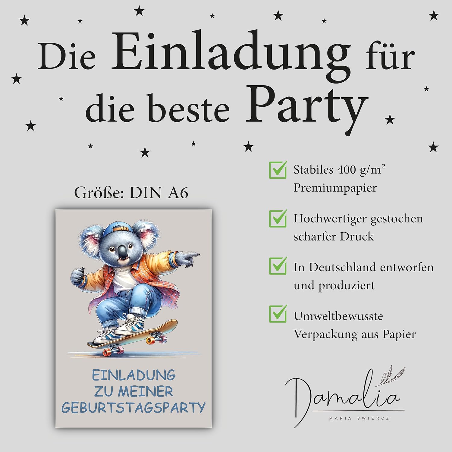 12 biglietti di invito, stampati in formato DIN A6 con buste abbinate. Tutti i nostri biglietti con buste abbinate sono progettati da soli. Buste abbinate: semplificano la distribuzione e l'invio degli inviti agli amici. Le nostre buste si adattano al design dei biglietti, completano il pacchetto e proteggono il biglietto dallo sporco. Facile da compilare: il festeggiato può compilare facilmente i propri biglietti d'invito grazie ai campi indicati sul retro. Prodotto in Germania: i nostri biglietti d'invito sono particolarmente resistenti e di alta qualità, da 400 g/m², quindi possono essere distribuiti senza buste.