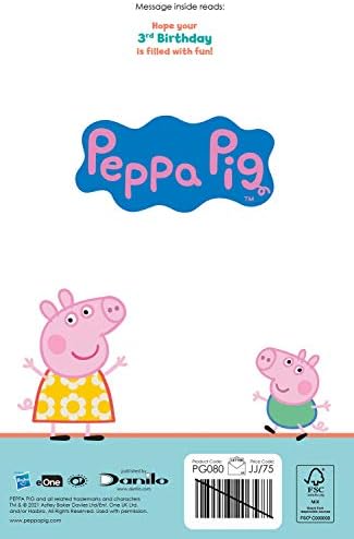 Peppa Pig: questo luminoso biglietto d'auguri di Peppa Pig è pieno di colori divertenti, arcobaleni, cuori e stelle. Un gigantesco 3 rosso è presente sulla parte anteriore di questa carta insieme ai personaggi di Peppa Pig, tra cui Peppa e suo fratello George. Evviva. Sei tre! » Iscrizione nella parte superiore della carta in rosso, verde e giallo. All'interno del biglietto: "Spero che il tuo terzo compleanno sia pieno di divertimento". e include anche altre immagini di Peppa e dei suoi amici. C'è anche tanto spazio per inviare i tuoi auguri di compleanno. Ottimo per l'ambiente: le nostre carte sono realizzate con carta certificata FSC che ha superato i più alti controlli normativi ambientali. La card viene fornita con una busta completamente riciclabile Numero 1 in Europa: offerto dall'editore autorizzato numero uno in Europa: ogni prodotto Danilo è concesso in licenza ufficiale al 100%. Ciò garantisce che il prodotto sia stato approvato dalla legge stessa e presenti i design attuali e più recenti. Dimensioni: le dimensioni di questo prodotto sono 7 x 5 pollici, ogni biglietto viene fornito con una busta di dimensioni adeguate.