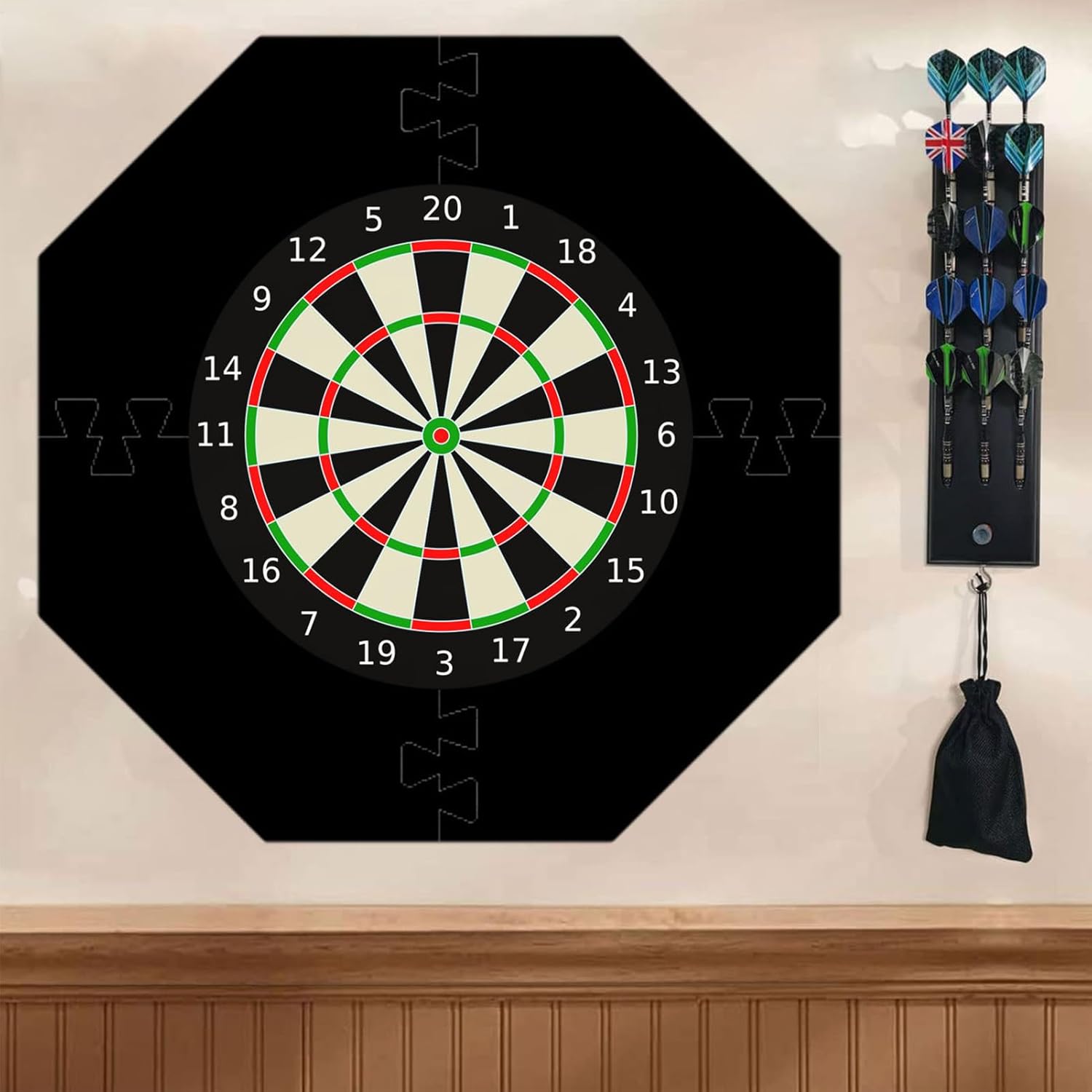 Materiale resistente all'usura: realizzata in materiale EVA di alta qualità, la protezione da parete Dartboard fornisce una soluzione stabile e duratura per proteggere le pareti dalle freccette mantenendo un design morbido e morbido Design squisito: il design ottagonale della nostra protezione da parete Dartboard è realizzato con squisita fattura, aggiungendo un tocco di moda e unicità alla tua sala giochi Grande copertura: con un design ispessito per una protezione sicura, la protezione da parete Dartboard protegge un'ampia area, assicurando che sia le punte che le pareti rimangano impeccabili. Installazione rapida: la nostra protezione da parete Dartboard è molto facile da configurare con la clip di fissaggio che non richiede alcun attrezzo aggiuntivo. Questa efficiente soluzione di protezione della parete è facile da installare, smontare e giunzione Ampia gamma di applicazioni: ampia applicazione con pratici forniture e accessori per freccette, la protezione da parete Dartboard è adatta per sale giochi, club, saloni di famiglia, ecc.