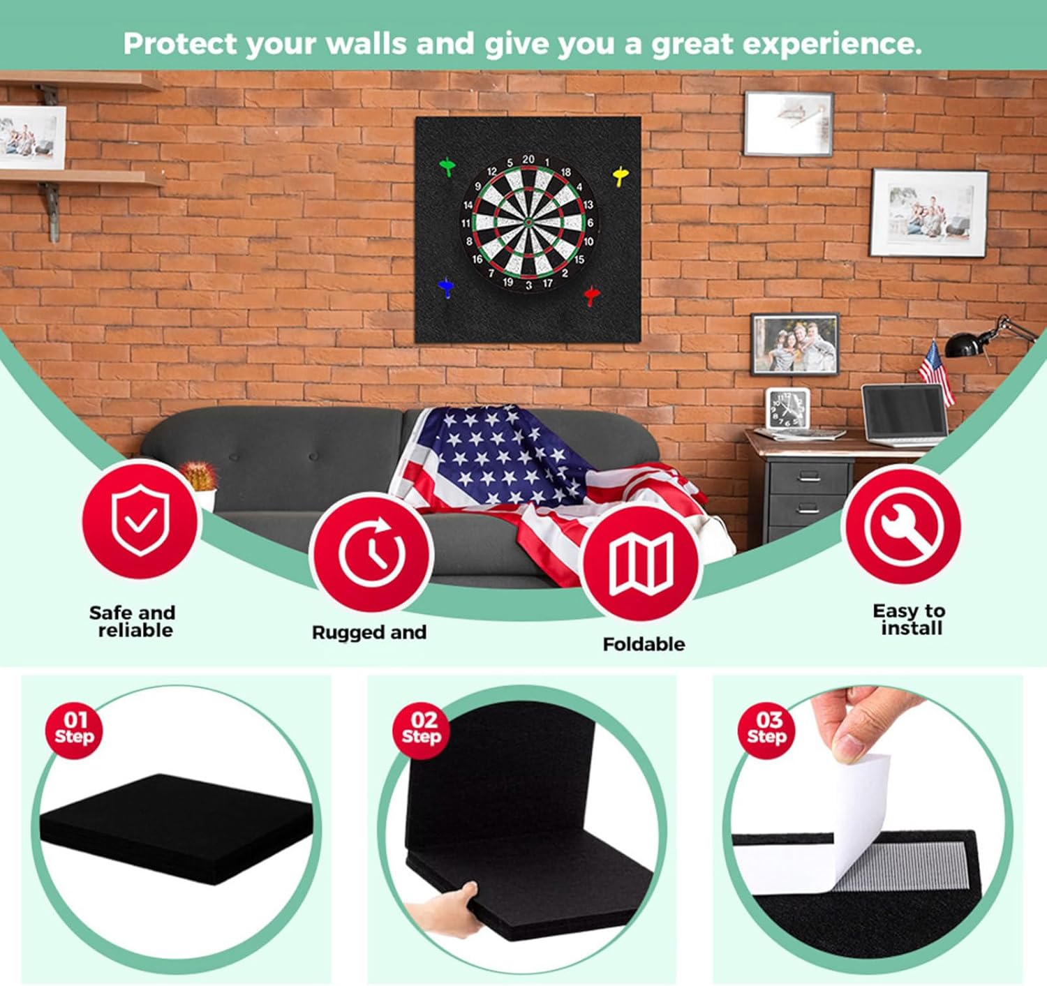 La nostra protezione da parete per bersaglio è realizzata in feltro nero, resistente e può essere applicata a lungo termine Si può facilmente decollare per la pulizia o la sostituzione, o semplicemente per cambiare posizione, fornendo la flessibilità di personalizzare perennemente le impostazioni di gioco delle freccette La nostra protezione per freccette in feltro, con le sue dimensioni impressionanti e spessa, funge da scudo che impedisce alle freccette di penetrare e danneggiare la parete e smontare, senza la necessità di strumenti o programmi complessi Può essere utilizzato in club, sale giochi, sale di casa, sale di formazione e altre varie occasioni, aiuta a ridurre al minimo il rumore causato dal colpo delle freccette