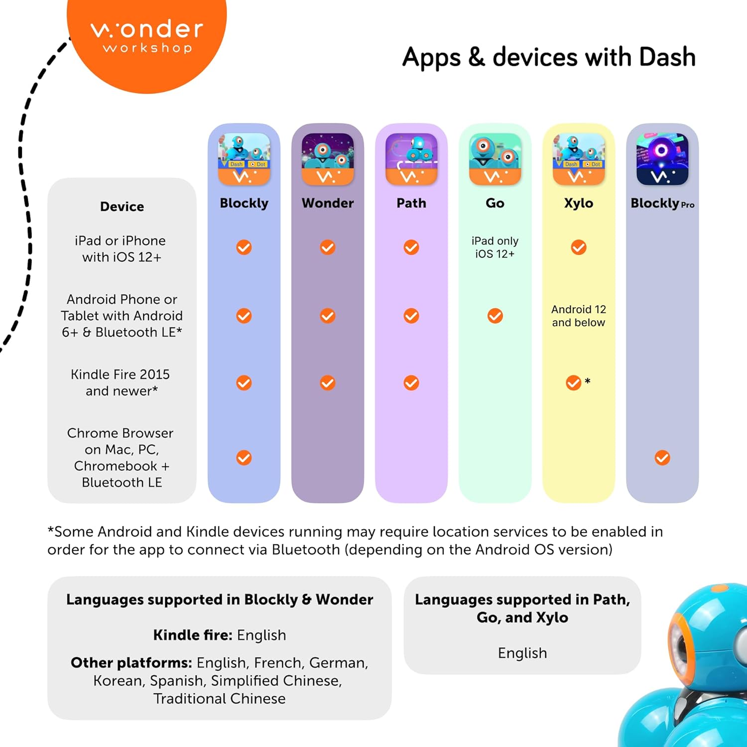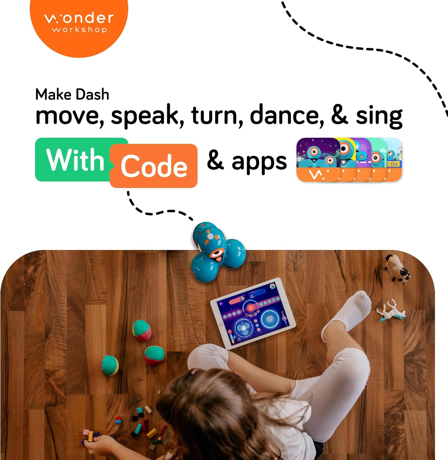 Il gioco è più divertente con Dash. Imparare a codice, come si gioca con i tuo nuovo amico robot Dash che completamente assemblati e pronti a giocare. Avete bisogno di un dispositivo compatibile interagire con Dasht. Utilizzare le applicazioni gratuite su Wonder workshop per controllare Dash attraverso Smart Bluetooth / LE per i dispositivi compatibile iOS & Android Dash interagire con il mondo utilizzando i suoi sensori. Puoi sentire i suoni, rilevare gli oggetti e sapere se è in movimento. Programma Dash di fare tutto ciò che potete immaginare. Consegnare un messaggio a un amico, avere una festa da ballo o anche la guida su un percorso ad ostacoli.