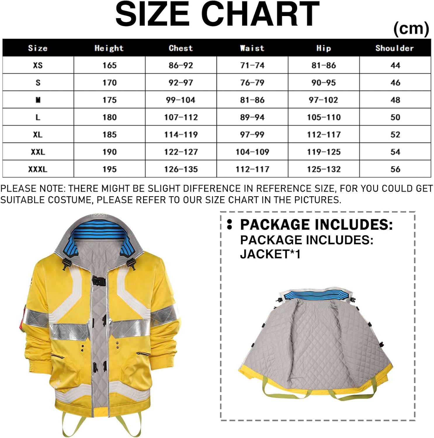 The jacket is highly accurate to the one seen within the game version of Cyberpunk, with the inclusion of various little details. It's very comfortable and made out of a higher-quality material that makes it look like an actual jacket, not a reflective glossy mess. The seller provided very fast shipping and even sent a smaller size when mine was larger than expected. I recommend purchasing a size smaller than average if you're a little shorter. Overall great jacket.