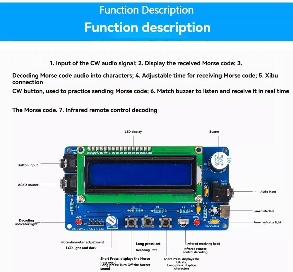 4. Regolare il tempo di ricezione del codice Morse; Funzioni: 1. Ingresso segnale audio CW; 2. Visualizzare il codice Morse ricevuto; 3. Decodificare l'audio del codice Morse ricevuto in caratteri; 5. Pulsante CW esterno per esercitarsi nell'invio del codice Morse;