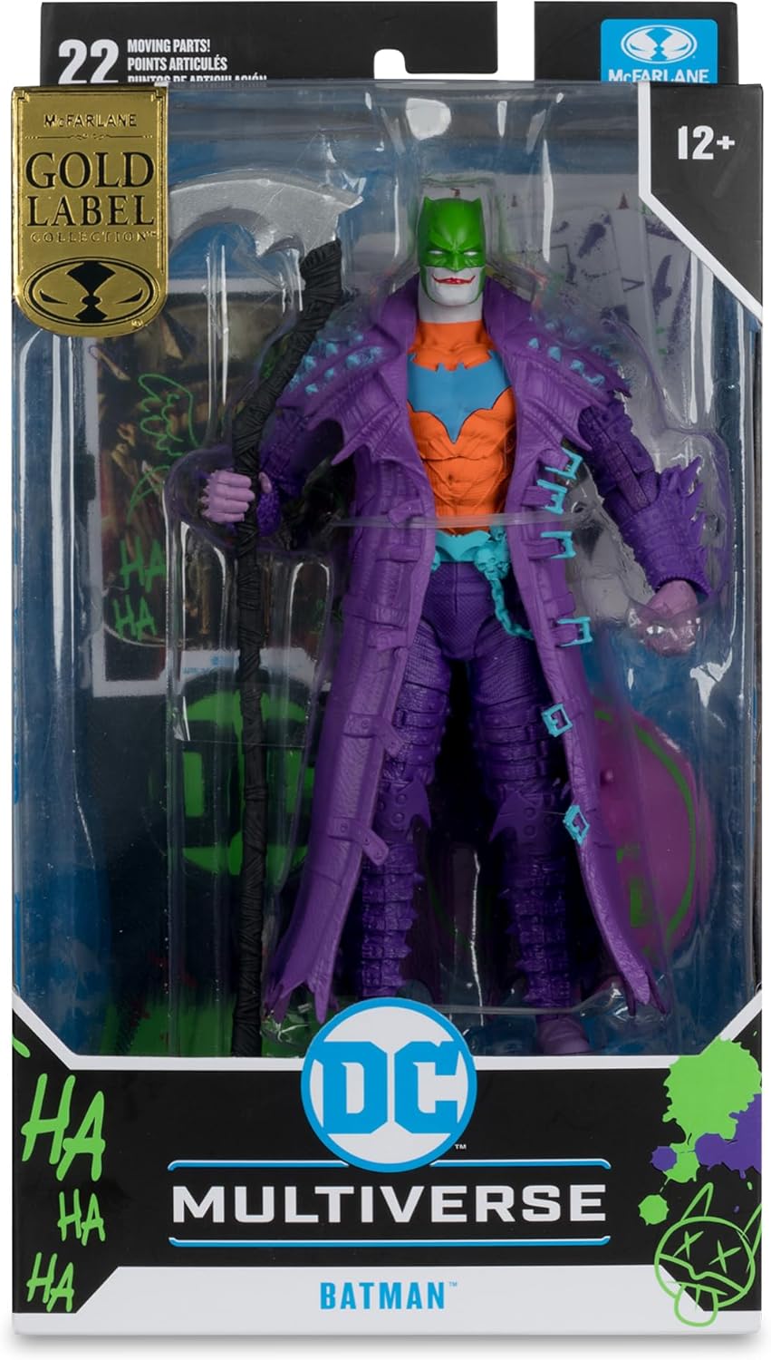 Figure in scala da 17,8 cm incredibilmente dettagliate basate sul multiverso DC Progettato con Ultra Articolazione con fino a 22 parti mobili per una gamma completa di posa e gioco Il Joker ha preso il sopravvento e apportato alcuni miglioramenti a Batman Batman viene fornito con una falce e una base di pipistrello Include accessori Jokeried: 4 carte da gioco, titolare della carta da collezione e base Colleziona tutte le figure McFARLANE TOYS DC MULTIVERSE