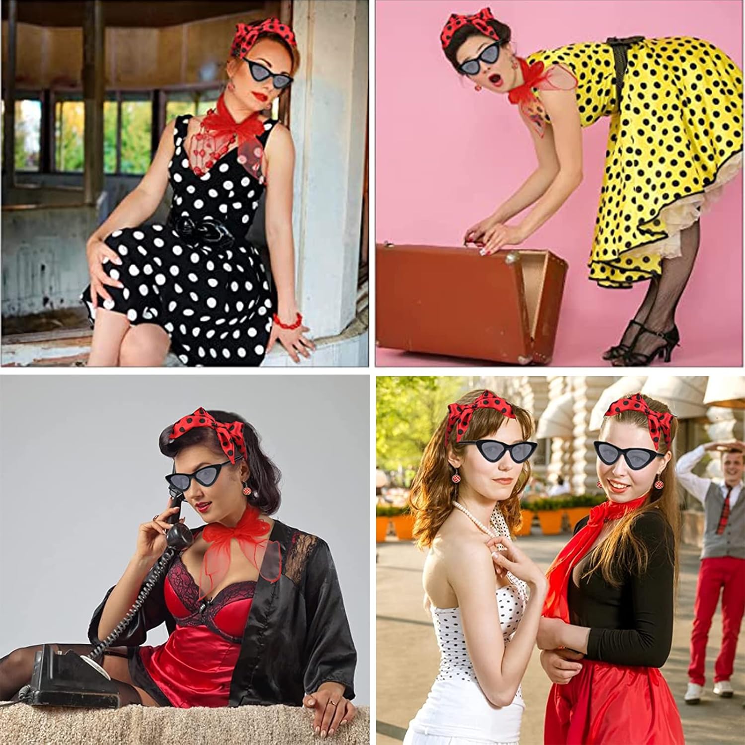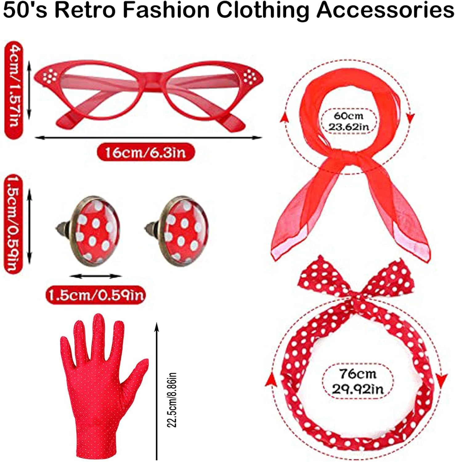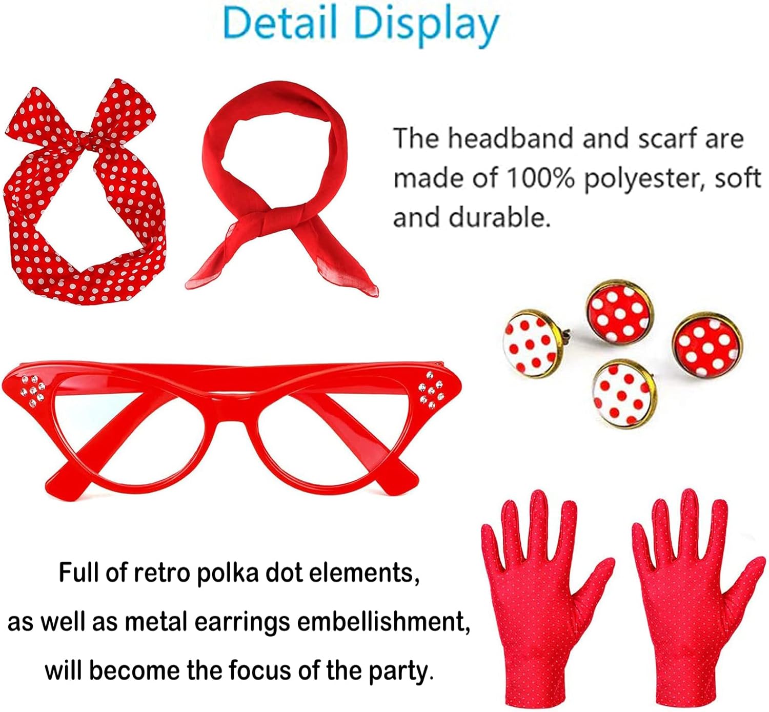 💕 【Alta qualità】 Gli occhiali sono realizzati in plastica di alta qualità, resistenti e lisci, con una lunga durata, la sciarpa di seta è in chiffon, sembra seta, traspirante, leggera, morbida e comoda da indossare, la fascia è in tessuto di alta qualità, sicura e affidabile, puoi usarlo con sicurezza. 💕【Moda vintage】 Gli accessori a pois popolari sono adatti per le feste rock negli anni '50, ti faranno sicuramente brillare e, allo stesso tempo, è anche un accessorio ideale per i carnevali, con queste decorazioni puoi ripristinare perfettamente il morbido stile di moda degli anni '50, aspetto elegante e affascinante. 💕【Set Super Value】 Riceverai 9 pezzi di accessori retrò degli anni '50, inclusi 4 orecchini, un paio di occhiali, un paio di guanti, una sciarpa di seta, un cerchietto, la quantità è grande, i colori sono versatili, tu può mescolare e abbinare la festa in costume, soddisfare le tue diverse esigenze di moda. 💕【Design unico】 Set da festa rock anni '50, occhiali con affascinante design cat-eye, fascia e orecchini con design a pois, molto affascinante ed elegante, la fascia può essere cambiata liberamente in base alla testa e alla coda per soddisfare le diverse esigenze, la sciarpa di seta è piena di mistero, leggero e nebuloso. 💕 【Ampia applicazione】 Questo set di accessori per costumi è appositamente progettato per donne e ragazze in stile retrò, perfetto per feste a tema anni '50, feste di compleanno anni '50, costumi e costumi anni '50, costumi di Halloween, feste in maschera, feste di Natale, attività in maschera anni '50 ecc.