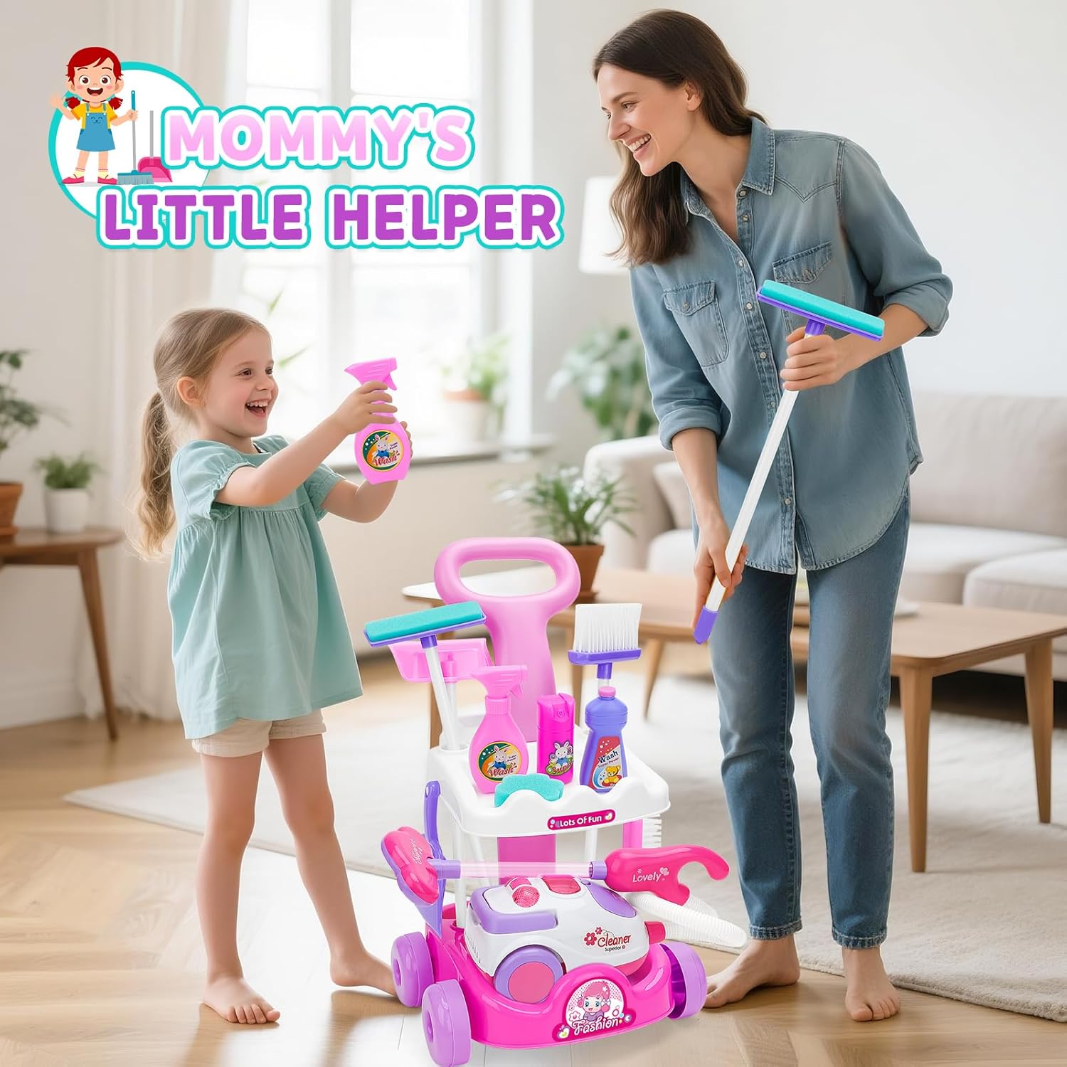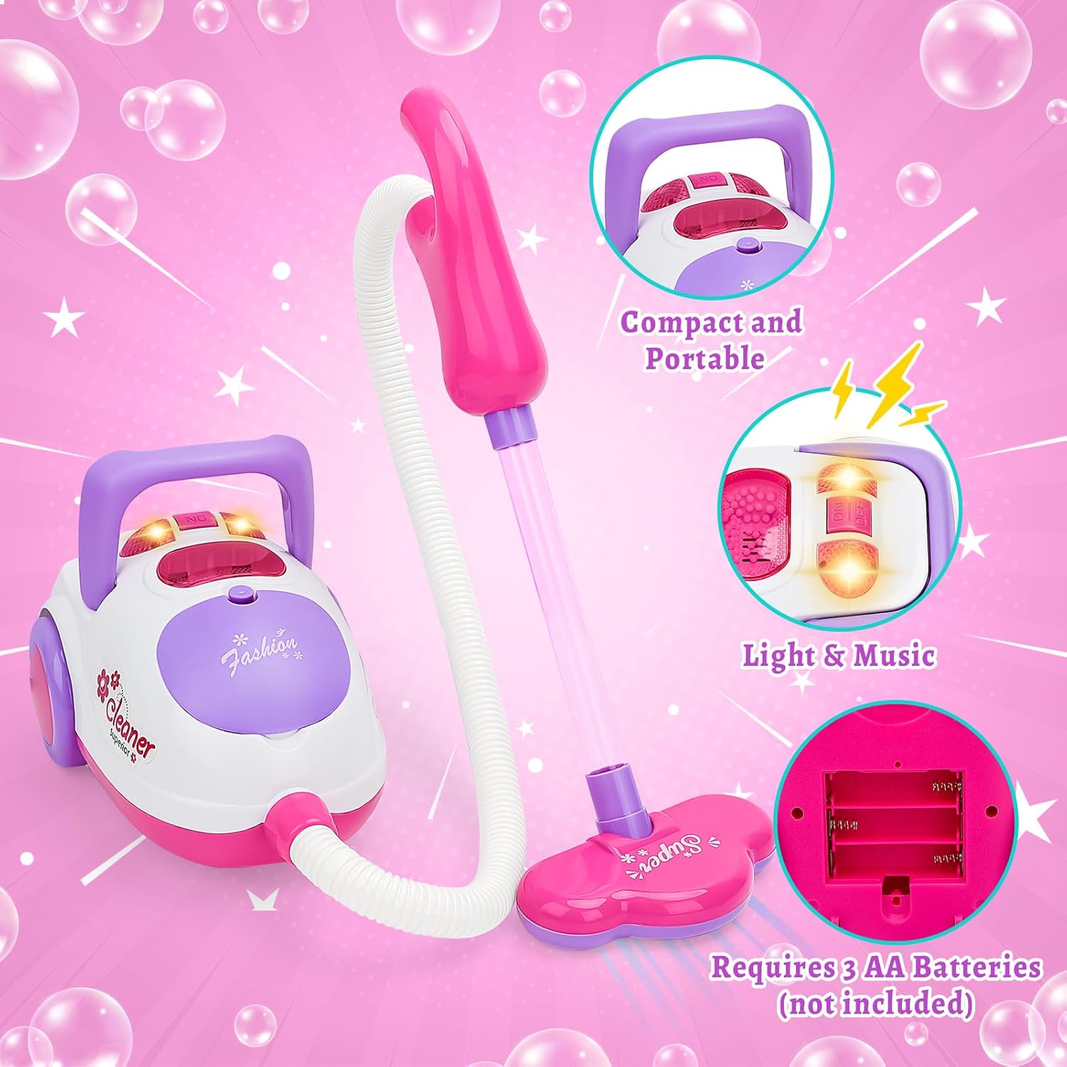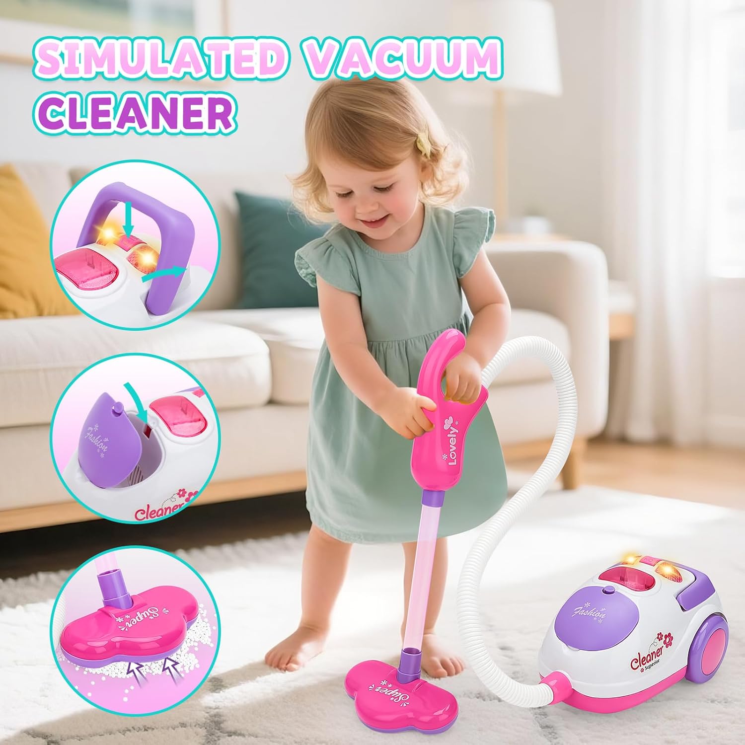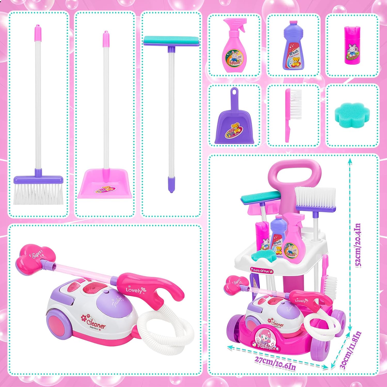 Set completo da 11 pezzi per piccoli aiutanti domestici: questo set completo di pulizia contiene tutto per giochi di pulizia realistici: aspirapolvere per bambini (con funzione di aspirazione), paletta, scopa, scopa, spazzole, spugne, detergenti per giocattoli, carrelli portaoggetti, ecc. Questo promuove in modo giocoso il senso di ordine e responsabilità nei bambini dai 3 anni in su! Aspirapolvere realistico con funzione di aspirazione e suono: il nostro aspirapolvere per bambini con suono di aspirazione simulato e funzione di aspirazione reale garantisce un'autentica esperienza domestica! Con effetti sonori realistici. I bambini potranno ricreare autentiche attività di pulizia domestica e vivere un'esperienza di gioco coinvolgente. (Alimentazione a batteria: sono necessarie 3 batterie AA da 1,5 V). Sicurezza testata e design durevole: realizzato in plastica ABS resistente di alta qualità con bordi arrotondati. Sviluppato appositamente per le mani dei bambini: nessun rischio di lesioni! La struttura stabile garantisce un divertimento duraturo per ragazzi e ragazze dai 3 anni in su. Giocattolo didattico prezioso dal punto di vista educativo: attraverso il gioco di ruolo i bambini sviluppano le capacità motorie, la coordinazione occhio-mano e il loro primo senso di responsabilità. Ideale per imitare le situazioni quotidiane: promuove l'indipendenza e ti fa venire voglia di lavorare in casa! Regalo perfetto per i piccoli aiutanti delle pulizie: il regalo educativo ideale per compleanni, Natale o occasioni speciali. Per bambini e bambine dai 3 anni in su che vogliono imparare giocando come orgogliosi collaboratori domestici. Include supporto per una facile organizzazione!