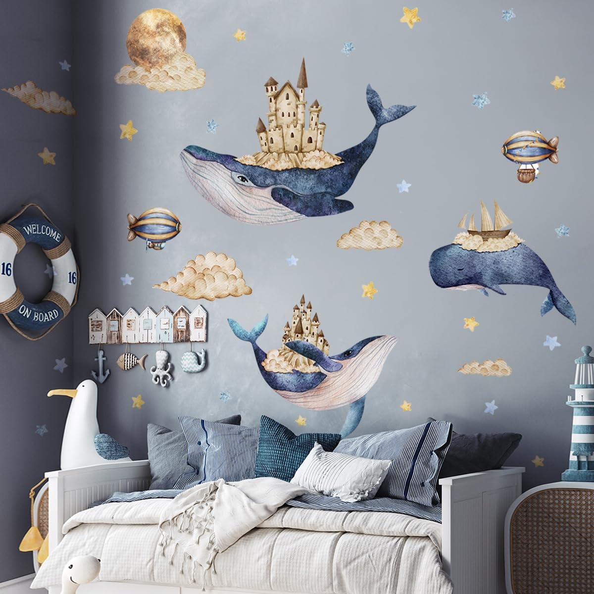 Dimensioni: set di adesivi da parete extra large che misura 232 x 130 cm, con più elementi decorativi che possono essere disposti in modo flessibile sulla parete Elementi di design: stravaganti opere d'arte ad acquerello includono balene blu, castelli, dirigibili vintage, stelle scintillanti e nuvole soffici Decorazione versatile: perfetta per asili, camerette dei bambini, sale giochi o qualsiasi spazio che abbia bisogno di un tocco di fantasia marittima e fantasia Diverse dimensioni: il set include decalcomanie di varie dimensioni che vanno da 44 x 20 cm a 91 x 36 cm, consentendo una disposizione creativa e personalizzazione FACILE APPLICAZIONE: il design Peel-and-Stick consente una semplice installazione e riposizionamento per ottenere il perfetto layout magico a tema oceanico