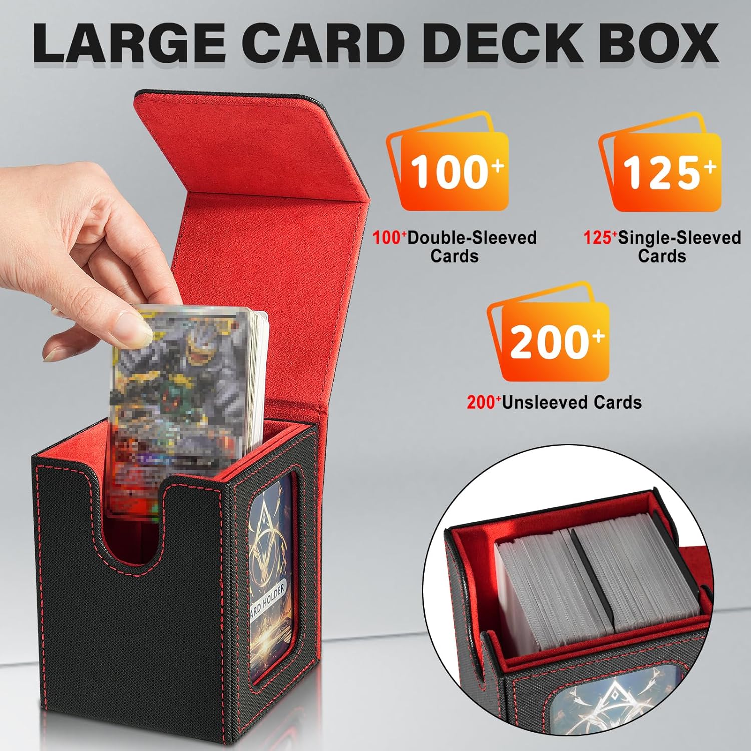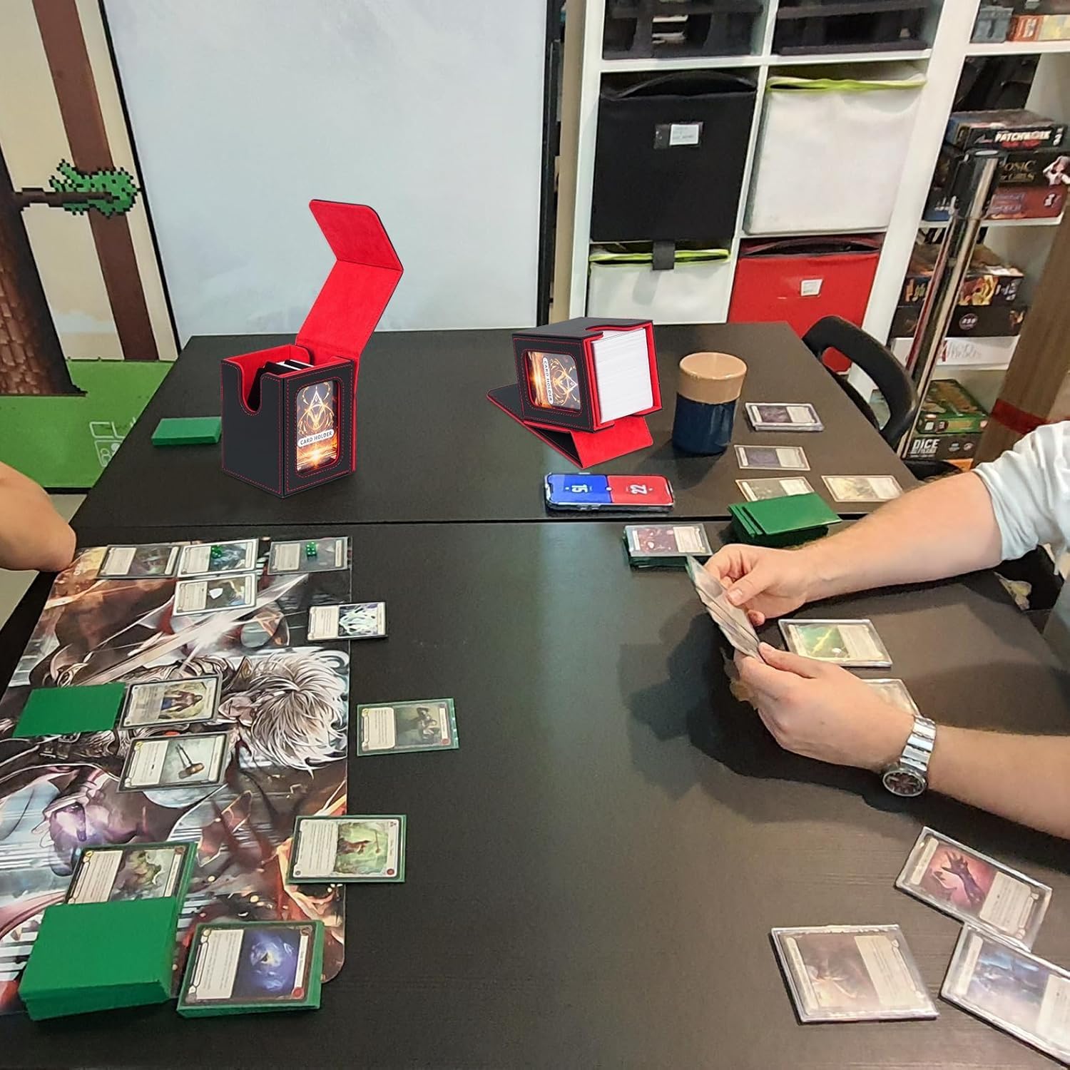 Design speciale:le custodie per carte collezionabili offrono una protezione e un'organizzazione senza pari per il tuo mazzo Magic The Gathering;con il design della finestra specifico per i giocatori di Commander EDH,questa scatola per mazzi premium è un must per qualsiasi appassionato di MTG o TCG Grande capacità:dimensioni:3,2 x 3,54 x 4,4 pollici(8.1*9*11.2 cm),questa scatola per mazzi di carte può contenere fino a 100 carte a doppia bustina o oltre 120 carte a bustina singola o 200+ carte senza bustina,offre ampio spazio per il tuo mazzo di carte Facile da accedere:progettato pensando alla praticità,la scatola per riporre il mazzo di carte ha un'ampia apertura a forma di U e un design con coperchio a ribalta che consente di recuperare facilmente le tue carte,rendendo il gioco fluido e senza problemi Protezione completa:la scatola per mazzi Commander è realizzata in una resistente custodia in pelle PU ed è rinforzata con potenti magneti per una chiusura sicura;puoi essere certo che le tue carte sono ben protette da danni esterni;con il suo design leggero e compatto,che tu sia un MTG o qualsiasi altro gioco di carte appassionato,questa scatola per mazzi è un compagno affidabile per conservare e proteggere le tue amate carte Il pacchetto include:ogni scatola per carte collezionabili è dotata di due divisori per carte e un porta carte senza costi aggiuntivi