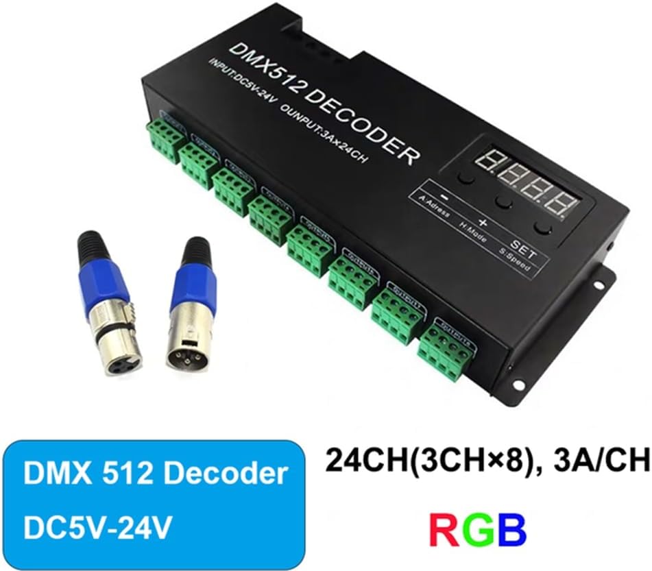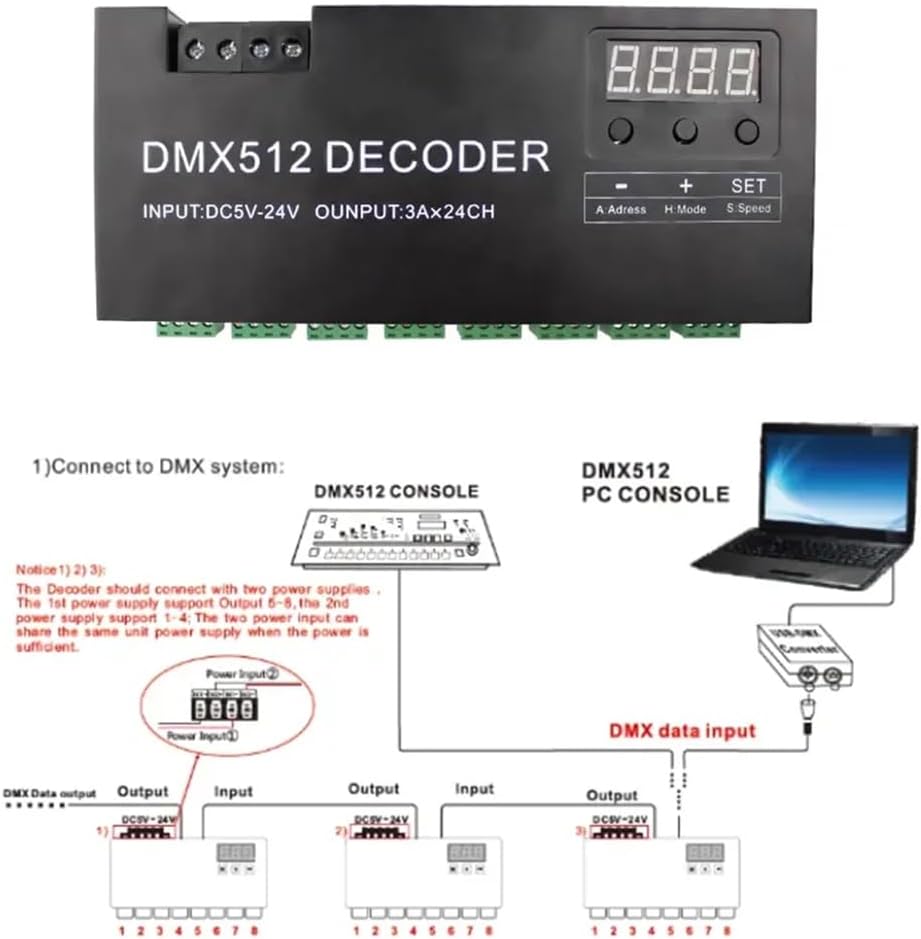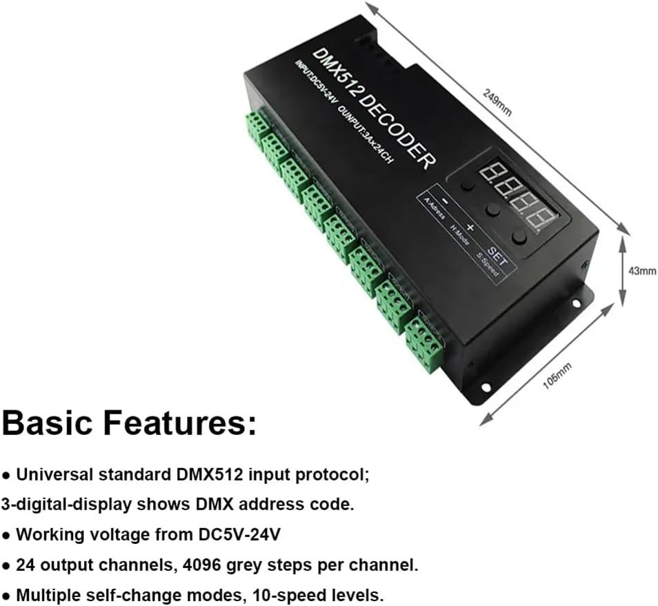 2. La console può controllarlo e può essere collegata a un numero di decoder per aumentare la potenza in uscita e realizzare tutti i tipi di modalità di cambiamento. 3. Questo decoder può essere utilizzato come controller sincrono per controllare solo il LED, può realizzare effetti sincroni. 1. Questo decodificatore adotta un chip di controllo computerizzato avanzato, può ricevere i segnali di controllo digitale standard internazionale -512 e convertirli in un segnale di controllo PWM per pilotare il LED. 4. Questo decodificatore adotta il tubo digitale per mostrare il codice 'indirizzo e 3 pulsanti per l'impostazione ne facilitano l'utilizzo.