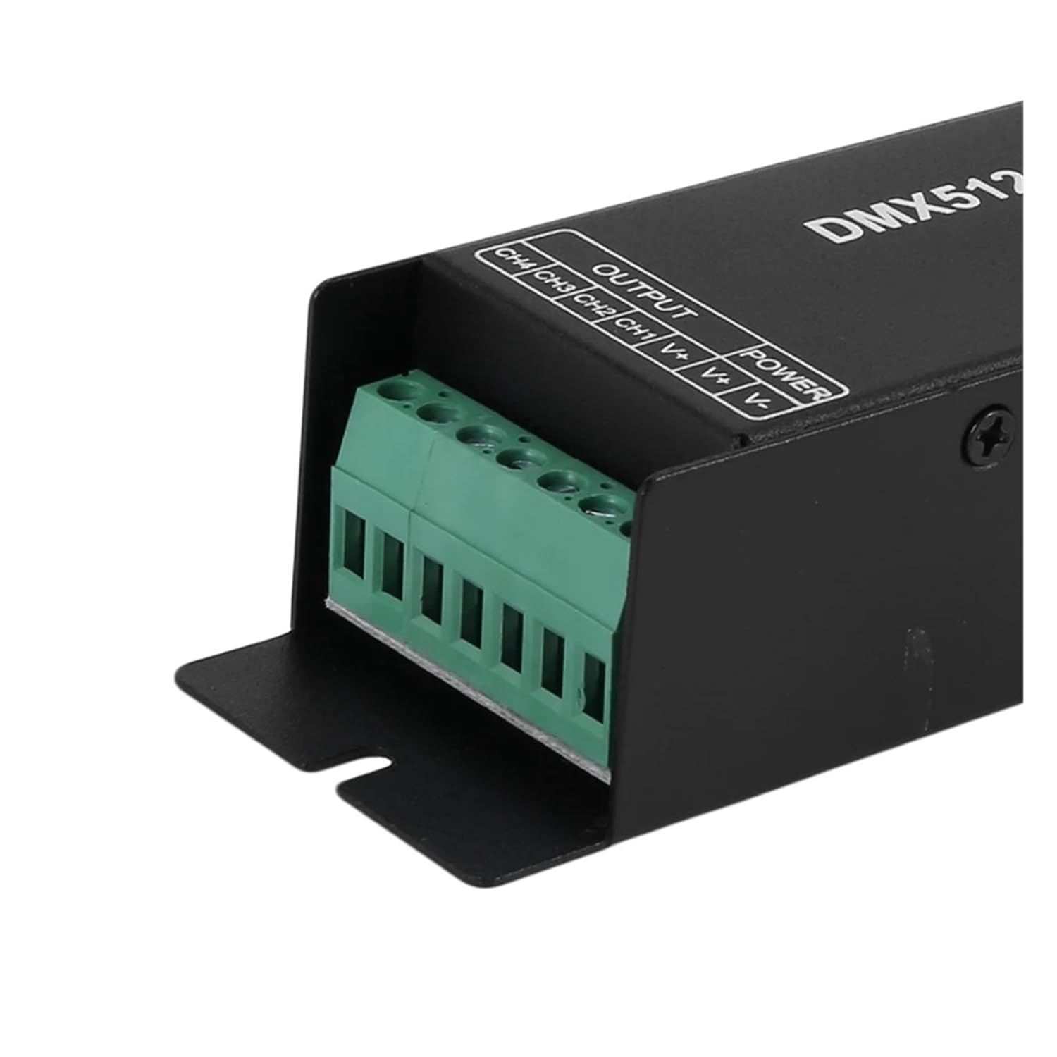 Componenti per l'illuminazione Corrente di uscita: ≤8A/CH (Nota: la corrente totale superiore a 20A ridurrà la durata del prodotto) Voltaggio in ingresso: DC12V~24V (potenza in uscita: 12V: meno di 384W, 24V: meno di 768W) Temperatura di lavoro: -20-60 gradi Norma DMX512: DMX512/1990 Il decoder DMX utilizza un chip di controllo computerizzato avanzato, che può ricevere il segnale di controllo digitale standard internazionale DMX-512 e convertirlo in un segnale del controller PWM for pilotare il LED. Può essere controllato tramite console DMX ed è possibile collegare più decoder DMX for aumentare la potenza in uscita e ottenere varie modalità di cambiamento. Inoltre, il decoder DMX può essere utilizzato anche come controller di sincronizzazione for controllare individualmente i LED e ottenere effetti di sincronizzazione. Questo decodificatore utilizza un tubo digitale for visualizzare il codice 'indirizzo e dispone di 3 pulsanti for l'impostazione, che lo rendono più comodo da usare. Colore: nero materiale: plastica Dimensioni: 166 x 67 x 41 mm
