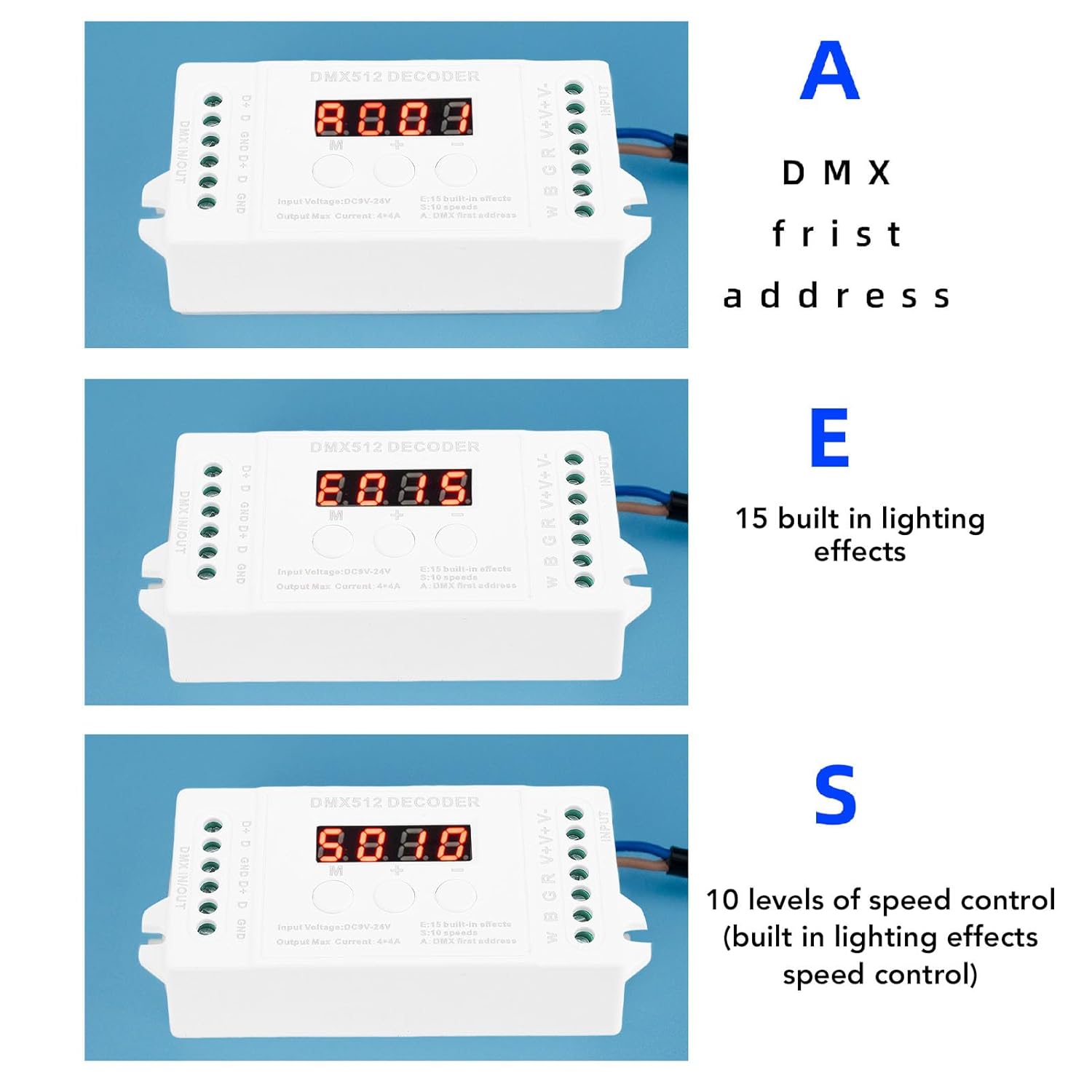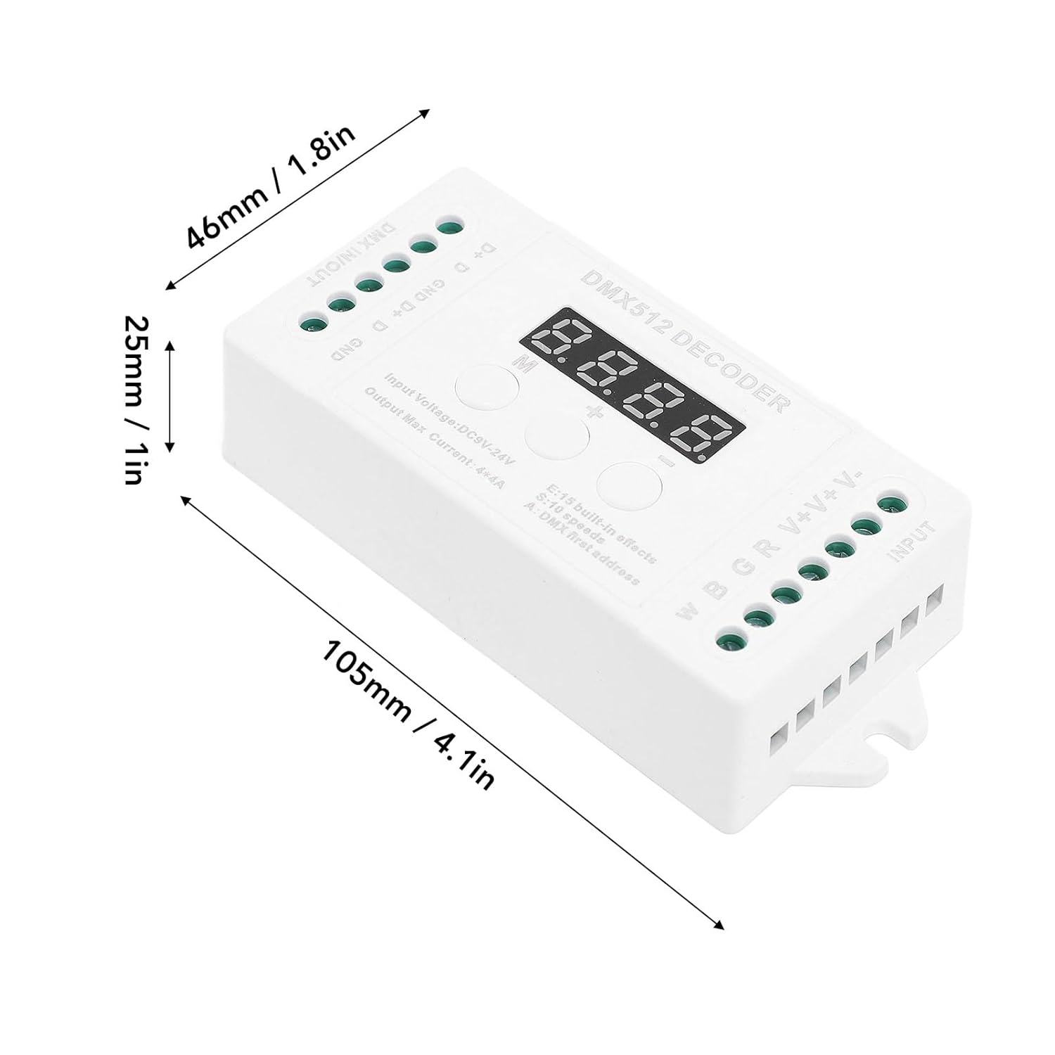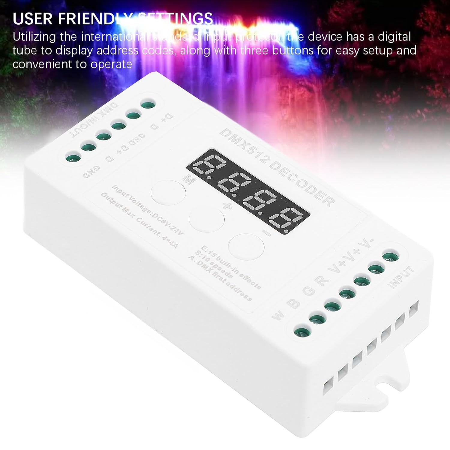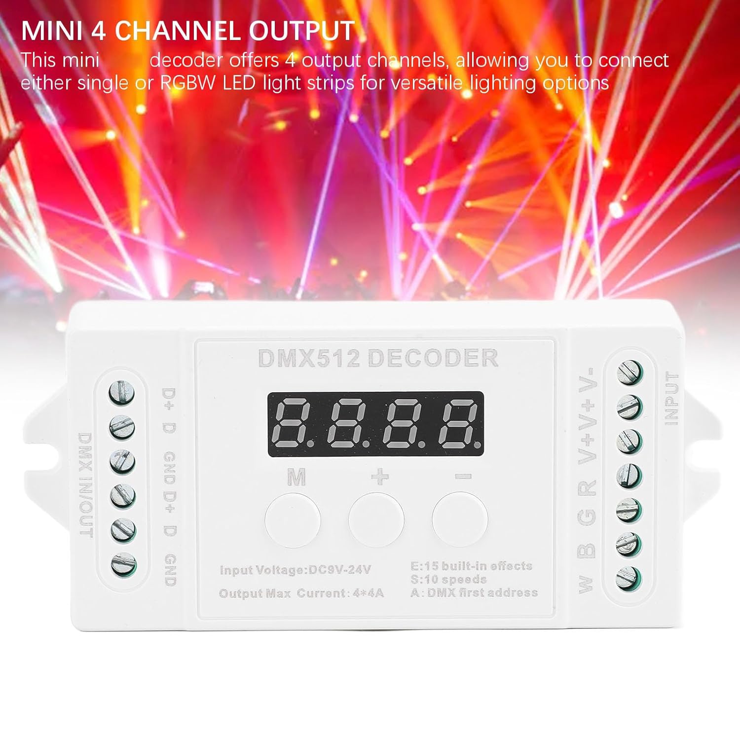 [Uscita ad alte prestazioni] Supporta ampio intervallo di tensioni di ingresso da DC9V a DC24V, il decoder offre una potenza di uscita massima di 192 W (12 V) e 384 W (24 V) per prestazioni di illuminazione scenica RGBW impressionanti. [Configurazione semplice] Utilizzando protocollo di input standard internazionale, il dispositivo è dotato di display a tubo digitale per codici di indirizzo e pulsanti intuitivi [Controllo versatile 'illuminazione] Questo mini decoder a 4 offre 4 di uscita per strisce luminose a LED singole o RGBW, garantendo opzioni di illuminazione versatili. [Effetti di luce dinamici] Dotato di 15 effetti integrati e 8 modalità dinamiche con cambi di velocità regolabili, fornendo illuminazione dinamica per vari eventi. [Funzione di attenuazione uniforme] Con intervallo di attenuazione 'uscita compreso tra 0 e e 256 livelli di grigio per canale, goditi controllo preciso sull'intensità 'illuminazione.
