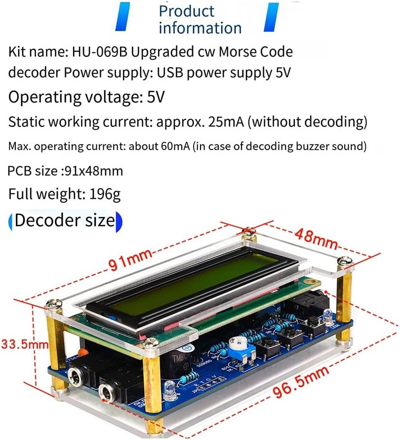 3. Decodificare il codice audio Morse ricevuto in caratteri. 4. Mostra tasso di codice di ricezione 1. Ingresso segnale audio cw 2. Visualizza il codice Morse ricevuto. 5. Imposta l'ora di ricezione del codice Morse. Pulsante CW esterno, utilizzato per allenarsi per inviare codice Morse. Ascolta il codice Morse ricevuto in tempo reale con un cicalino.