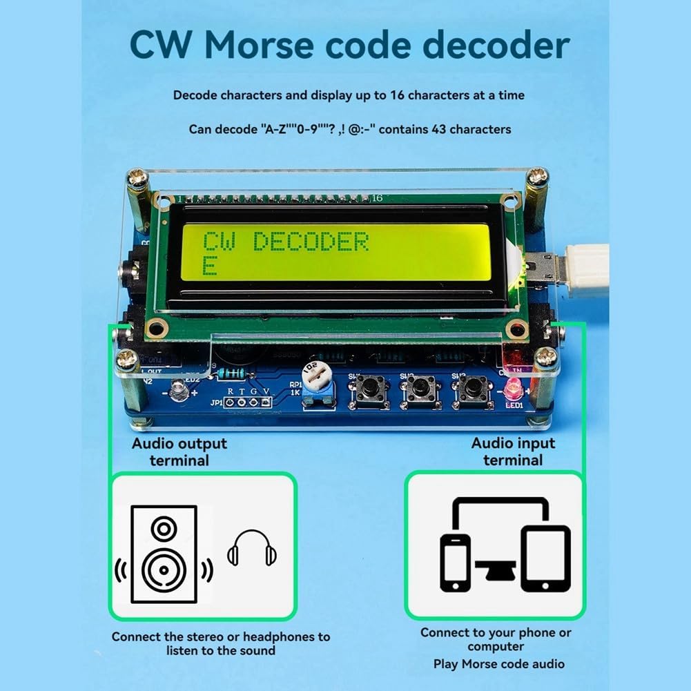 Le parti fai-da-te richiedono che tu sia saldato e assemblato da solo e sono necessari anche strumenti di saldatura. Aggiornamento delle funzioni, funzionamento più semplice e conveniente, supporto della decodifica audio, pulsante CW esterno, può decodificare direttamente l'audio del codice Morse ricevuto in caratteri, velocità di decodifica regolabile, cicalino. Decodificatore del codice Morse CW migliorato, layout della scheda e dei componenti ottimizzato, migliore installazione. Tono simulato, cambio di tono libero, facilita la comprensione dell'apprendimento del codice Morse.