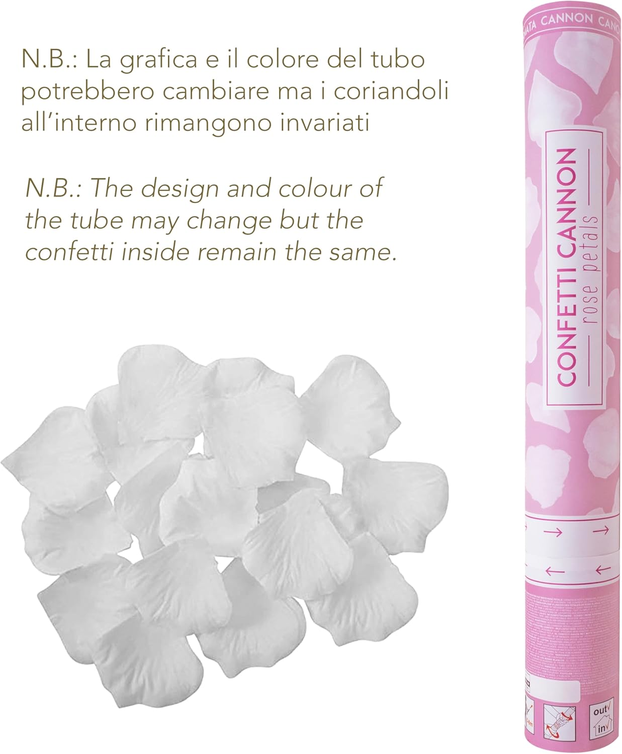 [SET 6 SPARACORIANDOLI] Una pioggia di petali che danza in aria alla tua festa: con il tubo sparacoriandoli Decoraparty, doni un tocco magico e poetico a ogni tuo evento speciale. Effetto wow assicurato. [CORIANDOLI A PETALI] I coriandoli sono a forma di petali, perfetti per matrimoni, feste di compleanno e celebrazioni eleganti. Realizzati in poliestere, si sollevano delicatamente nell'aria creando un effetto visivo suggestivo per tutti i presenti. [DETTAGLI] Con una gittata di circa 5-8 metri, il tubo sparacoriandoli crea un effetto scenografico perfetto per vari contesti. Con un semplice gesto, una pioggia di coriandoli vivaci si libera nell'aria, rendendo unica ogni occasione di festa. [UTILIZZO] Tenere il tubo saldamente con due mani, ruotare il fondo nel verso indicato e, in un attimo, i coriandoli vengono proiettati in aria, creando uno splendido effetto a cascata che sorprenderà tutti i presenti. [NOTA BENE] Il prodotto non è un gioco pirotecnico; i coriandoli fuoriescono grazie alla pressione nel tubo. Tenere lontano dalla portata dei bambini. Non puntare sul viso. Si consiglia l'utilizzo in ambienti all'aperto o in spazi ampi, lontano da oggetti infiammabili.