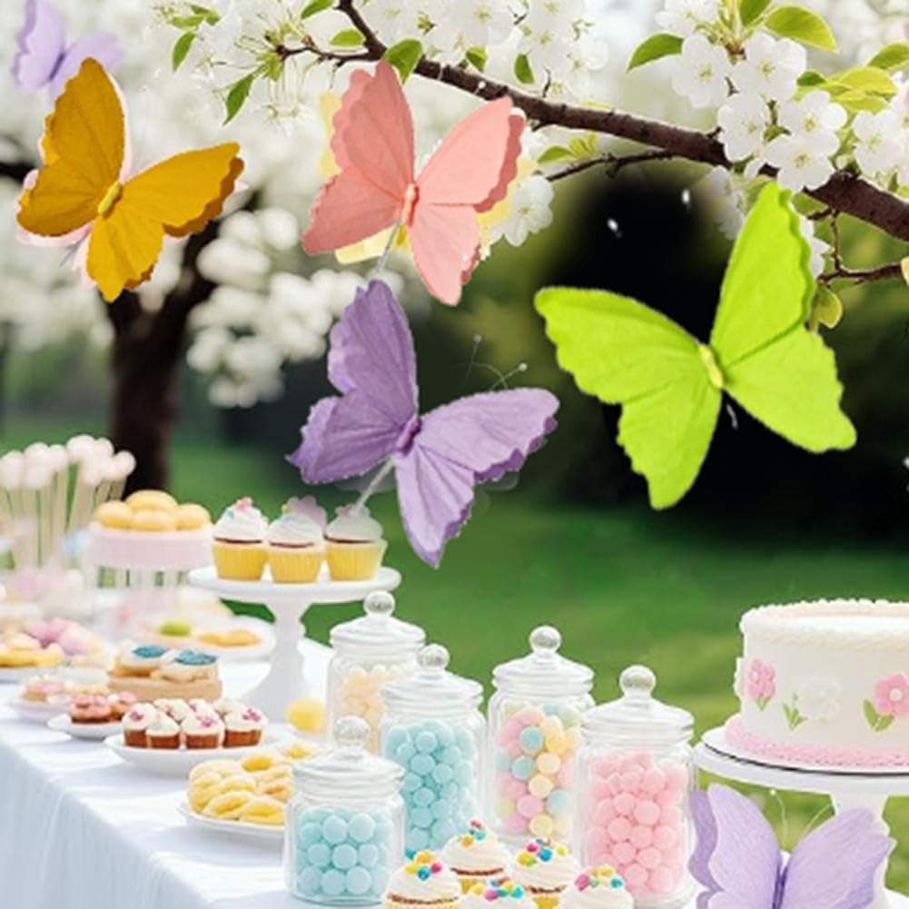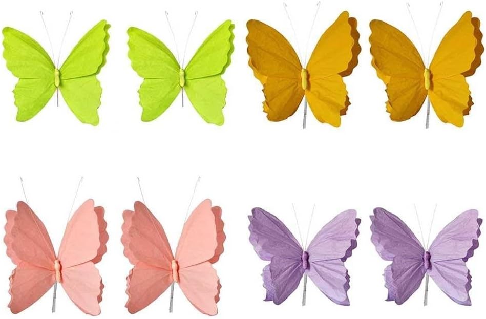 [SCELTA DI COLORI] Queste decorazioni a farfalla per il giardino offrono una splendida gamma di colori, tra cui rosa antico, giallo, viola e verde chiaro, e portano magnifiche tonalità a qualsiasi giardino. [DESIGN 3D] Ogni farfalla in stile 3D accattivante crea un effetto visivo sorprendente che migliora l'atmosfera di feste e riunioni. Decorazione adesiva: queste farfalle sono adatte per diverse occasioni e fungono da accenti affascinanti per feste, eventi in giardino o anche come decorazione giocosa nella cameretta dei bambini. [FACILE DA APPENDERE] Le farfalle di carta leggere e facili da montare possono essere facilmente appese a soffitti, alberi o pareti e sono una decorazione rapida. Nota sulle taglie: ogni farfalla misura circa 32 x 30 cm. Si prega di controllare lo spazio prima di appenderlo.