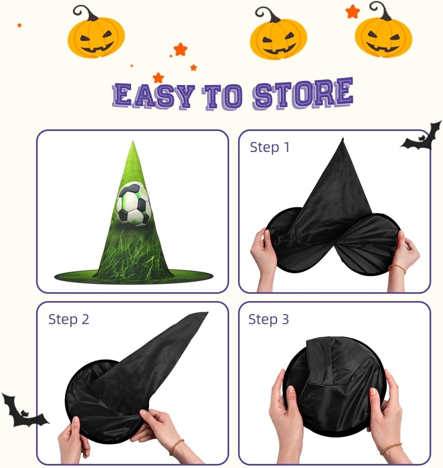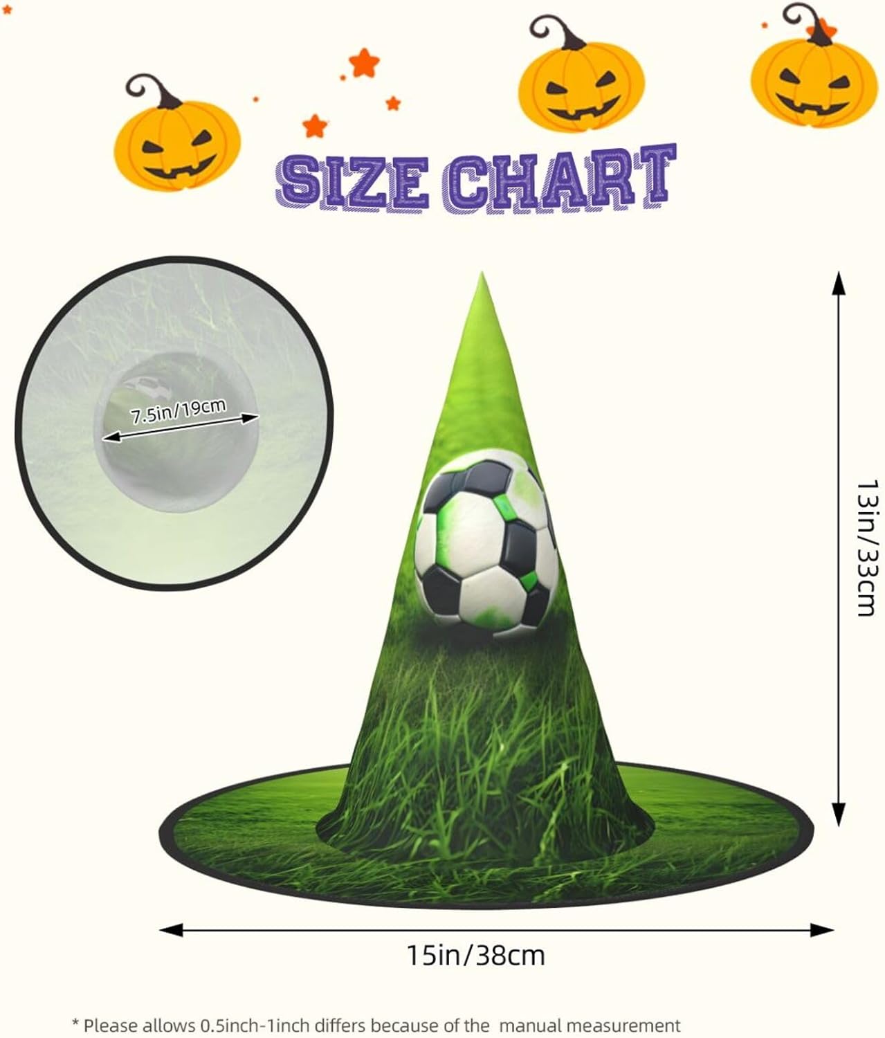 Realizzati in tessuto Oxford di qualità superiore, i nostri cappelli con stampa di calcio verde erba garantiscono durata e longevità. Il design unico consente di ridurre al minimo la parte superiore del cappello e i bordi di essere attorcigliati e piegati, rendendo i cappelli salvaspazio e facilmente portatili. Ogni cappello con stampa di calcio verde erba è generosamente dimensionato per adattarsi alla maggior parte delle persone ed è leggero per un uso confortevole. Si prega di leggere la tabella delle taglie prima di effettuare l'ordine. Il design versatile dei nostri cappelli da strega di Halloween con stampa di calcio verde li rende perfetti per varie occasioni. Sono lavabili in lavatrice e ad asciugatura rapida per una facile manutenzione.