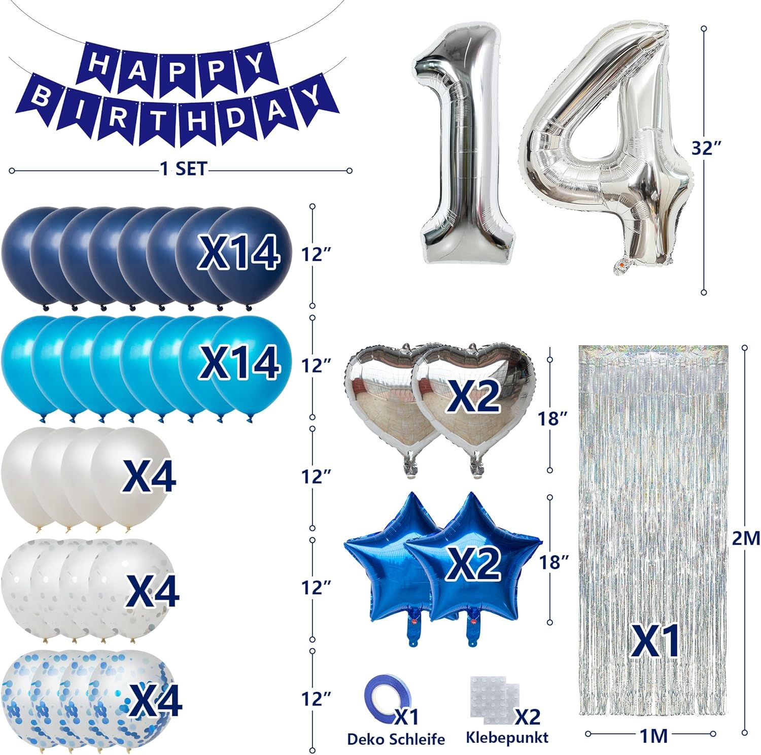 Set completo di palloncini per il 14° Compleanno】: questo set di decorazioni per palloncini blu è appositamente progettato per il 14° compleanno delle ragazze e contiene 40 palloncini in lattice, 2 stelle a cinque punte, 2 cuori e un palloncino in alluminio "14". Il set di decorazioni per compleanno comprende anche 1 striscione "Happy Birthday", colla per palloncini, 1 tenda in metallo (1 m x 2 m) e nastri, in modo da poter decorare rapidamente la festa. Tutto in un unico set: consente di risparmiare tempo e fatica. Set di decorazioni per feste di compleanno per il 14° compleanno: il set di palloncini decorativi per compleanno utilizza il blu come colore principale, perfetto per creare l'atmosfera di un 14° Compleanno per Giovane Donna. I palloncini accuratamente selezionati non sono solo armoniosi e romantici, ma anche pieni di giovinezza ed energia. Che si tratti di scattare foto con gli amici o per festeggiare con la famiglia, questa decorazione a palloncino diventerà il centro dell'attenzione e lascerà bei ricordi. Facile da installare, senza sforzo: non preoccuparti di decorazioni elaborate: questo set di decorazioni per 20° compleanno è già assemblato con cura e tutti gli accessori sono inclusi. Basta gonfiare, appendere lo striscione, attaccare la tenda in metallo – e l'atmosfera della festa è arrivata. Così puoi rilassarti e festeggiare con i tuoi amici e familiari. Uso durevole: realizzati con materiali di alta qualità, i palloncini in lamina di alluminio e lattice sono molto robusti e durevoli. Puoi riempirli con elio per far galleggiare i palloncini nell'aria e creare una magica atmosfera per feste di compleanno. Anche con un uso prolungato, i palloncini rimangono in buone condizioni e garantiscono un divertimento duraturo. Servizio clienti amichevole: ci impegniamo sempre a fornire ai nostri clienti un'esperienza di acquisto di alta qualità e siamo a vostra disposizione 24 ore per rispondere e garantire le domande. Scegliete il nostro set di decorazioni di compleanno per rendere la vostra festa ancora più speciale e dare al vostro compleanno un tocco brillante