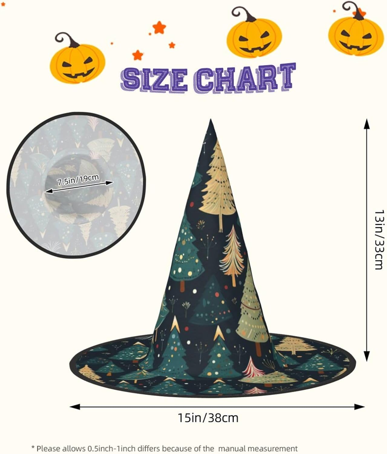 Realizzato in tessuto Oxford, il cappello con stampa albero di Natale promette comfort che durerà per molti Halloween a venire. È leggero, facile da trasportare e versatile, consente di ruotare e piegare i bordi per risparmiare spazio. Con dimensioni precise, il cappello con stampa dell'albero di Natale è progettato per ospitare la maggior parte delle persone. Usalo per feste di Halloween, carnevale, feste in maschera o eventi di gioco di ruolo e lascia che il tuo affascinante fascino avvolga la folla. Facile da pulire e veloce da asciugare, il nostro cappello da strega offre una combinazione ideale di praticità e fascino.
