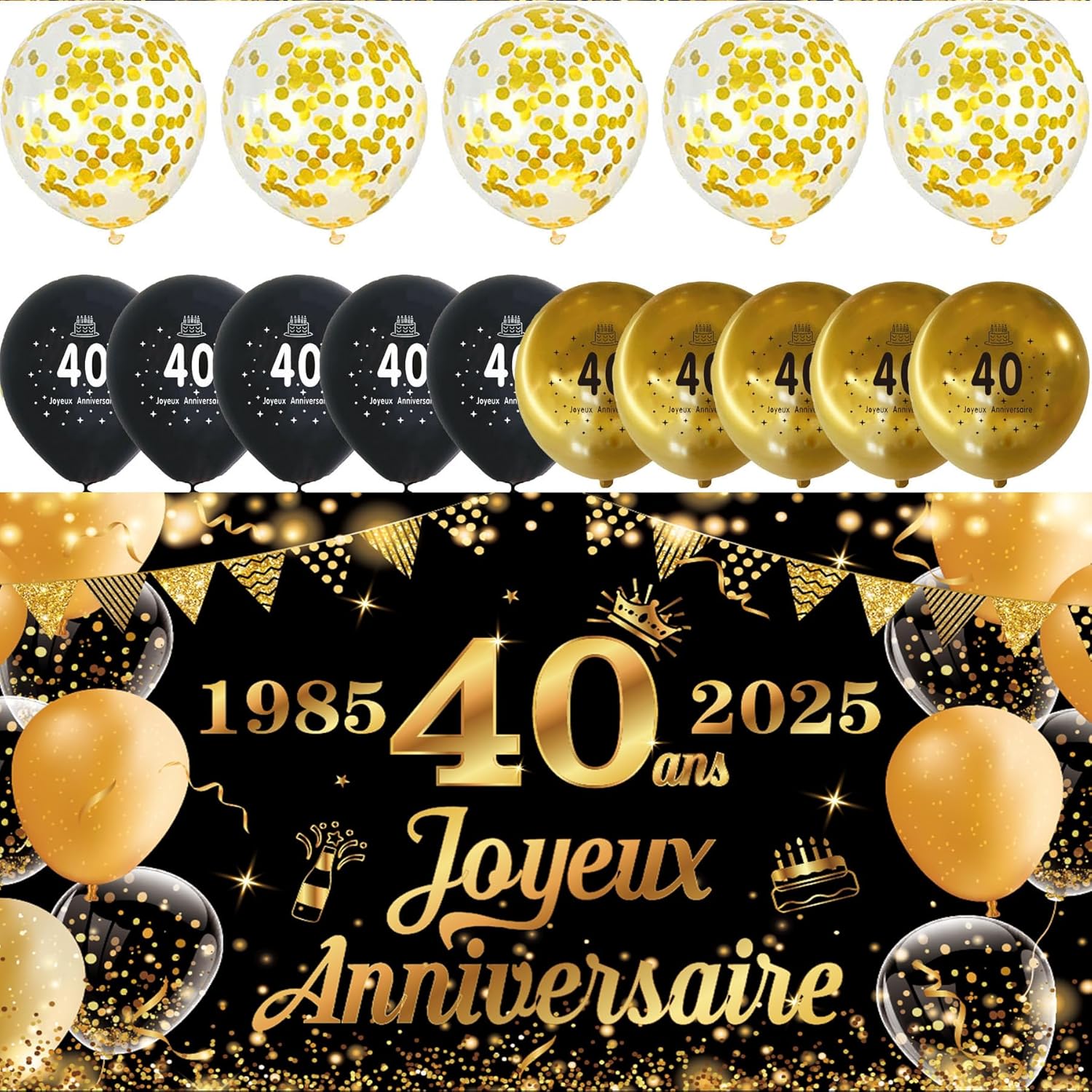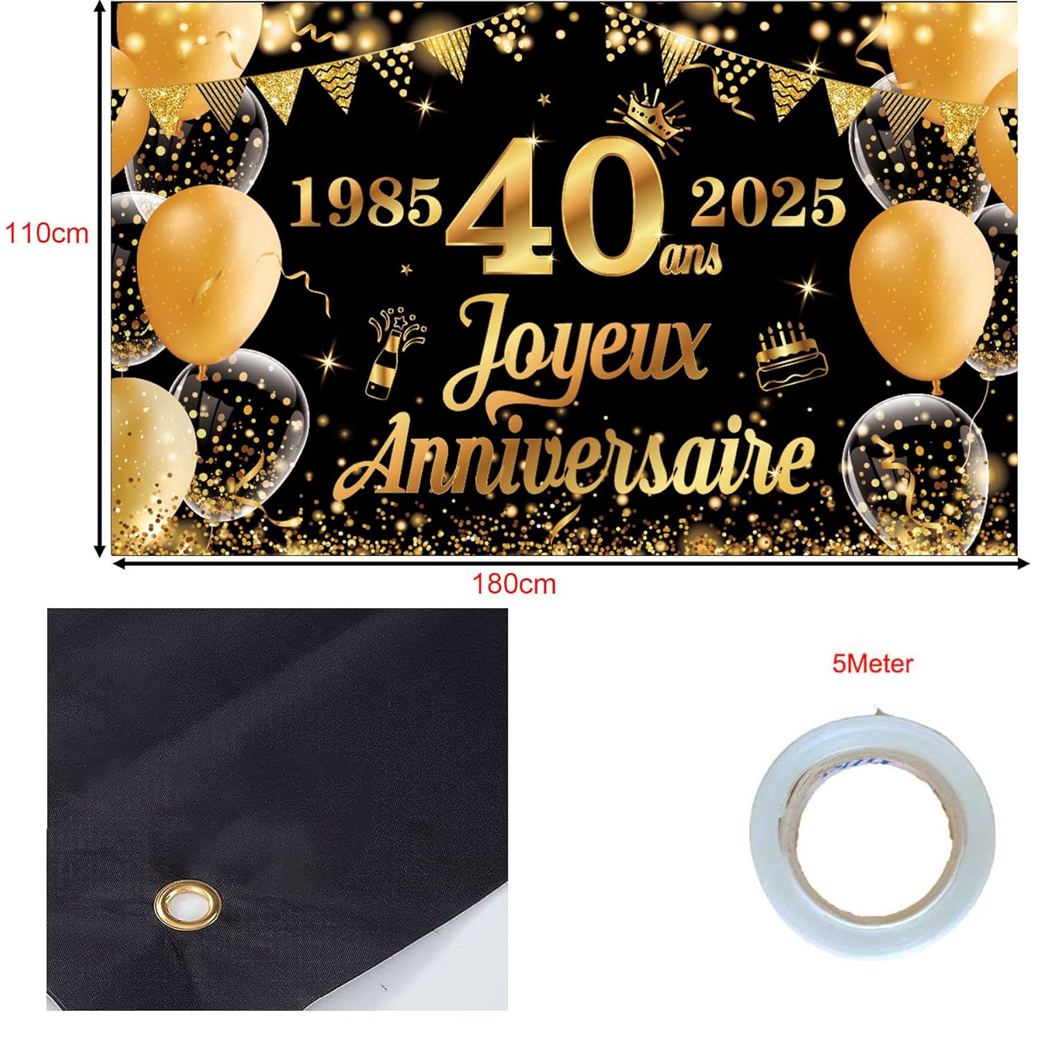 Contenuto della confezione: 1 striscione per il 40° compleanno + 1 nastro. Materiale: il banner è realizzato in poliestere. Design raffinato - Lo striscione (colore nero) è molto sorprendente con le scritte francesi Happy 40th Birthday. Facile da usare: dotato di un nastro, è facile da appendere ovunque tu voglia. Decorazione perfetta: una buona combinazione per decorare le tue feste per il 40° compleanno.