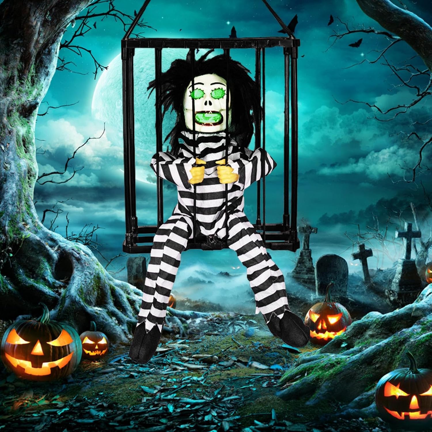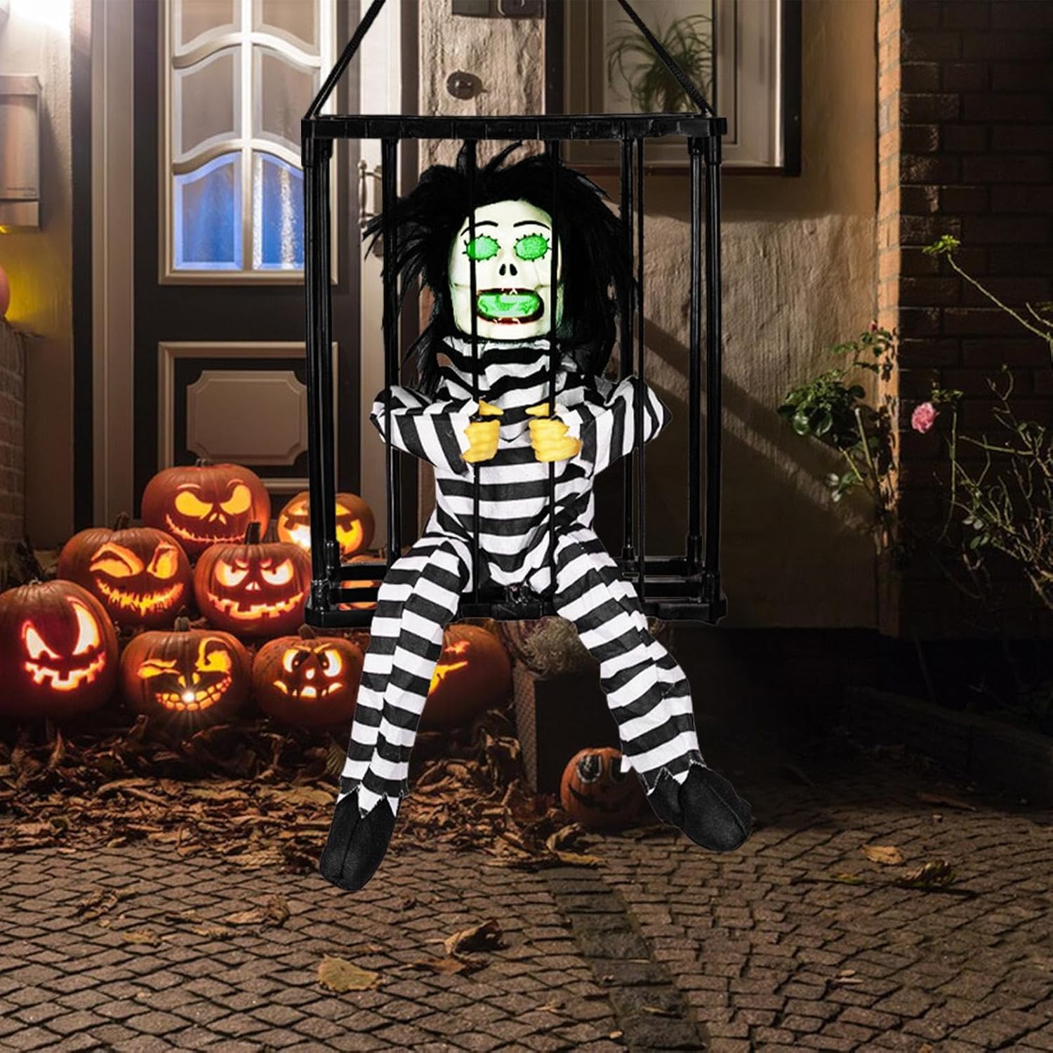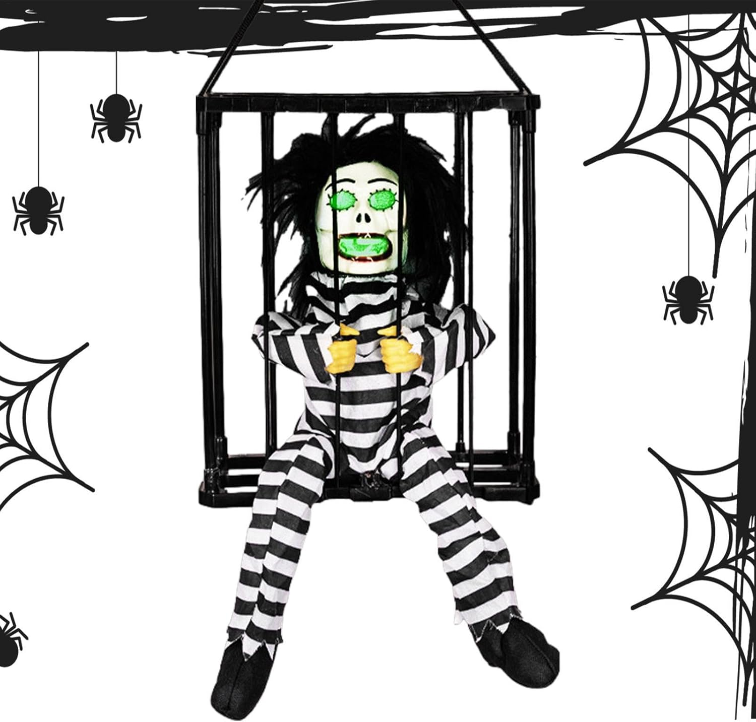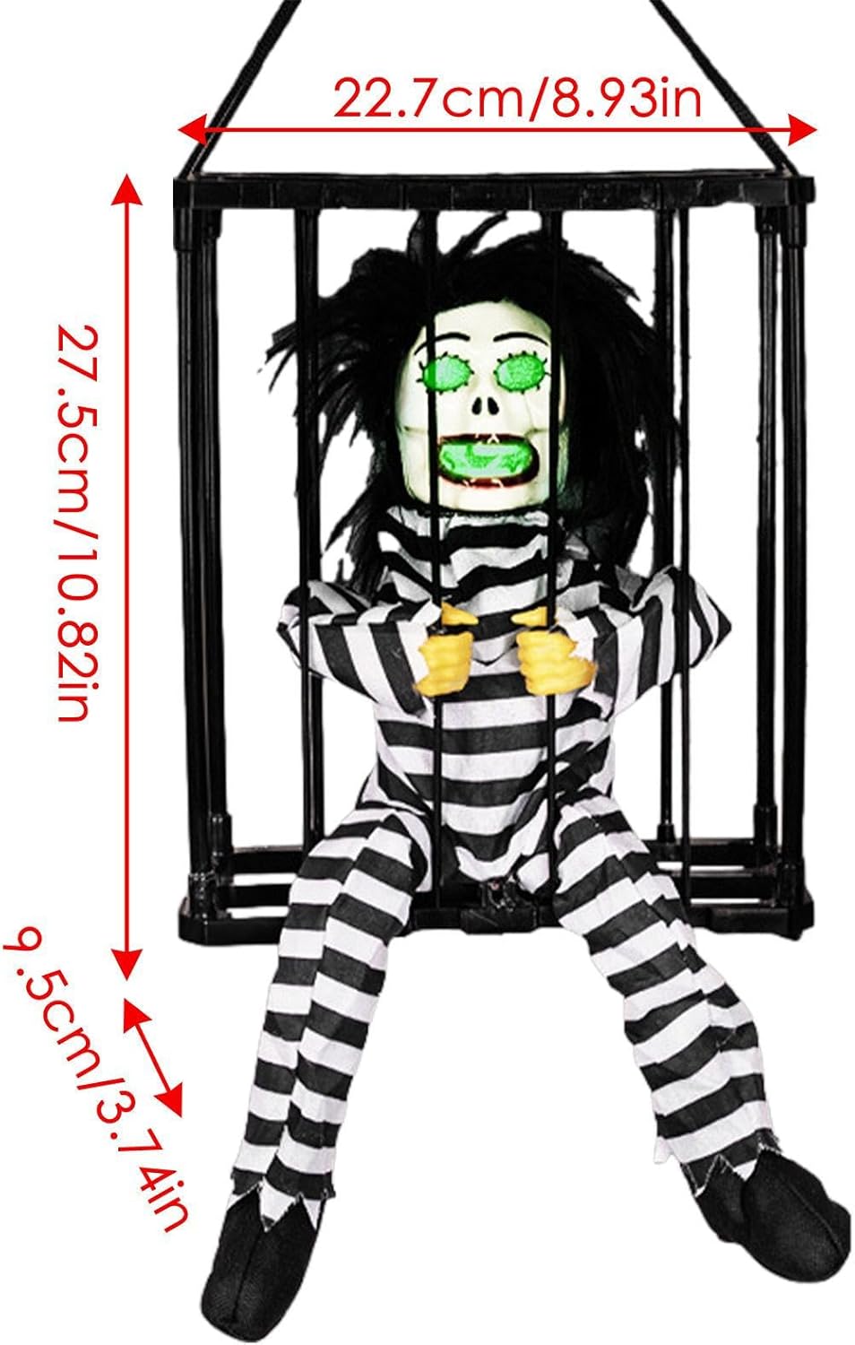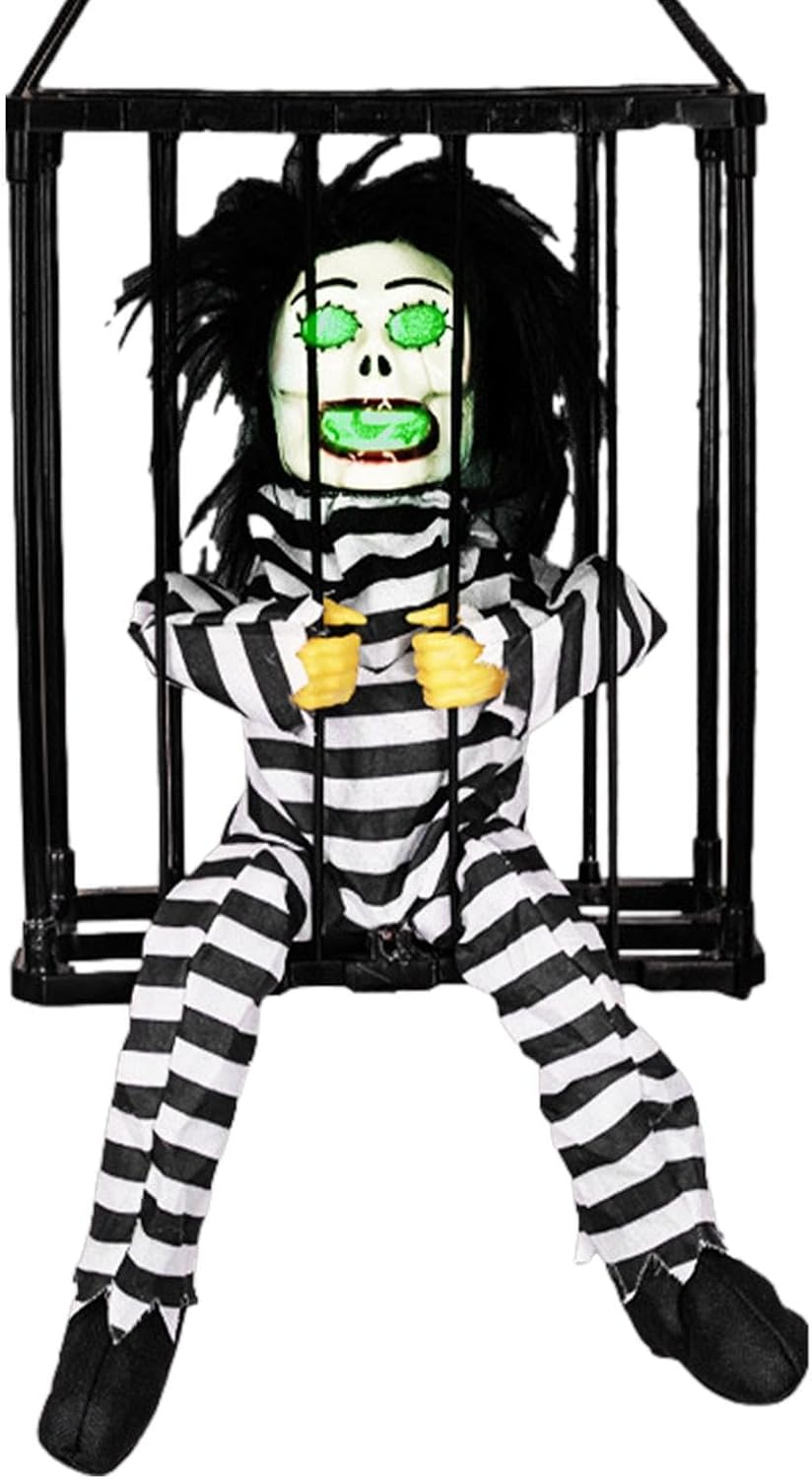 Creepy Captive: La nostra gabbia da prigioniero di Halloween presenta un prigioniero che grida "Portami!" mentre cerca freneticamente di scappare, aggiungendo un elemento spaventoso al tuo arredamento ossessionante e inviando brividi nella parte posteriore dei tuoi ospiti. Utilizzo versatile: questa gabbia per prigionieri di Halloween è perfetta per feste a tema di Halloween, serate di passaggio e decorazioni per la casa infestata. Spaventa i tuoi ospiti, imbroglioni e vicini. Effetto sonoro urlante: vivi un Halloween spaventoso con la nostra gabbia da prigioniero. I suoi occhi rossi e le urla terrificanti. Attiva il sensore semplicemente capovolgendo. Osserva la spina spaventosa del prigioniero perché rileva chiunque entro i 23,5 pollici. Materiale di alta qualità: la nostra gabbia per prigionieri di Halloween è realizzata in ABS + tessuto, che offre una durata e una resistenza all'usura incrollabili. L'assemblaggio è un gioco da ragazzi, perfetto per spaventare la tua festa di Halloween. Regalo decorativo: dona un tocco spettrale al tuo arredamento di Halloween con questa terrificante gabbia da prigioniero, un regalo perfetto per familiari e amici. Usalo per scioccare i tuoi ospiti, spaventare i tuoi vicini o creare un'atmosfera spaventosa.